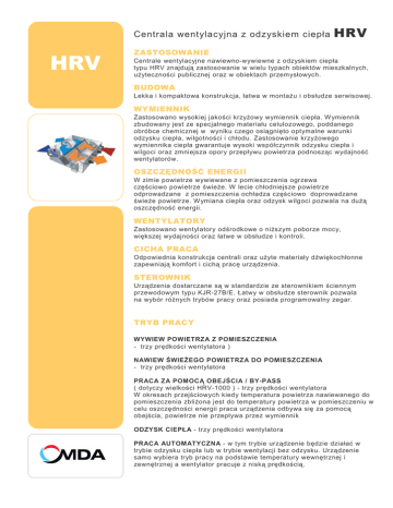 Centrala wentylacyjna z odzyskiem ciepła HRV HRV ZASTOSOWANIE Centrale wentylacyjne nawiewno-wywiewne z odzyskiem ciepła typu HRV znajdują zastosowanie w wielu typach obiektów mieszkalnych, uŜyteczności publicznej oraz w obiektach przemysłowych. BUDOWA Lekka i kompaktowa konstrukcja, łatwa w montaŜu i obsłudze serwisowej. WYMIENNIK Zastosowano wysokiej jakości krzyŜowy wymiennik ciepła. W ymiennik zbudowany jest ze specjalnego materiału celulozowego, poddanego obróbce chemicznej w wyniku czego osiągnięto optymalne warunki odzysku ciepła, wilgotności i chłodu. Zastosowanie krzyŜowego wymiennika ciepła gwarantuje wysoki współczynnik odzysku ciepła i wilgoci oraz zmniejsza opory przepływu powietrza podnosząc wydajność wentylatorów. OSZCZĘDNOŚĆ ENERGII W zimie powietrze wywiewane z pomieszczenia ogrzewa częściowo powietrze świeŜe. W lecie chłodniejsze powietrze odprowadzane z pomieszczenia ochładza częściowo doprowadzane świeŜe powietrze. W ymiana ciepła oraz odzysk wilgoci pozwala na duŜą oszczędność energii. WENTYLATORY Zastosowano wentylatory odśrodkowe o niŜszym poborze mocy, większej wydajności oraz łatwe w obsłudze i kontroli. CICHA PRACA Odpowiednia konstrukcja centrali oraz uŜyte materiały dźwiękochłonne zapewniają komfort i cichą pracę urządzenia. STEROWNIK Urządzenia dostarczane są w standardzie ze sterownikiem ściennym przewodowym typu KJR-27B/E. Łatwy w obsłudze sterownik pozwala na wybór róŜnych trybów pracy oraz posiada programowalny zegar. TRYB PRACY WYWIEW POWIETRZA Z POMIESZCZENIA - trzy prędkości wentylatora ) NAWIEW ŚWIEśEGO POWIETRZA DO POMIESZCZENIA - trzy prędkości wentylatora PRACA ZA POMOCĄ OBEJŚCIA / BY-PASS ( dotyczy wielkości HRV-1000 ) - trzy prędkości wentylatora W okresach przejściowych kiedy temperatura powietrza nawiewanego do pomieszczenia zbliŜona jest do temperatury powietrza w pomieszczeniu w celu oszczędności energii praca urządzenia odbywa się za pomocą obejścia, powietrze nie przepływa przez wymiennik ODZYSK CIEPŁA - trzy prędkości wentylatora PRACA AUTOMATYCZNA - w tym trybie urządzenie będzie działać w trybie odzysku ciepła lub w trybie wentylacji bez odzysku. Urządzenie samo wybiera tryb pracy na podstawie temperatury wewnętrznej i zewnętrznej a wentylator pracuje z niską prędkością. Centrala wentylacyjna z odzyskiem ciepła typu HRV - 1000 HRV - 1500 , HRV-2000 HRV KJR-27B/E DANE TECHNICZNE model HRV-1000 HRV-1500 HRV-2000 Wydatek powietrza m3/h 1000 1500 2000 Ciśnienie statyczne Pa 100 160 170 Sprawność temperaturowa-chłodzenie % 60 60 60 Sprawność temperaturowa-ogrzewanie % 70 70 70 Zasilanie 220V-1Ph-50Hz 380V-3Ph-50HZ 380V-3Ph-50HZ Pobór mocy W 360 900 1100 Pobór prądu A 2.4 3.2 3.6 dB(A) 40 51 53 kg 59 160 175 mm 1116×388×1134 1500×540×1200 1550×540×1400 Poziom ciśnienia akustycznego Waga Wymiary (szer.x wys.x głęb. ) Sterownik przewodowy KJR-27B/E
