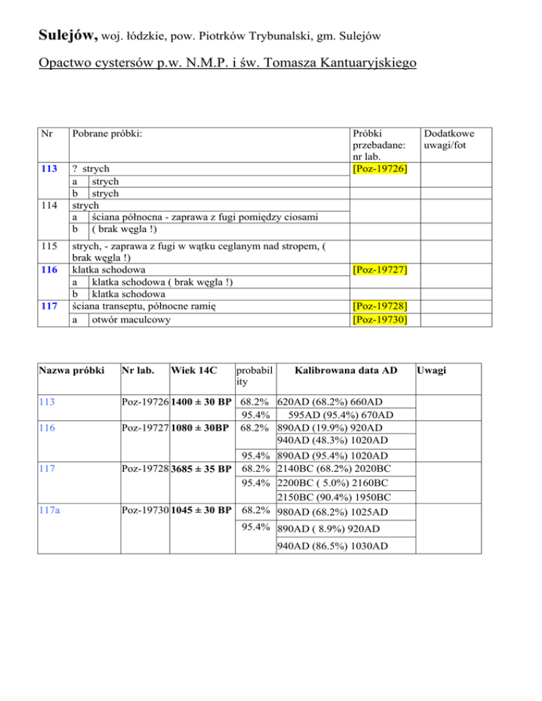 Sulejów, woj. łódzkie, pow. Piotrków Trybunalski, gm. Sulejów Opactwo cystersów p.w. N.M.P. i św. Tomasza Kantuaryjskiego Nr Pobrane próbki: 113 ? strych a strych b strych strych a ściana północna - zaprawa z fugi pomiędzy ciosami b ( brak węgla !) 114 115 116 117 strych, - zaprawa z fugi w wątku ceglanym nad stropem, ( brak węgla !) klatka schodowa a klatka schodowa ( brak węgla !) b klatka schodowa ściana transeptu, północne ramię a otwór maculcowy probabil ity [Poz-19728] [Poz-19730] Nr lab. 113 Poz-19726 1400 ± 30 BP 68.2% 620AD (68.2%) 660AD 95.4% 595AD (95.4%) 670AD Poz-19727 1080 ± 30BP 68.2% 890AD (19.9%) 920AD 940AD (48.3%) 1020AD 117 117a Dodatkowe uwagi/fot [Poz-19727] Nazwa próbki 116 Wiek 14C Próbki przebadane: nr lab. [Poz-19726] Kalibrowana data AD 95.4% 890AD (95.4%) 1020AD Poz-19728 3685 ± 35 BP 68.2% 2140BC (68.2%) 2020BC 95.4% 2200BC ( 5.0%) 2160BC 2150BC (90.4%) 1950BC Poz-19730 1045 ± 30 BP 68.2% 980AD (68.2%) 1025AD 95.4% 890AD ( 8.9%) 920AD 940AD (86.5%) 1030AD Uwagi