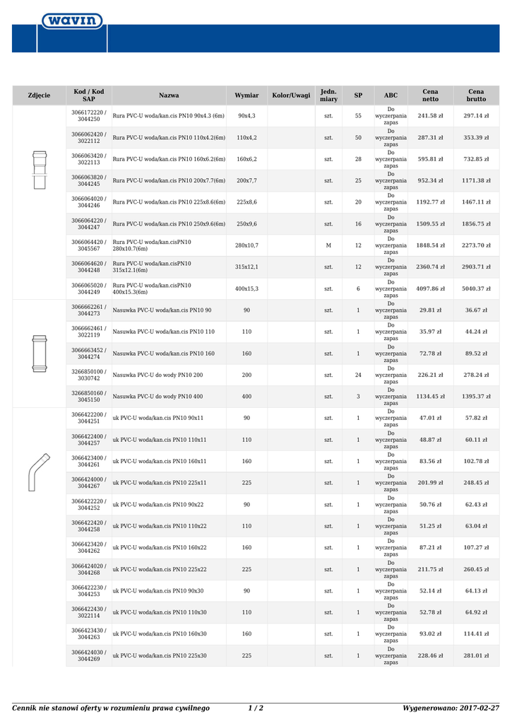 Zdjęcie Kod / Kod SAP Nazwa Wymiar Jedn. miary SP ABC Cena netto Cena brutto 3066172220 / 3044250 Rura PVC-U woda/kan.cis PN10 90x4.3 (6m) 90x4,3 szt. 55 Do wyczerpania zapas 241.58 zł 297.14 zł 3066062420 / 3022112 Rura PVC-U woda/kan.cis PN10 110x4.2(6m) 110x4,2 szt. 50 Do wyczerpania zapas 287.31 zł 353.39 zł 3066063420 / 3022113 Rura PVC-U woda/kan.cis PN10 160x6.2(6m) 160x6,2 szt. 28 Do wyczerpania zapas 595.81 zł 732.85 zł 3066063820 / 3044245 Rura PVC-U woda/kan.cis PN10 200x7.7(6m) 200x7,7 szt. 25 Do wyczerpania zapas 952.34 zł 1171.38 zł 3066064020 / 3044246 Rura PVC-U woda/kan.cis PN10 225x8.6(6m) 225x8,6 szt. 20 Do wyczerpania zapas 1192.77 zł 1467.11 zł 3066064220 / 3044247 Rura PVC-U woda/kan.cis PN10 250x9.6(6m) 250x9,6 szt. 16 Do wyczerpania zapas 1509.55 zł 1856.75 zł 3066064420 / 3045567 Rura PVC-U woda/kan.cisPN10 280x10.7(6m) 280x10,7 M 12 Do wyczerpania zapas 1848.54 zł 2273.70 zł 3066064620 / 3044248 Rura PVC-U woda/kan.cisPN10 315x12.1(6m) 315x12,1 szt. 12 Do wyczerpania zapas 2360.74 zł 2903.71 zł 3066065020 / 3044249 Rura PVC-U woda/kan.cisPN10 400x15.3(6m) 400x15,3 szt. 6 Do wyczerpania zapas 4097.86 zł 5040.37 zł 3066662261 / 3044273 Nasuwka PVC-U woda/kan.cis PN10 90 90 szt. 1 Do wyczerpania zapas 29.81 zł 36.67 zł 3066662461 / 3022119 Nasuwka PVC-U woda/kan.cis PN10 110 110 szt. 1 Do wyczerpania zapas 35.97 zł 44.24 zł 3066663452 / 3044274 Nasuwka PVC-U woda/kan.cis PN10 160 160 szt. 1 Do wyczerpania zapas 72.78 zł 89.52 zł 3266850100 / 3030742 Nasuwka PVC-U do wody PN10 200 200 szt. 24 Do wyczerpania zapas 226.21 zł 278.24 zł 3266850160 / 3045150 Nasuwka PVC-U do wody PN10 400 400 szt. 3 Do wyczerpania zapas 1134.45 zł 1395.37 zł 3066422200 / 3044251 uk PVC-U woda/kan.cis PN10 90x11 90 szt. 1 Do wyczerpania zapas 47.01 zł 57.82 zł 3066422400 / 3044257 uk PVC-U woda/kan.cis PN10 110x11 110 szt. 1 Do wyczerpania zapas 48.87 zł 60.11 zł 3066423400 / 3044261 uk PVC-U woda/kan.cis PN10 160x11 160 szt. 1 Do wyczerpania zapas 83.56 zł 102.78 zł 3066424000 / 3044267 uk PVC-U woda/kan.cis PN10 225x11 225 szt. 1 Do wyczerpania zapas 201.99 zł 248.45 zł 3066422220 / 3044252 uk PVC-U woda/kan.cis PN10 90x22 90 szt. 1 Do wyczerpania zapas 50.76 zł 62.43 zł 3066422420 / 3044258 uk PVC-U woda/kan.cis PN10 110x22 110 szt. 1 Do wyczerpania zapas 51.25 zł 63.04 zł 3066423420 / 3044262 uk PVC-U woda/kan.cis PN10 160x22 160 szt. 1 Do wyczerpania zapas 87.21 zł 107.27 zł 3066424020 / 3044268 uk PVC-U woda/kan.cis PN10 225x22 225 szt. 1 Do wyczerpania zapas 211.75 zł 260.45 zł 3066422230 / 3044253 uk PVC-U woda/kan.cis PN10 90x30 90 szt. 1 Do wyczerpania zapas 52.14 zł 64.13 zł 3066422430 / 3022114 uk PVC-U woda/kan.cis PN10 110x30 110 szt. 1 Do wyczerpania zapas 52.78 zł 64.92 zł 3066423430 / 3044263 uk PVC-U woda/kan.cis PN10 160x30 160 szt. 1 Do wyczerpania zapas 93.02 zł 114.41 zł 3066424030 / 3044269 uk PVC-U woda/kan.cis PN10 225x30 225 szt. 1 Do wyczerpania zapas 228.46 zł 281.01 zł Cennik nie stanowi oferty w rozumieniu prawa cywilnego 1/2 Kolor/Uwagi Wygenerowano: 2017-02-27 Zdjęcie Kod / Kod SAP Nazwa Wymiar Kolor/Uwagi Jedn. miary SP ABC Cena netto Cena brutto 3066422240 / 3044254 uk PVC-U woda/kan.cis PN10 90x45 90 szt. 1 Do wyczerpania zapas 52.13 zł 64.12 zł 3066422440 / 3044259 uk PVC-U woda/kan.cis PN10 110x45 110 szt. 1 Do wyczerpania zapas 54.40 zł 66.91 zł 3066423440 / 3044264 uk PVC-U woda/kan.cis PN10 160x45 160 szt. 1 Do wyczerpania zapas 104.83 zł 128.94 zł 3066424040 / 3044270 uk PVC-U woda/kan.cis PN10 225x45 225 szt. 1 Do wyczerpania zapas 246.45 zł 303.13 zł 3066422260 / 3044255 uk PVC-U woda/kan.cis PN10 90x60 90 szt. 1 Do wyczerpania zapas 48.83 zł 60.06 zł 3066422460 / 3022115 uk PVC-U woda/kan.cis PN10 110x60 110 szt. 1 Do wyczerpania zapas 53.07 zł 65.28 zł 3066423460 / 3044265 uk PVC-U woda/kan.cis PN10 160x60 160 szt. 1 Do wyczerpania zapas 133.50 zł 164.21 zł 3066424060 / 3044271 uk PVC-U woda/kan.cis PN10 225x60 225 szt. 1 Do wyczerpania zapas 311.68 zł 383.37 zł 3066422280 / 3044256 uk PVC-U woda/kan.cis PN10 90x90 90 szt. 1 Do wyczerpania zapas 55.48 zł 68.24 zł 3066422480 / 3044260 uk PVC-U woda/kan.cis PN10 110x90 110 szt. 1 Do wyczerpania zapas 62.84 zł 77.29 zł 3066423480 / 3044266 uk PVC-U woda/kan.cis PN10 160x90 160 szt. 1 Do wyczerpania zapas 156.88 zł 192.96 zł 3066424080 / 3044272 uk PVC-U woda/kan.cis PN10 225x90 225 szt. 1 Do wyczerpania zapas 312.91 zł 384.88 zł Cennik nie stanowi oferty w rozumieniu prawa cywilnego 2/2 Wygenerowano: 2017-02-27