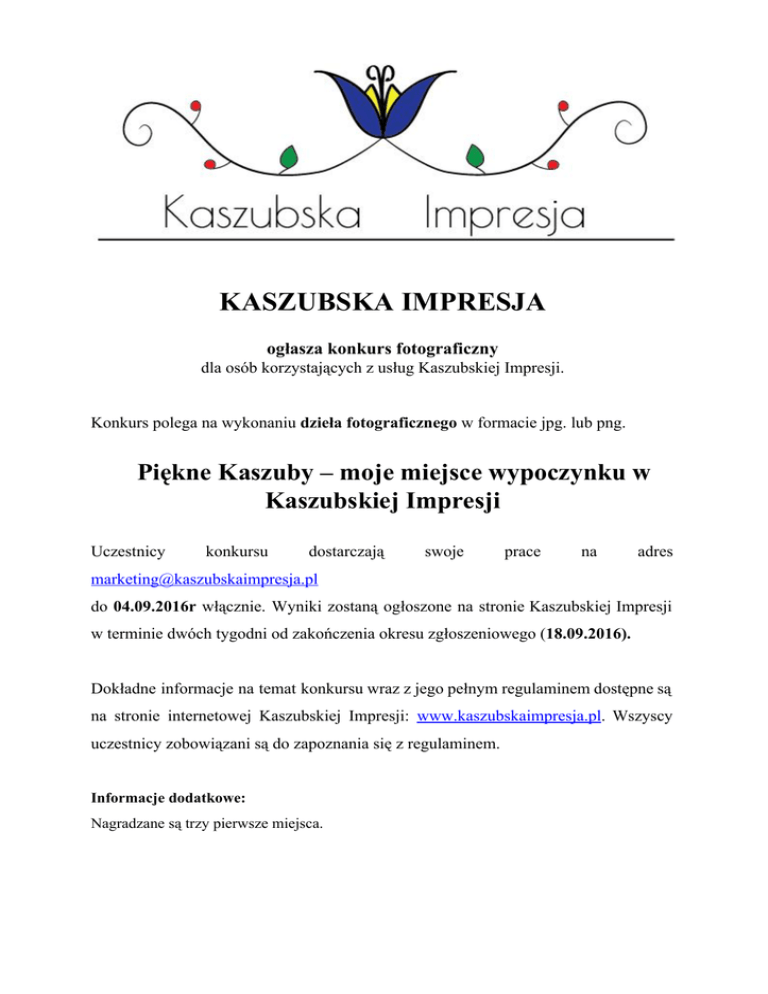 KASZUBSKA IMPRESJA ogłasza konkurs fotograficzny dla osób korzystających z usług Kaszubskiej Impresji. Konkurs polega na wykonaniu dzieła fotograficznego w formacie jpg. lub png. Piękne Kaszuby – moje miejsce wypoczynku w Kaszubskiej Impresji Uczestnicy konkursu dostarczają swoje prace na adres [email protected] do 04.09.2016r włącznie. Wyniki zostaną ogłoszone na stronie Kaszubskiej Impresji w terminie dwóch tygodni od zakończenia okresu zgłoszeniowego (18.09.2016). Dokładne informacje na temat konkursu wraz z jego pełnym regulaminem dostępne są na stronie internetowej Kaszubskiej Impresji: www.kaszubskaimpresja.pl. Wszyscy uczestnicy zobowiązani są do zapoznania się z regulaminem. Informacje dodatkowe: Nagradzane są trzy pierwsze miejsca. Prace konkursowe oceniane są przez trzyosobowe jury, które wyłoni laureatów w terminie czternastu dni od zakończenia napływania zgłoszeń. Aby praca mogła zostać oceniona, uczestnicy muszą ją dostarczyć na adres [email protected] Ważnym komponentem branym pod uwagę w ocenie dzieła będzie realizacja tematu konkursu. Liczymy tu szczególnie na pomysłowość uczestników. Konkurs ten opatrzony jest regulaminem, który stanowi podstawę w kwestii zobowiązań uczestników i organizatorów konkursu. Czas trwania konkursu: do 04.09.2016 Ogłoszenie wyników: 18.09.2016. REGULAMIN KONKURSU FOTOGRAFICZNEGO 1. 2. 1. 2. 3. I. Postanowienia ogólne § 1. Dokument ten, zwany dalej "Regulaminem", określa zasady i warunki przystąpienia do konkursu fotograficznego. Określenia użyte w Regulaminie należy rozumieć następująco: a. Organizator konkursu Kaszubska Impresja, adres korespondencyjny 81657 Gdynia, ul. Łączna 5, adres email: [email protected] , właściciel stron www.kaszubskaimpresja.pl , zwana dalej Organizatorem, b. Uczestnik lub autor – osoba, która uczestniczy w konkursie, c. Praca konkursowa – fotografia stworzona i nadesłana przez uczestnika, d. Laureat konkursu – osoba, której praca konkursowa została wyróżniona w konkursie, e. Jury – komisja w składzie trzyosobowym, oceniająca prace konkursowe, powołana przez Organizatora. II. Praca konkursowa § 2. Konkurs przeznaczony jest dla osób korzystających z usług Kaszubskiej Impresji Przedmiotem konkursu jest praca fotograficzna wykonana w formacie jpg lub png na z góry określony temat, tj. „Piękne Kaszuby – moje miejsce wypoczynku w Kaszubskiej Impresji”. Każdy z uczestników może nadesłać jedynie jedną pracę konkursową. 4. Konkurs trwa do 04.09.2016 § 3. 1. Autor składa oświadczenie, że: a. Wykonał pracę konkursową samodzielnie i we własnym zakresie, oraz że do wytworzenia pracy konkursowej nie wykorzystywał w sposób nieuprawniony praw autorskich osób trzecich, b. Posiada wyłączne prawa autorskie osobiste i majątkowe do całej pracy konkursowej, c. Żadna osoba trzecia nie posiada praw autorskich osobistych lub majątkowych do pracy konkursowej, d. Przenosi majątkowe prawa autorskie na organizatora konkursu, na wszystkich polach eksploatacji. 2. Autor składa oświadczenie o wyrażeniu zgody na przetwarzanie danych osobowych do celów związanych z konkursem. 3. W przypadku, gdy autor nie posiada pełnej zdolności do czynności prawnych, oświadczenia, o których mowa w ust. 1 i 2 składa w jego imieniu, jego opiekun prawny. §4. Praca konkursowa nie może naruszać prawa, dóbr osobistych lub moralności publicznej albo skutkować takim naruszeniem. § 5. Prace, które w swojej formie nie są zapisane w formacje jpg lub png zostają automatycznie usunięte z konkursu i jury w żadnym wypadku nie będzie rozpatrywać możliwości ich udziału. § 6. 1. Osobiste prawa autorskie do pracy konkursowej posiada tylko i wyłącznie jej autor. 2. Majątkowe prawa autorskie do pracy konkursowej posiada organizator konkursu. 3. Praca konkursowa może być wykorzystana do celów niezwiązanych z konkursem, bez pisemnej zgody autora lub jego opiekuna prawnego. III. Wysyłanie prac § 7. 1. Pracę konkursową należy dostarczyć w czasie trwania konkursu na adres wskazany w ogłoszeniu konkursu. 2. Wiadomość email lub koperta z pracą powinna zawierać dopisek „Konkurs Fotograficzny”. 3. Uczestnik powinien opatrzyć pracę załącznikiem, w którym wskaże imię i nazwisko, oraz powinien złożyć oświadczenia, o których mowa w § 3. 1. 2. 1. 2. 1. 2. 3. 4. 1. 2. 3. 1. 2. 3. 4. IV. Ocenianie § 8. Proces oceniania jest wewnętrzną dyskusją między członkami jury, mający na celu wyłonić trzy najlepsze prace. Jury dokonuje oceny prac i podejmuje ostateczną decyzję w terminie czternastu dni od dnia zakończenia przyjmowania prac. § 9. Prace oceniane są w dwóch etapach: a. Etap pierwszy: strona formalna – zapis fotografii w formacie jpg lub png b. Etap drugi: sposób realizacji tematu konkursu (pomysłowość, kreatywność). Warunkiem przejścia do drugiego etapu jest spełnienie wymogów oceny określonych w pierwszym etapie. V. Wyniki § 10. Wyniki konkursu zostaną ogłoszone na stronie Kaszubskiej Impresji z chwilą podjęcia ostatecznej decyzji przez jury. Laureaci konkursu zostaną poinformowani drogą elektroniczną o przyznanym wyróżnieniu w konkursie. Każdy niezadowolony z rozstrzygnięcia konkursu uczestnik może odwołać się elektronicznie lub pisemnie od decyzji jury do Organizatora w terminie siedmiu dni od ogłoszenia wyników. Ostateczne wyniki konkursu zostaną ogłoszone na stronie Kaszubskiej Impresji w terminie czternastu dni od ogłoszenia decyzji przez jury. § 11. Autorzy trzech najlepszych prac zostaną nagrodzeni. Nagrodę w konkursie stanowi prawo do skorzystania z kolejnej usługi Kaszubskiej Impresji z 15% (piętnastoprocentowym) upustem/rabatem dla autora i osób towarzyszących. Rabat będzie można wykorzystać w terminie od 19.09.2016 do 20.12.2016 VI. Postanowienia końcowe § 12. Jedyna i obowiązująca wersja Regulaminu zamieszczona jest na stronie internetowej 