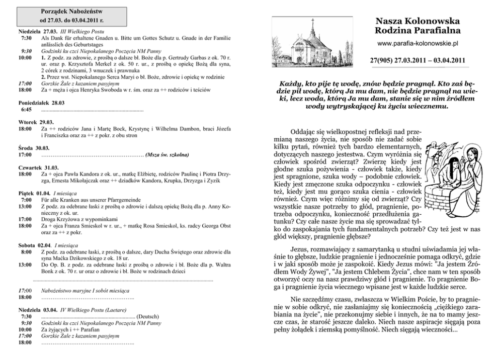 Porządek Nabożeństw od 27.03. do 03.04.2011 r. Niedziela 27.03. III Wielkiego Postu 7:30 Als Dank für erhaltene Gnaden u. Bitte um Gottes Schutz u. Gnade in der Familie anlässlich des Geburtstages 9:30 Godzinki ku czci Niepokalanego Poczęcia NM Panny 10:00 1. Z podz. za zdrowie, z prośbą o dalsze bł. Boże dla p. Gertrudy Garbas z ok. 70 r. ur. oraz p. Krzysztofa Merkel z ok. 50 r. ur., z prośbą o opiekę Bożą dla syna, 2 córek z rodzinami, 3 wnuczek i prawnuka 2. Przez wst. Niepokalanego Serca Maryi o bł. Boże, zdrowie i opiekę w rodzinie 17:00 Gorzkie Żale z kazaniem pasyjnym 18:00 Za + męża i ojca Henryka Swoboda w r. śm. oraz za ++ rodziców i teściów Poniedziałek 28.03 6:45 ......................................................................... Wtorek 29.03. 18:00 Za ++ rodziców Jana i Martę Bock, Krystynę i Wilhelma Dambon, braci Józefa i Franciszka oraz za ++ z pokr. z obu stron Środa 30.03. 17:00 ………………………………………………. (Msza św. szkolna) Czwartek 31.03. 18:00 Za + ojca Pawła Kandora z ok. ur., matkę Elżbietę, rodziców Paulinę i Piotra Drzyzga, Ernesta Mikołajczak oraz ++ dziadków Kandora, Krupka, Drzyzga i Zyzik Piątek 01.04. I miesiąca 7:00 Für alle Kranken aus unserer Pfarrgemeinde 13:00 Z podz. za odebrane łaski z prośbą o zdrowie i dalszą opiekę Bożą dla p. Anny Konieczny z ok. ur. 17:00 Droga Krzyżowa z wypominkami 18:00 Za + ojca Franza Smieskol w r. ur., + matkę Rosa Smieskol, ks. radcy Georga Obst oraz za ++ z pokr. Sobota 02.04. I miesiąca 8:00 Z podz. za odebrane łaski, z prośbą o dalsze, dary Ducha Świętego oraz zdrowie dla syna Maćka Dzikowskiego z ok. 18 ur. 13:00 Do Op. B. z podz. za odebrane łaski z prośbą o zdrowie i bł. Boże dla p. Waltra Bonk z ok. 70 r. ur oraz o zdrowie i bł. Boże w rodzinach dzieci 17:00 18:00 Nabożeństwo maryjne I sobót miesiąca ………………………………………….. Niedziela 03.04. IV Wielkiego Postu (Laetare) 7:30 ................................................................... (Deutsch) 9:30 Godzinki ku czci Niepokalanego Poczęcia NM Panny 10:00 Za żyjących i ++ Parafian 17:00 Gorzkie Żale z kazaniem pasyjnym 18:00 ………………………………………….. Nasza Kolonowska Rodzina Parafialna www.parafia-kolonowskie.pl 27(905) 27.03.2011 – 03.04.2011 Każdy, kto pije tę wodę, znów będzie pragnął. Kto zaś będzie pił wodę, którą Ja mu dam, nie będzie pragnął na wieki, lecz woda, którą Ja mu dam, stanie się w nim źródłem wody wytryskającej ku życiu wiecznemu. Oddając się wielkopostnej refleksji nad przemianą naszego życia, nie sposób nie zadać sobie kilku pytań, również tych bardzo elementarnych, dotyczących naszego jestestwa. Czym wyróżnia się człowiek spośród zwierząt? Zwierzę kiedy jest głodne szuka pożywienia - człowiek także, kiedy jest spragnione, szuka wody – podobnie człowiek. Kiedy jest zmęczone szuka odpoczynku - człowiek też, kiedy jest mu gorąco szuka cienia - człowiek również. Czym więc różnimy się od zwierząt? Czy wszystkie nasze potrzeby to głód, pragnienie, potrzeba odpoczynku, konieczność przedłużenia gatunku? Czy całe nasze życie ma się sprowadzać tylko do zaspokajania tych fundamentalnych potrzeb? Czy też jest w nas głód większy, pragnienie głębsze? Jezus, rozmawiający z samarytanką u studni uświadamia jej właśnie to głębsze, ludzkie pragnienie i jednocześnie pomaga odkryć, gdzie i w jaki sposób może je zaspokoić. Kiedy Jezus mówi: "Ja jestem Źródłem Wody Żywej", "Ja jestem Chlebem Życia", chce nam w ten sposób otworzyć oczy na nasz prawdziwy głód i pragnienie. To pragnienie Boga i pragnienie życia wiecznego wpisane jest w każde ludzkie serce. Nie szczędźmy czasu, zwłaszcza w Wielkim Poście, by to pragnienie w sobie odkryć, nie zasłaniajmy się koniecznością „ciężkiego zarabiania na życie”, nie przekonujmy siebie i innych, że na to mamy jeszcze czas, że starość jeszcze daleko. Niech nasze aspiracje sięgają poza pełny żołądek i ziemską pomyślność. Niech sięgają wieczności… Oblicze Jezusa Mieszkający na Sycylii mnich Epifaniusz pewnego dnia odkrył w sobie dar Pana: potrafił malować piękne ikony. Zapragnął namalować jedną, która stałaby się arcydziełem: zapragnął namalować oblicze Chrystusa. Lecz gdzie znaleźć odpowiedniego modela, zdolnego wyrazić równocześnie cierpienie i radość, śmierć i zmartwychwstanie, boskość i człowieczeństwo? Epifaniusz nie mógł zaznać już spokoju. Wyruszył w podróż, przemierzył Europę, obserwując każdą twarz. Niestety, nie istniało oblicze mogące przedstawiać Chrystusa. Pewnego wieczoru zasnął, powtarzając słowa psalmu: – Twego oblicza szukam, Panie. Nie ukrywaj przede mną Twego oblicza. Miał sen: anioł prowadził go do spotykanych osób i wskazywał na jeden szczegół, który czynił tę twarz podobną do Chrystusowej: radość młodej żony, niewinność dziecka, siłę wieśniaka, cierpienie chorego, strach skazańca, dobroć matki, przerażenie sieroty, surowość sędziego, wesołość kuglarza, miłosierdzie spowiednika, zabandażowane oblicze trędowatego. Epifaniusz powrócił do swego klasztoru i wziął się do pracy. Po roku ikona przedstawiająca Chrystusa była gotowa. Pokazał ją opatowi i współbraciom, którzy zdumieli się i rzucili na kolana. Oblicze Chrystusa było cudowne, wzruszające, stawiające pytania. Na próżno pytano Epifaniusza, kto posłużył mu za modela. Nie szukaj Chrystusa w obliczu jednego człowieka, ale w każdym człowieku szukaj fragmentu Chrystusowego oblicza. PAPIESKA INTENCJA OGÓLNA Aby Kościół, przez wiarygodne głoszenie Ewangelii, potrafił wciąż dawać następnym pokoleniom nowe powody dożycia i do nadziei PAPIESKA INTENCJA MISYJNA Aby misjonarze, głosząc Ewangelię i dając świadectwo życia, potrafili nieść Chrystusa tym,