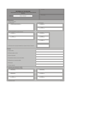 Nr wniosku INFORMACJE TECHNICZNE rozprowadzanie lub rozpowszechnianie programu drogą rozsiewczą satelitarną Data przyjęcia program radiowy / telewizyjny* A. Wnioskodawca A.1 Nazwa wnioskodawcy A.1.1 Osoba prawna A.1.2 Osoba fizyczna Nazwa w pełnym brzmieniu Nazwisko Imiona A.2 Osoba odpowiedzialna za sprawy techniczne Nazwisko Nr telefonu Imię Nr faksu email A.3 Planowany termin rozpoczęcia działalności po uzyskaniu koncesji w miesiącach B. Satelita B.1 Nazwa satelity B.2 Położenie satelity na orbicie B.3 Numer transpondera B.4 Częstotliwość środkowa w kierunku Ziemi [MHz] B.5 Maksymalna moc transpondera [dBW] B.6 Polaryzacja B.7 System nadawania C. Lokalizacja stacji dosyłowej do satelity C.1 Adres lokalizacji stacji dosyłowej do satelity Województwo Kod pocztowy Miejscowość Nr domu Ulica Nr lokalu * niepotrzebne skreślić str. 1 z 2 C.2 Współrzędne geograficzne w układzie 1942 ) )) E długość szerokość ) N )) D. Operator stacji dosyłowej do satelity D.1 Adres lokalizacji stacji dosyłowej do satelity D.2 Pozwolenie radiowe na używanie urządzeń nadawczych dla operatora Numer pozwolenia Data ważności Data wystawienia Nazwa organu, który wystawił pozwolenie E. Nośniki E.1 Nośnik, na którym program będzie archiwizowany u wnioskodawcy F. Wykaz dokumentów, które wnioskodawca jest obowiązany załączyć liczba załączników F.1 Umowa wstępna lub list intencyjny na wynajem transpondera F.2 Umowa wstępna z operatorem stacji dosyłowej F.3 Opis własnej, dzierżawionej lub planowanej bazy technicznej w tym wyposażenia: emisyjnego, produkcyjnego, reporterskiego, informatycznego i oprogramowania, transmisji i dosyłu programu oraz telekomunikacyjnego nie dotyczy rozprowadzania F.4 Opis własnej, dzierżawionej lub planowanej bazy technicznej dotyczy rozprowadzania E.5 Opis planów rozwojowych G. Inne dokumenty załączone do formularza liczba załączników G.1 G.2 G.3 G.4 G.5 G.6 G.7 G.8 G.9 G.10 Data wypełnienia wniosku Pieczęć Podpis str. 2 z 2