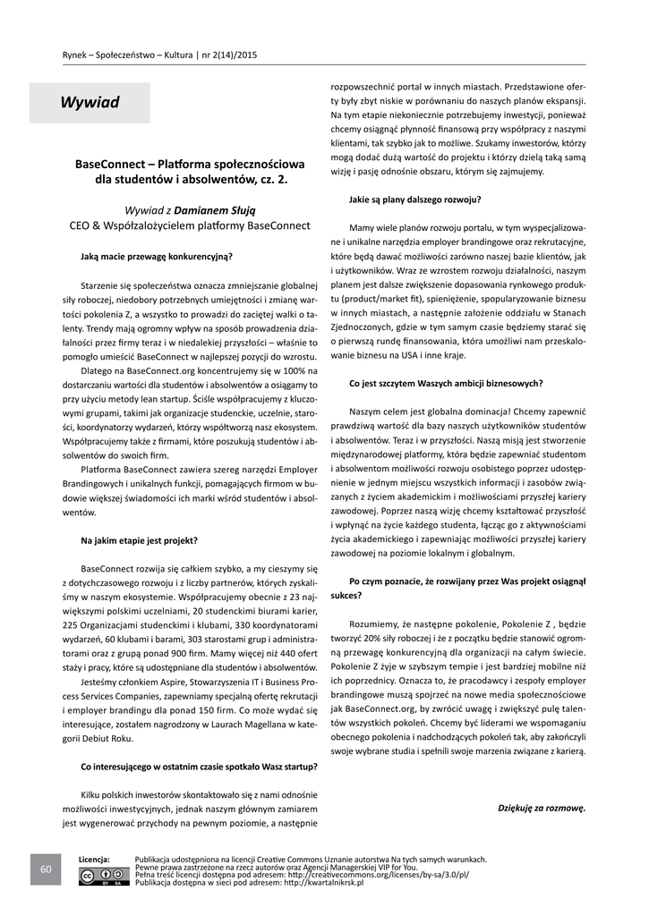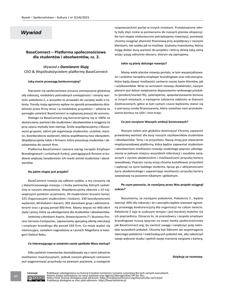 Rynek – Społeczeństwo – Kultura | nr 2(14)/2015 Wywiad BaseConnect – Platforma społecznościowa dla studentów i absolwentów, cz. 2. Wywiad z Damianem Słują CEO & Współzalożycielem platformy BaseConnect Jaką macie przewagę konkurencyjną? Starzenie się społeczeństwa oznacza zmniejszanie globalnej siły roboczej, niedobory potrzebnych umiejętności i zmianę wartości pokolenia Z, a wszystko to prowadzi do zaciętej walki o talenty. Trendy mają ogromny wpływ na sposób prowadzenia działalności przez firmy teraz i w niedalekiej przyszłości – właśnie to pomogło umieścić BaseConnect w najlepszej pozycji do wzrostu. Dlatego na BaseConnect.org koncentrujemy się w 100% na dostarczaniu wartości dla studentów i absolwentów a osiągamy to przy użyciu metody lean startup. Ściśle współpracujemy z kluczowymi grupami, takimi jak organizacje studenckie, uczelnie, starości, koordynatorzy wydarzeń, którzy współtworzą nasz ekosystem. Współpracujemy także z firmami, które poszukują studentów i absolwentów do swoich firm. Platforma BaseConnect zawiera szereg narzędzi Employer Brandingowych i unikalnych funkcji, pomagających firmom w budowie większej świadomości ich marki wśród studentów i absolwentów. Na jakim etapie jest projekt? BaseConnect rozwija się całkiem szybko, a my cieszymy się z dotychczasowego rozwoju i z liczby partnerów, których zyskaliśmy w naszym ekosystemie. Współpracujemy obecnie z 23 największymi polskimi uczelniami, 20 studenckimi biurami karier, 225 Organizacjami studenckimi i klubami, 330 koordynatorami wydarzeń, 60 klubami i barami, 303 starostami grup i administratorami oraz z grupą ponad 900 firm. Mamy więcej niż 440 ofert staży i pracy, które są udostępniane dla studentów i absolwentów. Jesteśmy członkiem Aspire, Stowarzyszenia IT i Business Process Services Companies, zapewniamy specjalną ofertę rekrutacji i employer brandingu dla ponad 150 firm. Co może wydać się interesujące, zostałem nagrodzony w Laurach Magellana w kategorii Debiut Roku. rozpowszechnić portal w innych miastach. Przedstawione oferty były zbyt niskie w porównaniu do naszych planów ekspansji. Na tym etapie niekoniecznie potrzebujemy inwestycji, ponieważ chcemy osiągnąć płynność finansową przy współpracy z naszymi klientami, tak szybko jak to możliwe. Szukamy inwestorów, którzy mogą dodać dużą wartość do projektu i którzy dzielą taką samą wizję i pasję odnośnie obszaru, którym się zajmujemy. Jakie są plany dalszego rozwoju? Mamy wiele planów rozwoju portalu, w tym wyspecjalizowane i unikalne narzędzia employer brandingowe oraz rekrutacyjne, które będą dawać możliwości zarówno naszej bazie klientów, jak i użytkowników. Wraz ze wzrostem rozwoju działalności, naszym planem jest dalsze zwiększenie dopasowania rynkowego produktu (product/market fit), spieniężenie, spopularyzowanie biznesu w innych miastach, a następnie założenie oddziału w Stanach Zjednoczonych, gdzie w tym samym czasie będziemy starać się o pierwszą rundę finansowania, która umożliwi nam przeskalowanie biznesu na USA i inne kraje. Co jest szczytem Waszych ambicji biznesowych? Naszym celem jest globalna dominacja! Chcemy zapewnić prawdziwą wartość dla bazy naszych użytkowników studentów i absolwentów. Teraz i w przyszłości. Naszą misją jest stworzenie międzynarodowej platformy, która będzie zapewniać studentom i absolwentom możliwości rozwoju osobistego poprzez udostępnienie w jednym miejscu wszystkich informacji i zasobów związanych z życiem akademickim i możliwościami przyszłej kariery zawodowej. Poprzez naszą wizję chcemy kształtować przyszłość i wpłynąć na życie każdego studenta, łącząc go z aktywnościami życia akademickiego i zapewniając możliwości przyszłej kariery zawodowej na poziomie lokalnym i globalnym. Po czym poznacie, że rozwijany przez Was projekt osiągnął sukces? Rozumiemy, że następne pokolenie, Pokolenie Z , będzie tworzyć 20% siły roboczej i że z początku będzie stanowić ogromną przewagę konkurencyjną dla organizacji na całym świecie. Pokolenie Z żyje w szybszym tempie i jest bardziej mobilne niż ich poprzednicy. Oznacza to, że pracodawcy i zespoły employer brandingowe muszą spojrzeć na nowe media społecznościowe jak BaseConnect.org, by zwrócić uwagę i zwiększyć pulę talentów wszystkich pokoleń. Chcemy być liderami we wspomaganiu obecnego pokolenia i nadchodzących pokoleń tak, aby zakończyli swoje wybrane studia i spełnili swoje marzenia związane z karierą. Co interesującego w ostatnim czasie spotkało Wasz startup? Kilku polskich inwestorów skontaktowało się z nami odnośnie możliwości inwestycyjnych, jednak naszym głównym zamiarem jest wygenerować przychody na pewnym poziomie, a następnie 60 Licencja: Publikacja udostępniona na licencji Creative Commons Uznanie autorstwa Na tych samych warunkach. Pewne prawa zastrzeżone na rzecz autorów oraz Agencji Managerskiej VIP for You. Pełna treść licencji dostępna pod adresem: http://creativecommons.org/licenses/by-sa/3.0/pl/ Publikacja dostępna w sieci pod adresem: http://kwartalnikrsk.pl Dziękuję za rozmowę.