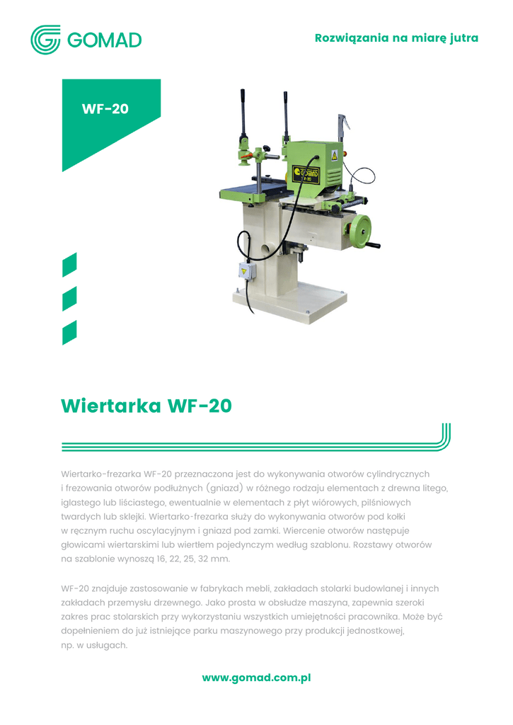 Rozwiązania na miarę jutra WF-20 Wiertarka WF-20 Wiertarko-frezarka WF-20 przeznaczona jest do wykonywania otworów cylindrycznych i frezowania otworów podłużnych (gniazd) w różnego rodzaju elementach z drewna litego, iglastego lub liściastego, ewentualnie w elementach z płyt wiórowych, pilśniowych twardych lub sklejki. Wiertarko‑frezarka służy do wykonywania otworów pod kołki w ręcznym ruchu oscylacyjnym i gniazd pod zamki. Wiercenie otworów następuje głowicami wiertarskimi lub wiertłem pojedynczym według szablonu. Rozstawy otworów na szablonie wynoszą 16, 22, 25, 32 mm. WF-20 znajduje zastosowanie w fabrykach mebli, zakładach stolarki budowlanej i innych zakładach przemysłu drzewnego. Jako prosta w obsłudze maszyna, zapewnia szeroki zakres prac stolarskich przy wykorzystaniu wszystkich umiejętności pracownika. Może być dopełnieniem do już istniejące parku maszynowego przy produkcji jednostkowej, np. w usługach. www.gomad.com.pl Rozwiązania na miarę jutra Dane techniczne MAKS. ŚREDNICA WIERCENIA I FREZOWANIA 20 MM NAJWIĘKSZA GŁĘBOKOŚĆ WIERCENIA 180 MM NAJWIĘKSZA DŁUGOŚĆ WIERCENIA 180 MM WYMIARY POWIERZCHNI STOŁU (DŁ. X SZER.) 280 X 600 MM NAJWIĘKSZA ODLEGŁOŚĆ OD POWIERZCHNI STOŁU OD OSI 130 MM WRZECIONA PRĘDKOŚĆ OBROTOWA WRZECIONA 2800 OBR./MIN. MOC SILNIKA 2,2 KW SKOK ROBOCZY STOŁU 100 MM ZAPOTRZEBOWANIE POWIETRZA DO SSAWY ODCIĄGU TROCIN 300-350 M3/H PRĘDKOŚĆ POWIETRZA W INSTALACJI ODCIĄGOWEJ 19-22 M/S ŚREDNICA PRZYŁĄCZENIOWA KOŃCÓWKI SSAWY 80 MM WYMIARY (DŁ. X SZER. X WYS.) 1240 X 800 X 1350 MM CIĘŻAR 350 KG WYPOSAŻENIE SPECJALNE GŁOWICE WIERTARSKIE 3 ÷ 13 WRZECIONOWE www.gomad.com.pl