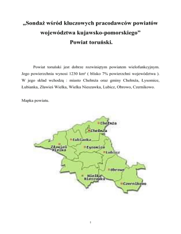 „SondaŜ wśród kluczowych pracodawców powiatów województwa kujawsko-pomorskiego” Powiat toruński. Powiat toruński jest dobrze rozwiniętym powiatem wielofunkcyjnym. Jego powierzchnia wynosi 1230 km² ( blisko 7% powierzchni województwa ). W jego skład wchodzą : miasto ChełmŜa oraz gminy ChełmŜa, Łysomice, Łubianka, Zławieś Wielka, Wielka Nieszawka, Lubicz, Obrowo, Czernikowo. Mapka powiatu. 1 Dane statystyczne donoszą, iŜ w 2007 roku ilość bezrobotnych na terenie powiatu toruńskiego zmniejszyła się o 2.119 osób tj. o 30,1%. Stopa bezrobocia na koniec marca 2008 wynosiła 18,6. Spadek bezrobocia odnotowano we wszystkich gminach powiatu toruńskiego. Największy spadek bezrobocia nastąpił w gminie Łysomice o 42,2%, gminie Łubianka o 37,6%, gminie ChełmŜa o 35,8%, z kolei najmniejszy spadek w gminach Czernikowo, Obrowo i Lubicz. W pierwszym kwartale 2008 roku liczba bezrobotnych nie uległa drastycznym zmianom. Na koniec kwietnia 2008 roku w Powiatowym Urzędzie Pracy dla Powiatu Toruńskiego zarejestrowanych było ogółem 4937 osób bezrobotnych, w tym 2816 kobiet. Najwięcej zarejestrowanych osób bezrobotnych – 1033 osoby to mieszkańcy miasta ChełmŜy, natomiast najmniej z tych osób zamieszkuje na terenie gminy Wielka Nieszawka – to liczba 199 osób, w tym 111 kobiet. Stan na koniec kwietnia 2008 obrazuje tabela 1. Tabela 1. BEZROBOTNI ZAREJESTROWANI W PUP DLA PT WG GMIN - STAN NA DZIEŃ 30.04.2008 BEZROBOTNI ZAREJESTROWANI W TYM: WYSZCZEGÓLNIENIE OGÓŁEM KOBIETY ZWOLNIENI Z PRZYCZYN ZAKLADU PRACY DOTYCHCZAS NIEPRACUJĄCY BEZROBOTNI Z PRAWEM DO ZASIŁU Miasto ChełmŜa 1033 537 11 147 207 Gmina ChełmŜa 503 258 4 90 99 Gmina Czernikowo 687 423 11 148 144 Gmina Lubicz 829 463 25 115 209 Gmina Łubianka 221 131 4 52 49 Gmina Łysomice 329 184 2 53 96 Gmina Obrowo 550 343 13 104 116 Gmina Wielka Nieszawka 199 111 9 21 58 Gmina Zławieś Wielka 586 366 15 109 125 RAZEM 4937 2816 94 839 1103 2 W strukturze bezrobocia grupy długotrwale bezrobotnych oraz bezrobotnych bez kwalifikacji zawodowych są nadal grupami dominującymi. Długotrwale bezrobotni to 57,7% ogółu zarejestrowanych, a bezrobotni bez kwalifikacji zawodowych to 32,6 % ogółu zarejestrowanych. Szczegółowe dane przedstawia tabela nr 2. Tabela 2. BEZROBOTNI W SZCZEGÓLNEJ SYTUACJI NA RYNKU PRACY ZAREJESTROWANI W PUP DLA PT - STAN NA DZIEŃ 30.04.2008 BEZROBOTNI ZAREJESTROWANI W KOŃCU MIESIĄCA SPRAWOZDAWCZEGO WYSZCZEGÓLNIENIE Osoby RAZEM KOBIETY Do 25 roku Ŝycia 968 536 Które ukończyły szkołę wyŜszą do 27 roku Ŝycia 27 17 Długotrwale bezrobotni 2 810 1 791 Kobiety, które nie podjęły zatrudnienia po urodzeniu dziecka 505 505 PowyŜej 50 roku Ŝycia 897 404 Bez kwalifikacji zawodowych 1 629 1 022 Bez doświadczenia zawodowego 1 130 709 Bez wykształcenia średniego 3 562 1 917 Samotnie wychowujący co najmniej jedno dziecko do 18 roku Ŝycia 380 350 Które po odbyciu kary pozbawienia wolności nie podjęły zatrudnienia 81 2 Niepełnosprawni 110 74 3 W miesiącu maju 2008 roku przeprowadzony został sondaŜ pracodawców na terenie powiatu toruńskiego. Jego głównym celem było zbadanie popytu na pracę. SondaŜ posłuŜył rozpoznaniu potrzeb pracodawców odnośnie kwalifikacji przyszłych pracowników. Dostarczył wiedzy na temat problemów związanych z rekrutacją kandydatów do pracy, źródeł pozyskiwania nowych pracowników. Zobrazował równieŜ stan zatrudnienia w wybranych firmach wg danych na dzień 31.03.2008r. oraz przewidywane zmiany w zatrudnieniu w 2008 roku. Pokazał takŜe oczekiwania zakładów wobec urzędu pracy, moŜliwości i zakres współpracy oraz obraz absolwentów i ich przygotowanie do wykonywania pracy. Próba badawcza objęła 30 pracodawców z terenu działania Powiatowego Urzędu Pracy dla Powiatu Toruńskiego. Ankiety przeprowadzono w 10 firmach z sektora publicznego oraz 20 z sektora prywatnego ( wykres 1.) , w tym w 12 firmach z branŜy przetwórstwa przemysłowego, 5 z administracji publicznej, 4 z nich zajmują się ochroną zdrowia i opieką społeczną, 3 budownictwem, 2 dotyczą branŜy handlowej, po jednej w rolnictwie, hotelach i restauracji, edukacji oraz działalności usługowej (tabela 3). NaleŜy równieŜ podkreślić, iŜ 6 firm z sektora prywatnego znajduje się na terenie Pomorskiej Specjalnej Strefy Ekonomicznej na terenie gminy Łysomice. Warto zauwaŜyć ten fakt, gdyŜ to PSSE w obecnej rzeczywistości odgrywa znacząca rolę w całej regionalnej gospodarce. Wykres 1. PODZIAŁ FIRM WEDŁUG SEKTORA WŁASNOŚCI 33% 67% publiczny prywatny 4 Tabela 3. SEKCJE SEKTORY sekcja firmy publiczny prywatny Rolnictwo, łowiectwo, leśnictwo 1 Rybactwo Górnictwo Przetwórstwo przemysłowe 12 Wytwarzanie i zaopatrywanie w energię elektryczną, gaz, wodę Budownictwo 3 Handel hurt. i detal., naprawa pojazdów samochodowych, motocykli oraz art. uŜytku osob. i dom. 2 Hotele i restauracje 1 Transport, gospodarka magazynowa i łączność Pośrednictwo finansowe Obsługa nieruchomości, wynajem i usługi zw. z prowadzeniem działalności gospodarczej Administracja publiczna i obrona narodowa: obowiązkowe ubezpieczenia społeczne i zdrowotne 5 Edukacja 1 Ochrona zdrowia i opieka społeczna 4 Działalność usługowa, komunalna, społeczna i indywidualna, pozostała 1 Gospodarstwa domowe zatrudniające pracowników Organizacje i zespoły eksterytorialne SUMA 10 20 Sytuacja zatrudnieniowa w 30 ankietowanych zakładach pracy na dzień 31.03.2008r. została przedstawiona w tabeli 4. Stan zatrudnienia w największym z zakładów wynosi 1914 osób, zaś w najmniejszym – 9. Ogólna liczba zatrudnionych pracowników w 30 zakładach wynosi 6651 osób, w tym liczba zatrudnionych kobiet to 3654, co stanowi 55% ogółu. Liczba pracowników zatrudnionych w ramach umowy o pracę to 6437 – 97%, natomiast w ramach innych umów ( m.in. umowy zlecenie) jest zatrudnionych 214 osób - 3%. Wśród 30 ankietowanych firm w 20 z nich planowane jest