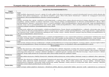Wymagania edukacyjne na poszczególne stopnie z matematyki - poziom podstawowy Klasa III a - rok szkolny 2016/17 RACHUNEK PRAWDOPODOBIEŃSTWA Stopień Dopuszczający Dostateczny Dobry Bardzo dobry Celujący Dopuszczający Dostateczny Dobry Bardzo dobry Uczeń: podaje przykłady eksperymentów losowych i zapisuje ich wyniki, podaje liczbę zdarzeń elementarnych w prostych doświadczeniach losowych, określa zdarzenia jako podzbiory zbioru zdarzeń elementarnych, w tym zdarzenie niemożliwe i pewne, oblicza liczbę zdarzeń elementarnych w zadaniach nie wymagających zastosowania kombinatoryki, oblicza prawdopodobieństwo zdarzenia w prostych przypadkach. Uczeń: analizuje i prezentuje dane, zapisuje i przedstawia wyniki eksperymentu za pomocą drzewa, opisuje zdarzenie przeciwne do danego zdarzenia losowego w prostych przypadkach, wykonuje działania na podanych zdarzeniach, stosuje klasyczną definicję prawdopodobieństwa od obliczania prawdopodobieństwa zdarzeń, oblicza prawdopodobieństwo zdarzenia z zastosowaniem drzewa w prostych przykładach, oblicza prawdopodobieństwo zdarzenia przeciwnego znając prawdopodobieństwo zdarzenia, stosuje wzór na prawdopodobieństwo sumy zdarzeń, podaje rozkład prawdopodobieństwa, oblicza prawdopodobieństwo zdarzenia przeciwnego, stosuje w prostych sytuacjach twierdzenie o prawdopodobieństwie sumy zdarzeń. Uczeń: rozwiązuje proste zadania typu wykaż/uzasadnij z rachunku prawdopodobieństwa, Stosuje własności prawdopodobieństwa w zadaniach, wykorzystuje sumę, iloczyn, różnicę zdarzeń do obliczania prawdopodobieństwa zdarzeń, rozwiązuje typowe zadania z rachunku prawdopodobieństwa, stosuje regułę mnożenia i regułę dodawania do wyznaczenia liczby wyników doświadczenia spełniających dany warunek, stosuje w bardziej złożonych sytuacjach klasyczną definicję prawdopodobieństwa do obliczania prawdopodobieństw zdarzeń losowych. Uczeń: rozwiązuje bardziej złożone zadania kombinatoryczne i z rachunku prawdopodobieństwa w tym z zastosowaniem permutacji z powtórzeniami i kombinacji (bez użycia tych pojęć), rozwiązuje zadania z rachunku prawdopodobieństwa typu wykaż/uzasadnij, dowodzi podstawowe własności prawdopodobieństwa, stosuje poznane wzory w zadaniach. stosuje własności prawdopodobieństwa do obliczania prawdopodobieństw zdarzeń, stosuje własności prawdopodobieństwa w dowodach twierdzeń Uczeń: stosuje poznane zależności dotyczące kombinatoryki i rachunku prawdopodobieństwa do rozwiązywania problemów, rozwiązuje zadania o znacznym stopniu trudności dotyczące prawdopodobieństwa, ilustruje doświadczenia wieloetapowe za pomocą drzewa i na tej podstawie oblicza prawdopodobieństwa zdarzeń. STATYSTYKA Uczeń: odczytuje dane statystyczne z tabel, diagramów, wykresów, porównuje dane w tabelach i diagramach, wyszukuje dane statystyczne, przedstawia dane w tabelach, na wykresie w układzie współrzędnych i na diagramach różnego typu, oblicza średnią arytmetyczną/ważoną i stosuje je w prostych zadaniach, oblicza medianę i dominantę skończonego zbioru danych oraz wariancję i odchylenie standardowe w zadaniach typowych, wykonuje proste obliczenia korzystając z danych zawartych w tabelach, diagramach. Stosuje regułę mnożenia do rozwiązywania zadań, oblicza średnią ważoną liczb z podanymi wagami. Uczeń: rozwiązuje zadania statystyczne o bardziej złożonej treści, interpretuje średnią arytmetyczną, ważoną, medianę i dominantę i stosuje je w zadaniach, zbiera i opracowuje. Uczeń: interpretuje dane statystyczne, posługuje się programami komputerowymi opracowując wyniki badań statystycznych, interpretuje wariancję i odchylenie standardowe, dokonuje analizy jakościowej danych statystycznych, argumentuje i wyciąga wnioski; oblicza średnią arytmetyczną, wyznacza medianę i dominantę danych przedstawionych na diagramie; wykorzystuje średnią arytmetyczną, medianę, dominantę i średnią ważoną do rozwiązywania zadań; oblicza wariancję i odchylenie standardowe zestawu danych przedstawionych na różne sposoby. Uczeń: potrafi rozwiązać zadanie projektowe statystyczne ( sformułować problem, planować, przeprowadzić badanie, opracować wyniki i zaprezentować je), rozwiązywać 1 Wymagania edukacyjne na poszczególne stopnie z matematyki - poziom podstawowy Celujący Dopuszczający Dostateczny Dobry Bardzo dobry Klasa III a - rok szkolny 2016/17 zadania statystyczne typu uzasadnij/wykaż. Uczeń: stosuje poznane zależności dotyczące statystyki do rozwiązywania problemów; porównuje odchylenie przeciętne z odchyleniem standardowym; rozwiązuje zadania o znacznym stopniu trudności dotyczące statystyki. STEREOMETRIA Uczeń: wskazuje na modelach i rysunkach wielościanów wierzchołki, krawędzie, ściany, krawędzie i ściany prostopadłe/równoległe, rozpoznaje graniastosłupy, klasyfikuje bryły, oblicza objętość i pole powierzchni graniastosłupa prostego w prostych przypadkach, rysuje przekątne ścian i przekątne graniastosłupa; stosuje twierdzenie Pitagorasa do obliczania długości odcinków, wskazuje na rysunkach i modelach przekątne wielościanów, wysokość i wysokości ścian bocznych, poprawnie operuje nazewnictwem: ściana, krawędź, graniastosłup prawidłowy, graniastosłup prosty, nazywa graniastosłupy, szkicuje podstawowe graniastosłupy, sprawnie rozwiązuje typowe zadania dotyczące sześcianu i prostopadłościanu, także z zastosowaniem przekątnej bryły, wskazuje w wielościanie rzut prostokątny danego odcinka na daną płaszczyznę; określa liczby ścian, wierzchołków i krawędzi wielościanu; wskazuje elementy charakterystyczne wielościanu (np. wierzchołek ostrosłupa); oblicza pola powierzchni bocznej i całkowitej graniastosłupa i ostrosłupa prostego; rysuje siatkę wielościanu na podstawie jej fragmentu; oblicza długości przekątnych graniastosłupa prostego; oblicza objętości graniastosł