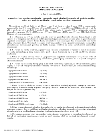 UCHWAŁA NR XIV/84/2015 RADY MIASTA BRZEZINY z dnia 15 września 2015 r. w sprawie wyboru metody ustalania opłaty za gospodarowanie odpadami komunalnymi, ustalenia stawki tej opłaty oraz ustalenia stawki opłaty za pojemnik o określonej pojemności Na podstawie art. 18 ust. 2 pkt 15, art. 40 ust. 1 i art. 41 ust. 1 ustawy z dnia 8 marca 1990 r. o samorządzie gminnym (Dz. U. z 2013 r. poz. 594, poz. 645, poz. 1318 oraz z 2014 r. poz. 379 i poz. 1072) i art. 6k ust. 1, ust. 2a pkt 1, ust. 3 oraz art. 6j ust. 1 pkt 1, ust. 3, 3b i 3c ustawy z dnia 13 września 1996 r. o utrzymaniu czystości i porządku w gminach (Dz. U. z 2013 r. poz. 1399 i poz. 1593 oraz z 2015 r. poz. 87 i poz. 122) Rada Miasta Brzeziny uchwala, co następuje: § 1. 1. Dokonuje się wyboru metody ustalenia opłaty za gospodarowanie odpadami komunalnymi w taki sposób, że w przypadku nieruchomości, na której zamieszkują mieszkańcy, miesięczna opłata za gospodarowanie odpadami komunalnymi stanowi iloczyn liczby mieszkańców zamieszkujących daną nieruchomość oraz stawki opłaty ustalonej w § 2. 2. Obowiązek ponoszenia opłaty za gospodarowanie odpadami komunalnymi w przypadku nieruchomości zamieszkałych powstaje za każdy miesiąc, w którym na danej nieruchomości zamieszkuje mieszkaniec. § 2. 1. Ustala się stawkę opłaty za gospodarowanie odpadami komunalnymi w wysokości 8,00 zł miesięcznie od osoby zamieszkującej daną nieruchomość, jeżeli odpady komunalne są w sposób selektywny zbierane i odbierane. 2. Ustala się wyższą stawkę opłaty za gospodarowanie odpadami komunalnymi w wysokości 13,00 zł miesięcznie od osoby zamieszkującej daną nieruchomość, jeżeli odpady komunalne nie są w sposób selektywny zbierane i odbierane. § 3. 1. Ustala się miesięczną stawkę opłaty za pojemnik o określonej pojemności, na odpady komunalne, jeżeli odpady są w sposób selektywny zbierane i odbierane od właścicieli nieruchomości, na których nie zamieszkują mieszkańcy: 1) pojemność 120 litrów -10,00 zł ; 2) pojemność 240 litrów -20,00 zł ; 3) pojemność 1100 litrów - 80,00 zł; 4) pojemność 5 000 litrów - 350,00 zł.; 5) pojemność 7000 litrów i więcej -500,00 zł ; 2. Ustala się wyższą miesięczną stawkę opłaty za pojemnik o określonej pojemności na odpady komunalne, jeżeli odpady komunalne nie są w sposób selektywny zbierane i odbierane od właścicieli nieruchomości, na których nie zamieszkują mieszkańcy: 1) pojemność 120 litrów -16,00 zł ; 2) pojemność 240 litrów -25,00 zł ; 3) pojemność 1100 litrów - 110,00 zł; 4) pojemność 5 000 litrów - 500,00 zł.; 5) pojemność 7000 litrów i więcej -700,00 zł . 3. Opłata za gospodarowanie odpadami komunalnymi w przypadku nieruchomości, na których nie zamieszkują mieszkańcy, stanowi iloczyn zadeklarowanej liczby pojemników z odpadami komunalnymi powstającymi na danej nieruchomości oraz stawki opłaty za pojemnik o określonej pojemności ustalonej w ust. 1 i 2. 4. Obowiązek ponoszenia opłaty za gospodarowanie odpadami komunalnymi w przypadku nieruchomości, na których nie zamieszkują mieszkańcy, powstaje za każdy miesiąc, w którym na danej nieruchomości powstały odpady. Id: 611ED99F-FDE0-4F98-AEB4-D22E9F9E7888. Podpisany Strona 1 § 4. 1. Ustala się ryczałtową stawkę opłaty za gospodarowanie odpadami komunalnymi dla nieruchomości, na których znajdują się domki letniskowe lub innych nieruchomości wykorzystywanych na cele rekreacyjnowypoczynkowe, wykorzystywanych jedynie przez część roku, jeżeli odpady są w sposób selektywny zbierane i odbierane - w wysokości 100,00 zł rocznie za jeden domek letniskowy lub inną nieruchomość wykorzystywaną na cele rekreacyjno-wypoczynkowe, wykorzystywaną jedynie przez część roku. 2. Ustala się ryczałtową stawkę opłaty za gospodarowanie odpadami komunalnymi dla nieruchomości, na których znajdują się domki letniskowe lub innych nieruchomości wykorzystywanych na cele rekreacyjnowypoczynkowe, wykorzystywanych jedynie przez część roku, jeżeli odpady nie są w sposób selektywny zbierane i odbierane - w wysokości 150,00 zł rocznie za jeden domek letniskowy lub inną nieruchomość wykorzystywaną na cele rekreacyjno-wypoczynkowe, wykorzystywaną jedynie przez część roku. § 5. Określenie wysokości opłaty ustalonej w § 2, 3 i 4 nastąpi na podstawie deklaracji o wysokości opłaty za gospodarowanie odpadami komunalnymi, której wzór zostanie określony odrębną uchwałą. § 6. Wykonanie uchwały powierza się Burmistrzowi Miasta Brzeziny. § 7. Traci moc uchwała Rady Miasta Brzeziny Nr VII/44/2015 z dnia 14 kwietnia 2015 r. w sprawie wyboru metody ustalania opłaty za gospodarowanie odpadami komunalnymi oraz ustalenia stawki tej opłaty (Dz. Urz. Woj. Łódzkiego poz. 1687). § 8. Uchwała wchodzi w życie po upływie 14 dni od dnia ogłoszenia w Dzienniku Urzędowym Województwa Łódzkiego, z mocą obowiązująca od dnia 1 stycznia 2016 r. Przewodniczący Rady Grzegorz Kędzia Id: 611ED99F-FDE0-4F98-AEB4-D22E9F9E7888. Podpisany Strona 2