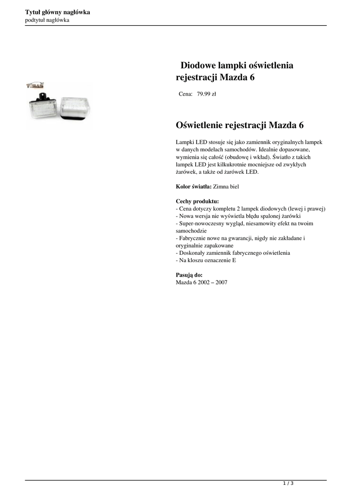 Tytuł główny nagłówka podtytuł nagłówka Diodowe lampki oświetlenia rejestracji Mazda 6 Cena: 79.99 zł Oświetlenie rejestracji Mazda 6 Lampki LED stosuje się jako zamiennik oryginalnych lampek w danych modelach samochodów. Idealnie dopasowane, wymienia się całość (obudowę i wkład). Światło z takich lampek LED jest kilkukrotnie mocniejsze od zwykłych żarówek, a także od żarówek LED. Kolor światła: Zimna biel Cechy produktu: - Cena dotyczy kompletu 2 lampek diodowych (lewej i prawej) - Nowa wersja nie wyświetla błędu spalonej żarówki - Super-nowoczesny wygląd, niesamowity efekt na twoim samochodzie - Fabrycznie nowe na gwarancji, nigdy nie zakładane i oryginalnie zapakowane - Doskonały zamiennik fabrycznego oświetlenia - Na kloszu oznaczenie E Pasują do: Mazda 6 2002 – 2007 1/3 Tytuł główny nagłówka podtytuł nagłówka 2/3 Tytuł główny nagłówka podtytuł nagłówka 3/3 Powered by TCPDF (www.tcpdf.org)