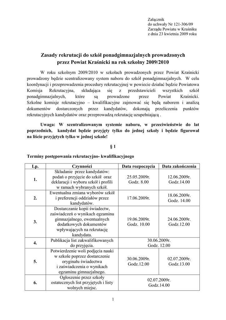 Załącznik do uchwały Nr 121-306/09 Zarządu Powiatu w Kraśniku z dnia 23 kwietnia 2009 roku Zasady rekrutacji do szkół ponadgimnazjalnych prowadzonych przez Powiat Kraśnicki na rok szkolny 2009/2010 W roku szkolnym 2009/2010 w szkołach prowadzonych przez Powiat Kraśnicki prowadzony będzie scentralizowany system naboru do szkół ponadgimnazjalnych. W celu koordynacji i przeprowadzenia procedury rekrutacyjnej w powiecie działać będzie Powiatowa z przedstawicieli wszystkich szkół Komisja Rekrutacyjna, składająca się ponadgimnazjalnych, które są prowadzone przez Powiat Kraśnicki. Szkolne komisje rekrutacyjno – kwalifikacyjne zajmować się będą naborem i analizą dokumentów dostarczonych przez kandydatów, dokonają przeliczenia punktów rekrutacyjnych kandydatów oraz przeprowadzą rekrutację uzupełniającą . Uwaga: W scentralizowanym systemie naboru, w przeciwieństwie do lat poprzednich, kandydat będzie przyjęty tylko do jednej szkoły i będzie figurował na liście przyjętych tylko w jednej szkole! §1 Terminy postępowania rekrutacyjno- kwalifikacyjnego Lp. 1. 2. 3. 4. 5. 6. Czynności Składanie przez kandydatów: podań o przyjęcie do szkół oraz deklaracji i wyboru szkół i profili w ramach wybranych szkół. Ewentualna zmiana wyborów szkół i preferencji oddziałów przez kandydatów. Dostarczanie kopii świadectw, zaświadczeń o wynikach egzaminu gimnazjalnego, ewentualnych dodatkowych dokumentów wpływających na rekrutację kandydata. Publikacja list zakwalifikowanych do przyjęcia. Potwierdzenie woli podjęcia nauki w szkole poprzez dostarczenie oryginału świadectwa i zaświadczenia o wynikach egzaminu gimnazjalnego. Ogłoszenie przez szkoły ostatecznych list przyjętych i listy wolnych miejsc. 1 Data rozpoczęcia Data zakończenia 25.05.2009r. Godz. 8.00 12.06.2009r. Godz.14.00 17.06.2009r. 18.06.2009r. Godz. 14.00 19.06.2009r. Godz. 10.00 24.06.2009r. Godz.12.00 30.06.2009r. Godz. 12.00 30.06.2009r. Godz.12.00 02.07.2009r. Godz.13.00 02.07.2009r. Godz.14.00 7. Rekrutacja uzupełniająca. 03.07.2009r. 8. Publikacja list przyjętych w wyniku rekrutacji uzupełniającej i listy wolnych miejsc. 07.07.2009r. Do godz.12.00 07.07.2009r. Od godz.12.00 §2 O przyjęcie do klasy pierwszej szkoły ponadgimnazjalnej: liceum ogólnokształcącego, liceum profilowanego, technikum i zasadniczej szkoły zawodowej mogą ubiegać się absolwenci gimnazjów. 1. Kandydaci do szkół prowadzących kształcenie zawodowe winni wraz z innymi dokumentami dostarczyć zaświadczenie lekarskie o braku przeciwwskazań medycznych do kształcenia w danym zawodzie. 2. Kandydaci do szkół i klas sportowych oraz szkół mistrzostwa sportowego powinni posiadać: 1) bardzo dobry stan zdrowia, potwierdzony zaświadczeniem lekarskim wydanym przez lekarza specjalistę w dziedzinie medycyny sportowej lub innego uprawnionego lekarza, zgodnie z odrębnymi przepisami, 2) zaliczenie ustalonych przez szkolną komisję rekrutacyjno-kwalifikacyjną lub trenera albo instruktora prób sprawności fizycznej, a w przypadku kandydatów do szkół mistrzostwa sportowego – zaliczenie prób sprawności fizycznej zatwierdzonych przez polskie związki sportowe współpracujące z daną szkołą, 3) pisemną zgodę rodziców (prawnych opiekunów). 3. Skierowanie na badania lekarskie kandydat otrzymuje przy złoŜeniu podania. §3 1. Laureaci i finaliści ogólnopolskich olimpiad przedmiotowych oraz laureaci konkursów o zasięgu wojewódzkim i ponadwojewódzkim, których program obejmuje w całości lub poszerza treści podstawy programowej co najmniej jednego przedmiotu, przyjmowani są do wybranej szkoły ponadgimnazjalnej, wybranego oddziału niezaleŜnie od kryteriów, o których mowa poniŜej. 2. O kolejności przyjęć kandydatów do klasy pierwszej szkół ponadgimnazjalnych decyduje liczba uzyskanych przez nich punktów rekrutacyjnych. 3. Przy ustaleniu liczby punktów osiąganych przez kandydatów brane są pod uwagę następujące kryteria: 1) oceny uzyskane na świadectwie ukończenia gimnazjum z 4 przedmiotów obowiązkowych wg poniŜszej tabeli: Szkoła Przedmioty wspólne dla wszystkich profili kształcenia uwzględniane do punktacji 1. Język polski Profil kształcenia/zawód ( przedmioty realizowane w rozszerzonym zakresie ) Matematyka – Fizyka 2 Przedmioty związane z profilem kształcenia uwzględniane do punktacji Fizyka I Liceum Ogólnokształcące im. Tadeusza Kościuszki w Kraśniku ul. Armii Krajowej 25 23-200 Kraśnik 2. Język obcy nowoŜytny realizowany jako przedmiot obowiązkowy 3. Matematyka II Liceum Ogólnokształcące im Mikołaja Reja w Kraśniku ul. Wł. Sikorskiego 25 23-210 Kraśnik 1. Język polski 2. Język obcy nowoŜytny realizowany jako przedmiot obowiązkowy 3. Matematyka III Liceum Ogólnokształcące w Zespole Szkół Nr 3 w Kraśniku ul. Słowackiego 7 23-210 Kraśnik 1. Język polski 2. Matematyka 3. Geografia 4. Język obcy nowoŜytny Technikum Nr 3 w Zespole Szkół Nr 3 w Kraśniku ul. Słowackiego 7 23-210 Kraśnik 1. Język polski 2. Matematyka 3. Geografia 4. Język obcy nowoŜytny Zasadnicza Szkoła Zawodowa Nr 2 w Zespole Szkół Nr 3 w Kraśniku ul. Słowackiego 7 23-210 Kraśnik 1. Język polski 2. Matematyka 3. Geografia 4. Język obcy nowoŜytny realizowany jako przedmiot obowiązkowy Matematyka – Fizyka Matematyka – Informatyka Biologia – Chemia Matematyka – Język angielski Język polski – Historia Język polski – Historia – WOS Język polski – Historia Matematyka – Fizyka Informatyka – Matematyka Biologia – Chemia Biologia – Chemia – Fizyka WOS – Historia Język polski – Historia Matematyka – Fizyka Informatyka Język polski – Historia – Język angielski Informatyka – Język angielski – Matematyka Język angielski – Biologia dotyczy SMS LO Fizyka Informatyka Biologia Historia Historia Historia Historia Fizyka Informatyka Biologia Biologia Historia Historia Fizyka Technik ochrony środ