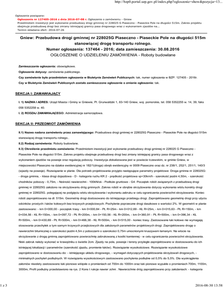 OGŁOSZENIE O UDZIELENIU ZAMÓWIENIA z dnia 30.08.2016 r.