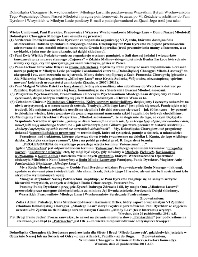 Dolnośląska Chorągiew [b. wychowanków] Młodego Lasu, śle pozdrowienia Wszystkim Byłym Wychowankom Tego Wspaniałego Domu Naszej Młodości i pragnie poinformować, że zaraz po VI Zjeździe wysłaliśmy do Pani Dyrektor i Wszystkich w Młodym Lesie poniższy E-mail z podziękowaniami za Zjazd. Jego treść jest taka: Wielce Umiłowani, Pani Dyrektor, Pracownicy i Wszyscy Wychowankowie Młodego Lasu – Domu Naszej Młodości! Dolnośląska Chorągiew Młodego Lasu ośmiela się przesłać: (1) Serdecznie Podziękowanie Pani Dyrektor za wspaniała organizację VI Zjazdu, któremu dostojna Sala Mieszczańska Ratusza splendoru niezwykłego dodała. Dziękujemy tez Pani Dyrektor za piękne przemówienie adresowane do nas, notabli miasta i samorządu Grodu Kopernika (treść przemówienia mamy z Internetu, a za szybkość, z jaka ono się tam ukazało, też dzięki składamy), (2) Pani Ewie Wielkie Podziękowanie za organizację wystawy pamiątek w Sali dawnej jadalni i wieczorków tanecznych przy muzyce słynnego „Cajmera” – Zdzisia Malinowskiego i pieśniach Benka Tarko, o których nie wiemy czy żyją, czy też spoczywają już snem wiecznym, gdzieś w Polsce. (3) Panu Jackowi Stokrotne Dzięki za stronę internetową. Będziemy Panu przesyłać nasze wspomnienia o czasach naszego pobytu w Młodym Lesie po wojnie i wiadomości z terenu „Dolnośląskiej Chorągwi Młodo-Lasowej” do akceptacji i ew. zamieszczenia na tej stronie. Mamy dobra współpracę z Zach-Pomorska Chorągwią (głownie z Alą Miziarską-Maziarz, pionierką „Mlodego Lasu” oraz Krysią Sudecką-Wójtowicz, niezastapioną ‘spiritus movens’ kolejnych uroczystości zamknięcia Zjazdu, w 2007 i 2011). (4) Pani Małgosi Wielkie Dzięki za bazę danych, którą otrzymaliśmy nim zdołaliśmy do Wrocławia dotrzeć po Zjeździe. Będziemy korzystali z tej bazy, komunikując się z Siostrami i Braćmi Młodo-Lasowymi. (5) Wszystkim Wychowawcom, Pracownikom i Obecnym Wychowankom Młodego Lasu dziękujemy za trud i życzliwość, dzięki którym czuliśmy się jak w Domu Rodzinnym - Chwała Wam za to. (6) Członkom Chóru, z Najmłodszą Chórzystką, Która wszyscy podziwialiśmy, dziękujemy i życzymy sukcesów na niwie artystycznej, a w nauce samych szóstek. Tradycją „Młodego Lasu” jest pilnie się uczyć. Pamiętajcie o tej tradycji. My najstarsze pokolenie uczyliśmy się pilnie i do dziś staramy się uczyć – jak 60 lat temu – by poznać te dziedziny wiedzy, które pozostawały poza programami nauczania szkół i uczelni, do których chodziliśmy. (7) Meldujemy Pani Dyrektor i Wszystkim „Młodo-Lasowianom”, że analogicznie do tego, co czyni Brytyjska Wspólnota Narodów w sprawie „zmiany w Akcie Sukcesji na tronie tak, by sukcesją były objęte pierworodne córki, nawet jeśli mają młodszego brata”, bo – jak oświadczyła pani Gillard (pierwsza premier w historii Australii) – „kobiety i mężczyźni są sobie równi we wszystkich dziedzinach” – My, Dolnośląska Chorągiew, też pragniemy dokonać ‘kopernikańskiego przewrotu’ w terminologii, która od tysiącleci, panuje w świecie, a mianowicie: Pracujemy nad traktatem, którego pierwsze słowa tytułu (wzorowane na dziełku I. Kanta, do jego wielkiego dzieła: „Krytyka czystego rozumu”, które na polski przełożył prof. R. Ingarden) brzmią: „PROLEGOMENA do wszelkiego przyszłego użycia terminu ‘Patriarchini’ . . .” (gdzie ‘Patriarchini’ jest odpowiednikiem terminu ‘Patriarcha’, będącego synonimem terminów: ‘czcigodny starzec’, ‘najstarszy z mistrzów’ etc), by mógł być użyty, gdy mówimy o Młodych, Pięknych, Doskonałych w Działaniu, o Głosie Anioła i nosicielek wielu innych atrybutów, którymi Wszechszczodra Opatrzność obdarzyła Miłościwie Nam (którzyśmy z Rodu Młodo-Lasowego) Panującą, Panią Dyrektor, Magister Anię Patriarchinię Wspólnoty „Młodego Lasu” . My z Rodu Młodo-Lasowego, w Osobie Pani Dyrektor widzimy Przywódczynię Rodu Naszego – jak ongi, zgodnie ze słowami pism świętych byli: Abraham, Izaak, Jakub i jego 12 synów, ale oni nie byli nosicielami tylu atrybutów wymienionych wyżej. Mnogość atrybutów Naszej Patriarchini implikuje, że Pani Dyrektor znajduje się na samym szczycie hierarchii wszystkich, znanych w dziejach Rodu Człowieczego, Patriarchów. Prosimy Panią Dyrektor o przyjęcie Życzeń Dobrego Zdrowia i Sił, by mogła Ona „Młodemu Lasowi” przewodzić przez następne dziesięciolecia, a za minione Jej Dwudziestolecie, Serdecznie Dzięki składamy. Wszystkich Pracowników Młodego Lasu i Wychowanków Serdecznie Pozdrawiamy. Z poważaniem: Zofia i Adam Piskalscy, Irena Strzelewicz-Fiszer i Kazimierz Orlicz, który raport o wspaniałym VI Zjeździe członkom Dolnośląskiej Chorągwi „Młodego Lasu” złożył i wydruk przemówienia Pani Dyrektor ze zdjęciem uczestników Zjazdu na tle bliskiego sercom naszym Gmachu „Młody Las” (też z Internetu) wręczył. Wrocław, dnia 26 października 2011 A.D. P.S. Drogi Panie Jacku! Proszę zauważyć, że nawet na ekranie monitora słowo „Patriarchini” jest podkreślone na czerwono jako błąd (a „Patriarcha” jest OK.) – to wielka niesprawiedliwość od tysiącleci trwająca! Dolnośląska Chorągiew śle Serdeczne pozdrowienia dla Sióstr i Braci ‘Młodo Lasowych’, gdziekolwiek jesteście w Ojczyźnie Naszej lub na Świecie od Odry - przez Atlantyk, Pacyfik - aż do Bugu. Z poważaniem, W imieniu Chorągwi - Kazimierz Orlicz (sekretarz komendy). Wrocław, dnia 29 października 2011 A.D.