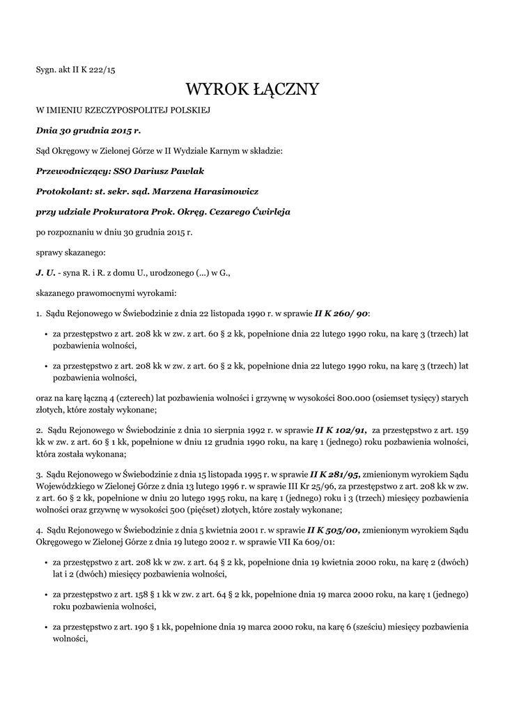 Sygn. akt II K 222/15 WYROK ŁĄCZNY W IMIENIU RZECZYPOSPOLITEJ POLSKIEJ Dnia 30 grudnia 2015 r. Sąd Okręgowy w Zielonej Górze w II Wydziale Karnym w składzie: Przewodniczący: SSO Dariusz Pawlak Protokolant: st. sekr. sąd. Marzena Harasimowicz przy udziale Prokuratora Prok. Okręg. Cezarego Ćwirleja po rozpoznaniu w dniu 30 grudnia 2015 r. sprawy skazanego: J. U. - syna R. i R. z domu U., urodzonego (...) w G., skazanego prawomocnymi wyrokami: 1. Sądu Rejonowego w Świebodzinie z dnia 22 listopada 1990 r. w sprawie II K 260/ 90: • za przestępstwo z art. 208 kk w zw. z art. 60 § 2 kk, popełnione dnia 22 lutego 1990 roku, na karę 3 (trzech) lat pozbawienia wolności, • za przestępstwo z art. 208 kk w zw. z art. 60 § 2 kk, popełnione dnia 22 lutego 1990 roku, na karę 3 (trzech) lat pozbawienia wolności, oraz na karę łączną 4 (czterech) lat pozbawienia wolności i grzywnę w wysokości 800.000 (osiemset tysięcy) starych złotych, które zostały wykonane; 2. Sądu Rejonowego w Świebodzinie z dnia 10 sierpnia 1992 r. w sprawie II K 102/91, za przestępstwo z art. 159 kk w zw. z art. 60 § 1 kk, popełnione w dniu 12 grudnia 1990 roku, na karę 1 (jednego) roku pozbawienia wolności, która została wykonana; 3. Sądu Rejonowego w Świebodzinie z dnia 15 listopada 1995 r. w sprawie II K 281/95, zmienionym wyrokiem Sądu Wojewódzkiego w Zielonej Górze z dnia 13 lutego 1996 r. w sprawie III Kr 25/96, za przestępstwo z art. 208 kk w zw. z art. 60 § 2 kk, popełnione w dniu 20 lutego 1995 roku, na karę 1 (jednego) roku i 3 (trzech) miesięcy pozbawienia wolności oraz grzywnę w wysokości 500 (pięćset) złotych, które zostały wykonane; 4. Sądu Rejonowego w Świebodzinie z dnia 5 kwietnia 2001 r. w sprawie II K 505/00, zmienionym wyrokiem Sądu Okręgowego w Zielonej Górze z dnia 19 lutego 2002 r. w sprawie VII Ka 609/01: • za przestępstwo z art. 208 kk w zw. z art. 64 § 2 kk, popełnione dnia 19 kwietnia 2000 roku, na karę 2 (dwóch) lat i 2 (dwóch) miesięcy pozbawienia wolności, • za przestępstwo z art. 158 § 1 kk w zw. z art. 64 § 2 kk, popełnione dnia 19 marca 2000 roku, na karę 1 (jednego) roku pozbawienia wolności, • za przestępstwo z art. 190 § 1 kk, popełnione dnia 19 marca 2000 roku, na karę 6 (sześciu) miesięcy pozbawienia wolności, oraz na karę łączną 2 (dwóch) lat i 4 (czterech) miesięcy pozbawienia wolności; 5. Sądu Okręgowego w Zielonej Górze z dnia 17 stycznia 2002 r. w sprawie II K 137/01, utrzymanym w mocy wyrokiem Sądu Apelacyjnego w Poznaniu z dnia 9 maja 2002 r. w sprawie II AKa 222/02, za przestępstwo z art. 159 kk w zw. z art. 64 § 2 kk, popełnione w dniu 16 czerwca 1999 roku, na karę 1 (jednego) roku pozbawienia wolności, A. przy czym kary pozbawienia wolności orzeczone wyrokami wymienionymi wyżej w punktach 4 i 5 połączono wyrokiem łącznym Sądu Okręgowego w Zielonej Górze z dnia 27 czerwca 2002 r. w sprawie II K 118/02, orzekając karę łączną 3 (trzech) lat pozbawienia wolności, która została wykonana; 6. Sądu Rejonowego w Zielonej Górze z dnia 17 grudnia 2003 r. w sprawie II K 1778/03, utrzymanym w mocy wyrokiem Sądu Okręgowego w Zielonej Górze z dnia 27 maja 2004 r. w sprawie VII Ka 358/04, za przestępstwo z art. 48 ust. 1 ustawy z dnia 24.04.1997 r. o przeciwdziałaniu narkomanii w zw. z art. 31 § 2 kk, popełnione w dniu 23 sierpnia 2003 roku, na karę 1 (jednego) roku i 2 (dwóch) miesięcy pozbawienia wolności, która została wykonana; 7. Sądu Rejonowego w Świebodzinie z dnia 13 września 2004 r. w sprawie II K 424/04, za przestępstwo z art. 46 ust. 1 i art. 48 ust. 1 ustawy z dnia 24.04.1997 r. o przeciwdziałaniu narkomanii, popełnione w dniach 7 i 9 marca 2004 roku, na karę 2 (dwóch) lat i 3 (trzech) miesięcy pozbawienia wolności; 8. Sądu Rejonowego w Świebodzinie z dnia 17 grudnia 2004 r. w sprawie II K 96/02, za przestępstwo z art. 270 § 1 kk i art. 272 kk w zw. z art. 11 § 2 kk i art. 31 § 2 kk, popełnione w dniu 23 lipca 1997 roku, na karę 8 (ośmiu) miesięcy pozbawienia wolności; B. przy czym kary pozbawienia wolności orzeczone wyrokami wymienionymi wyżej w punktach 7 i 8 połączono wyrokiem łącznym Sądu Rejonowego w Świebodzinie z dnia 26 stycznia 2006 r. w sprawie II K 851/05, którym orzeczono karę łączną 2 (dwóch) lat i 2 (dwóch) miesięcy pozbawienia wolności, która została wykonana; 9. Sądu Rejonowego w Świebodzinie z dnia 14 stycznia 2010 r. w sprawie II K 942/09, za przestępstwo z art. 14 § 1 kk w zw. z art. 286 § 1 kk w zw. z art. 11 § 3 kk w zw. z art. 64 § 1 kk, popełnione w dniu 2 września 2009 roku, na karę 1 (jednego) roku pozbawienia wolności; 10. Sądu Rejonowego w Świebodzinie z dnia 13 grudnia 2011 r. w sprawie II K 151/11, za przestępstwo z art. 59 ust. 1 ustawy z dnia 29 lipca 2005 r. o przeciwdziałaniu narkomanii w zw. z art. 65 § 1 kk w zw. z art. 64 § 1 kk, popełnione w okresie nie wcześniej niż od początku grudnia 2009 roku, dokładnej daty nie ustalono i nie później niż do 23 stycznia 2010 roku, na karę 1 (jednego) roku i 2 (dwóch) miesięcy pozbawienia wolności; 11. Sądu Rejonowego w Świebodzinie z dnia 15 września 2014 r. w sprawie II K 383/12, za przestępstwo z art. 286 § 1 kk w zw. z art. 64 § 1 kk, popełnione w okresie od 30 września do października 2009 roku, na karę 1 (jednego) roku i 4 (czterech) miesięcy pozbawienia wolności, C. przy czym kary pozbawienia wolności orzeczone wyrokami wymienionymi wyżej w punktach 9, 10 i 11 połączono wyrokiem łącznym Sądu Okręgowego w Zielonej Górze z dnia 20 sierpnia 2015 r. w sprawie II K 93/15 w punkcie II, utrzymanym w mocy wyrokiem Sądu Apelacyjnego w Poznaniu z dnia 22 października 2015 r. w sprawie II AKa 166/15, którym orzeczono karę łączną 2 (dwóch) lat pozbawienia wolności i która podlega wykonaniu ; 12. Sądu Rejonowego w Świebodzinie z dnia 31 lipca 2009 r. w sprawie II K 1101/07, za przest