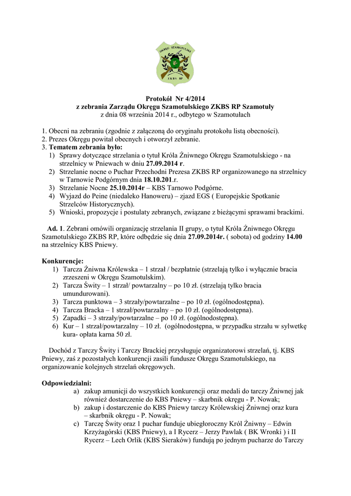 Protokół Nr 4/2014 z zebrania Zarządu Okręgu Szamotulskiego ZKBS RP Szamotuły z dnia 08 września 2014 r., odbytego w Szamotułach 1. Obecni na zebraniu (zgodnie z załączoną do oryginału protokołu listą obecności). 2. Prezes Okręgu powitał obecnych i otworzył zebranie. 3. Tematem zebrania było: 1) Sprawy dotyczące strzelania o tytuł Króla Żniwnego Okręgu Szamotulskiego - na strzelnicy w Pniewach w dniu 27.09.2014 r. 2) Strzelanie nocne o Puchar Przechodni Prezesa ZKBS RP organizowanego na strzelnicy w Tarnowie Podgórnym dnia 18.10.201.r. 3) Strzelanie Nocne 25.10.2014r – KBS Tarnowo Podgórne. 4) Wyjazd do Peine (niedaleko Hanoweru) – zjazd EGS ( Europejskie Spotkanie Strzelców Historycznych). 5) Wnioski, propozycje i postulaty zebranych, związane z bieżącymi sprawami brackimi. Ad. 1. Zebrani omówili organizację strzelania II grupy, o tytuł Króla Żniwnego Okręgu Szamotulskiego ZKBS RP, które odbędzie się dnia 27.09.2014r. ( sobota) od godziny 14.00 na strzelnicy KBS Pniewy. Konkurencje: 1) Tarcza Żniwna Królewska – 1 strzał / bezpłatnie (strzelają tylko i wyłącznie bracia zrzeszeni w Okręgu Szamotulskim). 2) Tarcza Świty – 1 strzał/ powtarzalny – po 10 zł. (strzelają tylko bracia umundurowani). 3) Tarcza punktowa – 3 strzały/powtarzalne – po 10 zł. (ogólnodostępna). 4) Tarcza Bracka – 1 strzał/powtarzalny – po 10 zł. (ogólnodostępna). 5) Zapadki – 3 strzały/powtarzalne – po 10 zł. (ogólnodostępna). 6) Kur – 1 strzał/powtarzalny – 10 zł. (ogólnodostępna, w przypadku strzału w sylwetkę kura- opłata karna 50 zł. Dochód z Tarczy Świty i Tarczy Brackiej przysługuje organizatorowi strzelań, tj. KBS Pniewy, zaś z pozostałych konkurencji zasili fundusze Okręgu Szamotulskiego, na organizowanie kolejnych strzelań okręgowych. Odpowiedzialni: a) zakup amunicji do wszystkich konkurencji oraz medali do tarczy Żniwnej jak również dostarczenie do KBS Pniewy – skarbnik okręgu - P. Nowak; b) zakup i dostarczenie do KBS Pniewy tarczy Królewskiej Żniwnej oraz kura – skarbnik okręgu - P. Nowak; c) Tarczę Świty oraz 1 puchar funduje ubiegłoroczny Król Żniwny – Edwin Krzyżagórski (KBS Pniewy), a I Rycerz – Jerzy Pawlak ( BK Wronki ) i II Rycerz – Lech Orlik (KBS Sieraków) fundują po jednym pucharze do Tarczy d) e) f) g) h) Świty. Zakupu tarczy oraz pucharów dokona E. Krzyżagórski i rozliczy puchary z Rycerzami; zakup tarcz papierowych i kołków – KBS Pniewy; zakup nagród rzeczowych do tarczy punktowej, kura i zapadek – sekretarz KBS Tarnowo Podgórne – M. Mazantowicz; obsługa strzelecka (w uzgodnieniu z prowadzącym strzelania - G. Jaskułą z KBS Sieraków; obsługa sekretariatu i wyżywienie oraz napoje od godziny rozpoczęcia do rautu – KBS Pniewy; posiłki i napoje podczas rautu Brackiego – KBS Pniewy. Środki finansowe: 1) organizator strzelań KBS Pniewy postanowiło ufundować i wystawić tarczę Bracką oraz ufundować nagrody rzeczowe do tej tarczy, 2) Okręg Szamotulski ZKBS RP funduje ze składek członkowskich i funduszu Okręgu: amunicję do wszystkich konkurencji, tarczę Żniwną Królewską oraz medale do niej, kura jak również nagrody do tarczy punktowej, kura i zapadek, 3) raut królewski odbędzie się na koszt Okręgu Szamotulskiego ZKBS RP. Przy 2 głosach przeciwnych, Zarząd podjął uchwałę, że wysokość dofinansowania wyniesie: iloczyn ilości osób wpisanych na liście do strzelania Królewskiego x 30 zł. Losowanie broni z pośród wystawionej przez uczestników strzelania, z której odbędzie się strzelanie do tarczy Żniwnej Królewskiej o godz. 14.15. Wylosowanej broni nie będzie można używać do strzelań w innych konkurencjach. Prowadzący strzelania prosi o podanie imion i nazwisk sędziów - po 1 z każdego bractwa. Zakup startowych odbywa się do godz. 16.30. Strzelanie do kura od godz. 17.00. Sekretariat organizuje i prowadzi organizator – KBS Tarnowo Podgórne. Organizator określi wysokość odpłatności za konsumpcję i napoje od rozpoczęcia strzelań do rozpoczęcia rautu Brackiego. Ad.2. Strzelanie II grupy, o Puchar Przechodni Prezesa ZKBS RP będzie zorganizowane na strzelnicy w Tarnowie Podgórnym dnia 18.10.2014.r. (sobota), od godz. 14.00. Ad.3. Zebrani omówili organizację strzelania II grupy - Strzelania Nocnego, które odbędzie się dnia 25.10.2014r. (sobota) o godzinie 19.00 na strzelnicy KBS Tarnowo Podgórne. Organizatorem strzelania jest KBS Tarnowo Podgórne. Okręg Szamotulski postanowił dofinansować strzelanie, z brackich składek członkowskich na Okręg Szamotulski - kwotą 500 zł. Przegłosowano regulamin Nocnego Strzelania. Nie obowiązuje strój bracki. Nie należy zabierać ze sobą broni, gdyż broń i amunicję zapewnia wyłącznie organizator strzelania, i tylko z tej broni odbędzie się strzelanie. Ustalono, że każdy uczestnik zobowiązany jest do zakupu startowego za 40 zł, a w jego cenie jest: pierwsza seria 3 strzałów oraz biesiada. Seria powtórkowa kosztować będzie 10 zł. - za serię. Sprzedaż startowych odbywać się będzie tylko, do godz. 22.00. Bractwa do dnia 21.10.2014r.włącznie deklarują do Prezesa KBS Tarnowo Podgórne, S. Bączyka e-mail [email protected] - liczbę uczestników z bractwa. Ad.4. Zjazd EGS ( Europejski Zjazd Bractw ) odbędzie się w Peine - niedaleko Hanoweru, w dniach 28-30.08.2015r. Wyjazd autobusem do Peine organizuje KBS Tarnowo Podgórne, które zabezpiecza również: noclegi, wyżywienie i ubezpieczenie. Wyjazd nastąpi w piątek rano ze strzelnicy KBS Tarnowo Podgórne. Prezesi i Starsi bractw proszeni są o zgłaszanie uczestników w terminie do dnia 31.10.2014r. do Sekretarza KBS Tarnowo Podgórne M. Mazantowicz tel. 505-155-470. Uczestników zjazdu można również zgłosić w czasie odbywających się strzelań. Link do strony dot. zjazdu EGS www.peiner-freischiessen.de/EST2015/documents/ESF_Peine2015_Flyer_web.pdf Ad. 5. Wnioski, 