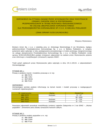 ODPOWIEDZI NA PYTANIA ZADANE PRZEZ WYKONAWCÓW ORAZ MODYFIKACJE (ZMIANY) ZAPISÓW SIWZ W POSTĘPOWANIU PRZEPROWADZONYM W TRYBIE PRZETARGU NIEOGRANICZONEGO NA USŁUGĘ UBEZPIECZENIA KOMUNIKACYJNEGO DLA PRZEDSIĘBIORSTWA KOMUNALNEGO SP Z O.O. W BIELSKU PODLASKIM (ZNAK SPRAWY 9/2013/K/NO/K/BU) Wszyscy Wykonawcy Brokers Union Sp. z o.o. z siedzibą przy ul. Antoniego Słonimskiego 6 we Wrocławiu, będący pełnomocnikiem Przedsiębiorstwa Komunalnego Sp. z o.o. w Bielsku Podlaskim, w związku pytaniami jakie wpłynęły w toku postępowania prowadzonego w trybie przetargu nieograniczonego na usługę ubezpieczenia Przedsiębiorstwa Komunalnego Sp. z o.o. w Bielsku Podlaskim (znak sprawy 9/2013/K/NO/K/BU) podaje niniejszym odpowiedzi na zadane przez Wykonawców pytania oraz informuje o modyfikacjach (zmianach) zapisów SIWZ: Treść pytań zadanych przez Wykonawców jakie wpłynęły w dniu 19.11.2013r. z odpowiedziami Zamawiającego: PYTANIE NR 1: Proszę o podanie marek i modelów przeczep o nr rej: a) BBI P275 b) BBI 73PV c) BKP 893G d) BBI P103 ODPOWIEDŹ: Zamawiający poniżej podane informację na temat marek i modeli przyczep o następujących numerach rejestracyjnych: Nr rejestracyjny BBI P275 BBI 73PV BKP 893G BBI P103 Marka Autosan Autosan Autosan Model/Typ D - 47 BC 1000 D - 732 D - 731 Powyższa odpowiedź powoduje modyfikację (zmiany) zapisów Załącznika nr 2 do SIWZ – „Wykaz pojazdów”. Zmienione pola zostały oznaczone kolorem żółtym. PYTANIE NR 2: Proszę o podanie modelu pojazdów o nr. rej: a) BBI G848 b) BBI 23FM c) BBI F720 Strona 1 z 3 d) BBI Y942 e) BBI R735 f) BBI 01TG ODPOWIEDŹ: Zamawiający poniżej podane informację na temat modeli pojazdów o następujących numerach rejestracyjnych Nr rejestracyjny BBI G848 BBI 23FM BBI F720 BBI Y942 Model Żuk – pojazd został sprzedany w związku z czym zostaje usunięty z Załącznika nr 2 do SIWZ – „Wykaz pojazdów”. A07H KAT Pojazd został sprzedany w związku Załącznika nr 2 do SIWZ – „Wykaz Pojazd został sprzedany w związku Załącznika nr 2 do SIWZ – „Wykaz BBI R735 MTZ 82 BIAŁORUŚ BBI 01TG 1934 z czym zostaje usunięty z pojazdów”. z czym zostaje usunięty z pojazdów”. Powyższa odpowiedź powoduje modyfikację (zmiany) zapisów Załącznika nr 2 do SIWZ – „Wykaz pojazdów”. Zmienione pola zostały oznaczone kolorem żółtym. PYTANIE NR 3: Proszę o wyjaśnienie na czym polegają specjalności wszystkich pojazdów specjalnych załączonych w załączniku nr 2 do SIWZ ODPOWIEDŹ: Zamawiający informuje, iż w wykazie pojazdów w kolumnie „Typ” jest napisane jakiego typu jest dany pojazd specjalny. Poniżej jeszcze dokładnej podajemy opis pojazdów oznaczonych jako specjalny w Załączniku nr 2 do SIWZ – „Wykaz pojazdów” Nr rej. Marka Typ Rodzaj pojazdu BBI C529 Jelcz Wuko Asenizacyjny specjalny BBI F014 Jelcz SM1 10 Asenizacyjny specjalny BBI F856 Star H069 Asenizacyjny specjalny BBI C531 Star 28 Asenizacyjny specjalny BBI L496 Star 660 Specjalistyczny specjalny Strona 2 z 3 Opis specjalności Pojazd asenizacyjny – pojazd specjalny służący do wywozu nieczystości ciekłych (fekaliów, ścieków) Pojazd asenizacyjny – pojazd specjalny służący do wywozu nieczystości ciekłych (fekaliów, ścieków Pojazd asenizacyjny – pojazd specjalny służący do wywozu nieczystości ciekłych (fekaliów, ścieków Pojazd asenizacyjny – pojazd specjalny służący do wywozu nieczystości ciekłych (fekaliów, ścieków Koparka Nr rej. Marka Typ Rodzaj pojazdu BTU 7042 Polonez Truck Specjalistyczny specjalny Pojazd został sprzedany w związku z czym zostaje usunięty z Załącznika nr 2 do SIWZ – „Wykaz pojazdów”. BBI N231 Jelcz specjalny Podnośnik koszowy bez nr CAT specjalny Koparka BBI 49FG Renault specjalny Pogrzebowy PM 0212 Specjalistyczny 428D Koparka Trafic Opis specjalności Powyższa odpowiedź powoduje modyfikację (zmiany) zapisów Załącznika nr 2 do SIWZ – „Wykaz pojazdów”. Zmienione pola zostały oznaczone kolorem żółtym. PYTANIE NR 4: Proszę o podanie ładowności pojazdów o nr. rej: a) BBI J688 b) BBI 11GM c) BI 3702P d) BI 2934P e) BBI 44WX f) BBI 49FG ODPOWIEDŹ: Zamawiający poniżej podane informację na temat ładowności pojazdów o następujących numerach rejestracyjnych Nr rejestracyjny BBI J688 BBI 11GM BI 3702P BI 2934P BBI 44WX BBI 49FG Ładowność 1 598 kg 16 025 kg 962 kg 1 158 kg 1 115 kg 1 000 kg Powyższa odpowiedź powoduje modyfikację (zmiany) zapisów Załącznika nr 2 do SIWZ – „Wykaz pojazdów”. Zmienione pola zostały oznaczone kolorem żółtym. Wrocław, 20.11.2013r. Kinga Kobalczyk Strona 3 z 3