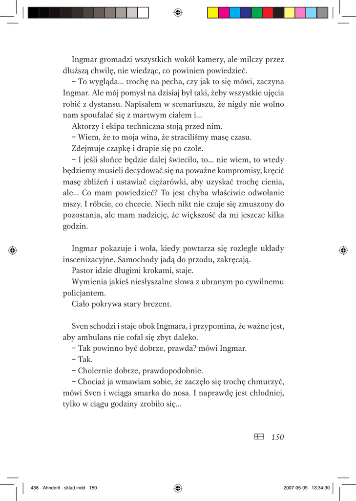 Ingmar gromadzi wszystkich wokół kamery, ale milczy przez dłuższą chwilę, nie wiedząc, co powinien powiedzieć. – To wygląda… trochę na pecha, czy jak to się mówi, zaczyna Ingmar. Ale mój pomysł na dzisiaj był taki, żeby wszystkie ujęcia robić z dystansu. Napisałem w scenariuszu, że nigdy nie wolno nam spoufalać się z martwym ciałem i… Aktorzy i ekipa techniczna stoją przed nim. – Wiem, że to moja wina, że straciliśmy masę czasu. Zdejmuje czapkę i drapie się po czole. – I jeśli słońce będzie dalej świeciło, to… nie wiem, to wtedy będziemy musieli decydować się na poważne kompromisy, kręcić masę zbliżeń i ustawiać ciężarówki, aby uzyskać trochę cienia, ale… Co mam powiedzieć? To jest chyba właściwie odwołanie mszy. I róbcie, co chcecie. Niech nikt nie czuje się zmuszony do pozostania, ale mam nadzieję, że większość da mi jeszcze kilka godzin. Ingmar pokazuje i woła, kiedy powtarza się rozległe układy inscenizacyjne. Samochody jadą do przodu, zakręcają. Pastor idzie długimi krokami, staje. Wymienia jakieś niesłyszalne słowa z ubranym po cywilnemu policjantem. Ciało pokrywa stary brezent. Sven schodzi i staje obok Ingmara, i przypomina, że ważne jest, aby ambulans nie cofał się zbyt daleko. – Tak powinno być dobrze, prawda? mówi Ingmar. – Tak. – Cholernie dobrze, prawdopodobnie. – Chociaż ja wmawiam sobie, że zaczęło się trochę chmurzyć, mówi Sven i wciąga smarka do nosa. I naprawdę jest chłodniej, tylko w ciągu godziny zrobiło się… 150 458 - Ahndoril - sklad.indd 150 2007-05-09 13:34:30