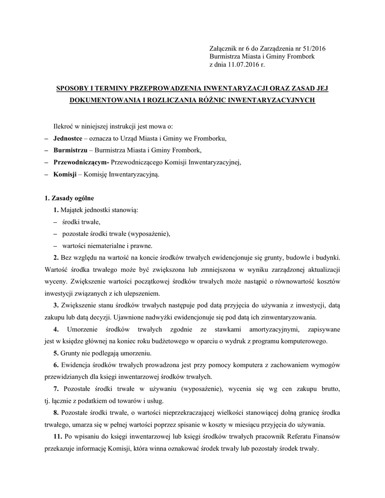 Załącznik nr 6 do Zarządzenia nr 51/2016 Burmistrza Miasta i Gminy Frombork z dnia 11.07.2016 r. SPOSOBY I TERMINY PRZEPROWADZENIA INWENTARYZACJI ORAZ ZASAD JEJ DOKUMENTOWANIA I ROZLICZANIA RÓŻNIC INWENTARYZACYJNYCH Ilekroć w niniejszej instrukcji jest mowa o: – Jednostce – oznacza to Urząd Miasta i Gminy we Fromborku, – Burmistrzu – Burmistrza Miasta i Gminy Frombork, – Przewodniczącym- Przewodniczącego Komisji Inwentaryzacyjnej, – Komisji – Komisję Inwentaryzacyjną. 1. Zasady ogólne 1. Majątek jednostki stanowią: – środki trwałe, – pozostałe środki trwałe (wyposażenie), – wartości niematerialne i prawne. 2. Bez względu na wartość na koncie środków trwałych ewidencjonuje się grunty, budowle i budynki. Wartość środka trwałego może być zwiększona lub zmniejszona w wyniku zarządzonej aktualizacji wyceny. Zwiększenie wartości początkowej środków trwałych może nastąpić o równowartość kosztów inwestycji związanych z ich ulepszeniem. 3. Zwiększenie stanu środków trwałych następuje pod datą przyjęcia do używania z inwestycji, datą zakupu lub datą decyzji. Ujawnione nadwyżki ewidencjonuje się pod datą ich zinwentaryzowania. 4. Umorzenie środków trwałych zgodnie ze stawkami amortyzacyjnymi, zapisywane jest w księdze głównej na koniec roku budżetowego w oparciu o wydruk z programu komputerowego. 5. Grunty nie podlegają umorzeniu. 6. Ewidencja środków trwałych prowadzona jest przy pomocy komputera z zachowaniem wymogów przewidzianych dla księgi inwentarzowej środków trwałych. 7. Pozostałe środki trwałe w używaniu (wyposażenie), wycenia się wg cen zakupu brutto, tj. łącznie z podatkiem od towarów i usług. 8. Pozostałe środki trwałe, o wartości nieprzekraczającej wielkości stanowiącej dolną granicę środka trwałego, umarza się w pełnej wartości poprzez spisanie w koszty w miesiącu przyjęcia do używania. 11. Po wpisaniu do księgi inwentarzowej lub księgi środków trwałych pracownik Referatu Finansów przekazuje informację Komisji, która winna oznakować środek trwały lub pozostały środek trwały. 2. Odpowiedzialność za składniki mienia A) 1. Odpowiedzialność za należyte zabezpieczenie majątku gminy ponosi Przewodniczący, na którym również ciąży obowiązek nadzoru nad właściwą eksploatacją majątku i zabezpieczeniem go przed kradzieżą i zniszczeniem. 2. Odpowiedzialność za właściwą eksploatację i ochronę składników majątkowych w czasie godzin pracy ponoszą pracownicy, których pieczy składniki te powierzono w związku z zajmowanym stanowiskiem. 3. Odpowiedzialność za majątek jednostki używany przez jednostki organizacyjne Gminy ponoszą kierownicy poszczególnych jednostek. B) 1. Pozostałe środki trwałe objęte ewidencją ilościowo-wartościową, stanowiące wyposażenie biurowe, winny być przypisane do każdego pomieszczenia z osobna i ujęte w spisie inwentarzowym. 2. Spis inwentarzowy (wywieszka), oprócz numeru pomieszczenia, powinien określać rodzaj, ilość składników wyposażenia, ich numer inwentarzowy oraz nazwiska i imiona pracowników, których pieczy składniki te powierzono. Spis taki, opatrzony pieczęcią jednostki i podpisami osób odpowiedzialnych umieszcza się w widocznym miejscu w każdym pomieszczeniu (wzór „Spisu inwentarza” stanowi Załącznik Nr 1 do niniejszej Instrukcji). 3. Wszelkie zmiany w stanie wyposażenia danego pomieszczenia biurowego lub innego mogą nastąpić za wiedzą Burmistrza i Przewodniczącego oraz pracowników odpowiedzialnych za jego eksploatację i ochronę. Zmiany te każdorazowo powinny być odnotowane w spisie inwentarzowym. W przypadku zmian w środkach trwałych lub pozostałych środkach trwałych podlegających ewidencji ilościowowartościowej – zmiany winny być zgłoszone do Referatu Finansów na obowiązujących drukach, szczegółowo opisanych w treści instrukcji. Obowiązek dopilnowania zgłoszenia zmian ciąży na osobie odpowiedzialnej za jego eksploatację i ochronę, (wzór protokołu przekazania stanowi Załącznik Nr 2 do niniejszej Instrukcji) 4. Przewodniczący zobowiązany jest dopilnować aktualizacji w spisie inwentarzowym podpisów pracowników w razie zmian personalnych na stanowiskach pracy usytuowanych w danym pomieszczeniu. C) 1. Pracownikom jednostki może być powierzony, na podstawie odpowiedniego dowodu („OT” lub „PT”) sprzęt biurowy do użytku indywidualnego. Przyjmując taki sprzęt pracownik winien podpisać oświadczenie o odpowiedzialności materialnej za powierzone mu mienie i zobowiązać się do jego zwrotu, gdy ustanie potrzeba jego użytkowania. (Wzór oświadczenia zawiera Załącznik Nr 3 do niniejszej Instrukcji.) Oświadczenia powyższe przechowuje się w aktach osobowych i dokumentacji prowadzonej przez Komisję. 2. Sprzęt biurowy, niepodlegający ewidencji ilościowo-wartościowej przydzielony do indywidualnego użytku pracownika nie wymaga wykazania w spisie inwentarzowym, przy czym obowiązek okazania tego sprzętu Komisji spoczywa na pracowniku, pod rygorem odpowiedzialności za stwierdzony brak. 3. Obowiązkiem pracowników, z którymi rozwiązywany jest stosunek pracy jest uzyskanie zaświadczenia od Przewodniczącego potwierdzającego jego rozliczenie się z powierzonego mienia. D) 1. Przewodniczący zobowiązany jest zorganizować taką formę nadzoru, która skutecznie służy należytej ochronie składników majątkowych przed zniszczeniem lub kradzieżą. 2. W przypadku stwierdzenia nieodpowiednich warunków zabezpieczenia składników majątkowych, osoba wymieniona w ust. 1 występuje z wnioskiem do Burmistrza o spowodowanie wykonania koniecznych prac w celu usunięcia zagrożenia. 3. W przypadku stwierdzenia braku właściwych warunków dla zabezpieczenia składników majątkowych, powierzonych pracownikowi do indywidualnego użytku, zainteresowany pracownik obowiązany jest na piśmie zgłosić ten fak