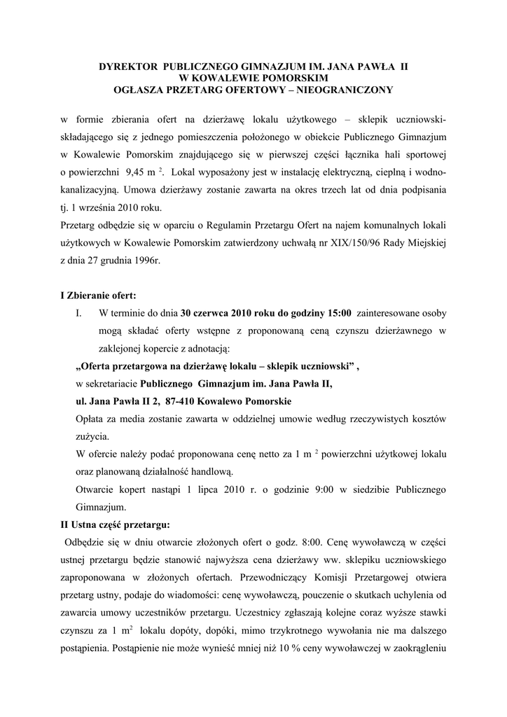 DYREKTOR PUBLICZNEGO GIMNAZJUM IM. JANA PAWŁA II W KOWALEWIE POMORSKIM OGŁASZA PRZETARG OFERTOWY – NIEOGRANICZONY w formie zbierania ofert na dzierżawę lokalu użytkowego – sklepik uczniowskiskładającego się z jednego pomieszczenia położonego w obiekcie Publicznego Gimnazjum w Kowalewie Pomorskim znajdującego się w pierwszej części łącznika hali sportowej o powierzchni 9,45 m 2. Lokal wyposażony jest w instalację elektryczną, cieplną i wodnokanalizacyjną. Umowa dzierżawy zostanie zawarta na okres trzech lat od dnia podpisania tj. 1 września 2010 roku. Przetarg odbędzie się w oparciu o Regulamin Przetargu Ofert na najem komunalnych lokali użytkowych w Kowalewie Pomorskim zatwierdzony uchwałą nr XIX/150/96 Rady Miejskiej z dnia 27 grudnia 1996r. I Zbieranie ofert: I. W terminie do dnia 30 czerwca 2010 roku do godziny 15:00 zainteresowane osoby mogą składać oferty wstępne z proponowaną ceną czynszu dzierżawnego w zaklejonej kopercie z adnotacją: „Oferta przetargowa na dzierżawę lokalu – sklepik uczniowski” , w sekretariacie Publicznego Gimnazjum im. Jana Pawła II, ul. Jana Pawła II 2, 87-410 Kowalewo Pomorskie Opłata za media zostanie zawarta w oddzielnej umowie według rzeczywistych kosztów zużycia. W ofercie należy podać proponowana cenę netto za 1 m 2 powierzchni użytkowej lokalu oraz planowaną działalność handlową. Otwarcie kopert nastąpi 1 lipca 2010 r. o godzinie 9:00 w siedzibie Publicznego Gimnazjum. II Ustna część przetargu: Odbędzie się w dniu otwarcie złożonych ofert o godz. 8:00. Cenę wywoławczą w części ustnej przetargu będzie stanowić najwyższa cena dzierżawy ww. sklepiku uczniowskiego zaproponowana w złożonych ofertach. Przewodniczący Komisji Przetargowej otwiera przetarg ustny, podaje do wiadomości: cenę wywoławczą, pouczenie o skutkach uchylenia od zawarcia umowy uczestników przetargu. Uczestnicy zgłaszają kolejne coraz wyższe stawki czynszu za 1 m2 lokalu dopóty, dopóki, mimo trzykrotnego wywołania nie ma dalszego postąpienia. Postąpienie nie może wynieść mniej niż 10 % ceny wywoławczej w zaokrągleniu do 10 groszy w górę. W przypadku gdy do części ustnej zgłosi się tylko 1 oferent zasad określonych powyżej nie stosuje się. Oferta powinna zawierać: -kserokopię wpisu do ewidencji działalności gospodarczej lub Krajowego Rejestru Sądowego, -datę sporządzenie oferty, -oferowaną cenę netto za 1 m2 powierzchni użytkowej lokalu -termin rozpoczęcia działalności – niedotrzymanie terminu będzie skutkować natychmiastowym wypowiedzeniem umowy, -określenie planowanej działalności handlowej, -kopię dowodu wpłaty wadium, -oświadczenie, że oferent zapoznał się z postanowieniami projektu umowy i na takich warunkach podpisze ją oraz, że zapoznał się z Regulaminem Przetargu Ofert na najem komunalnych lokali użytkowych w Kowalewie Pomorskim. Oferent zobowiązany jest do wpłacenia na konto Urzędu Miejskiego w Kowalewie Pomorskim BS Kowalewo Nr 53 9496 0008 0000 1720 2000 0045 z dopiskiem wadium za wynajem lokalu – sklepik uczniowski- Publiczne Gimnazjum do dnia upływu terminu składania ofert- 30 czerwca 2010 , kwoty wadium równej iloczynowi składki czynszu za 1 m 2 miesięcznie proponowanej przez oferenta i powierzchni lokalu, o najem którego się ubiega. W przypadku wygrania przetargu wadium będzie stanowić część kaucji zabezpieczającej. W celu zapoznania się z aktualnym stanem lokalu oraz kosztami jego utrzymania należy kontaktować się z p. Renatą Falutą – Kaszubowską- dyrektorem Publicznego Gimnazjum lub Mileną Kowalską- sekretarzem Publicznego Gimnazjum – tel. 56-684-01-85. Z projektem umowy Można zapoznać się w sekretariacie Publicznego Gimnazjum w Kowalewie Pomorskim. Dyrektor szkoły zastrzega sobie prawo odstąpienia od przetargu bez podania przyczyny. Renata Faluta-Kaszubowska Dyrektor Publicznego Gimnazjum
