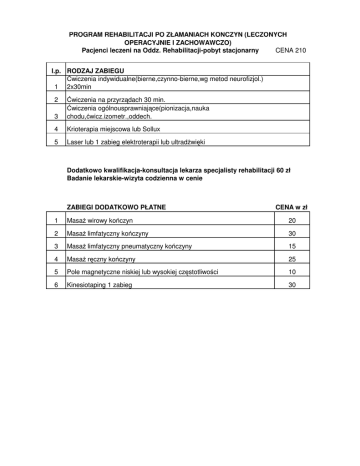PROGRAM REHABILITACJI PO ZŁAMANIACH KOŃCZYN (LECZONYCH OPERACYJNIE I ZACHOWAWCZO) Pacjenci leczeni na Oddz. Rehabilitacji-pobyt stacjonarny CENA 210 l.p. RODZAJ ZABIEGU Ćwiczenia indywidualne(bierne,czynno-bierne,wg metod neurofizjol.) 1 2x30min 2 3 Ćwiczenia na przyrządach 30 min. Ćwiczenia ogólnousprawniające(pionizacja,nauka chodu,ćwicz.izometr.,oddech. 4 Krioterapia miejscowa lub Sollux 5 Laser lub 1 zabieg elektroterapii lub ultradŜwięki Dodatkowo kwalifikacja-konsultacja lekarza specjalisty rehabilitacji 60 zł Badanie lekarskie-wizyta codzienna w cenie ZABIEGI DODATKOWO PŁATNE CENA w zł 1 MasaŜ wirowy kończyn 20 2 MasaŜ limfatyczny kończyny 30 3 MasaŜ limfatyczny pneumatyczny kończyny 15 4 MasaŜ ręczny kończyny 25 5 Pole magnetyczne niskiej lub wysokiej częstotliwości 10 6 Kinesiotaping 1 zabieg 30