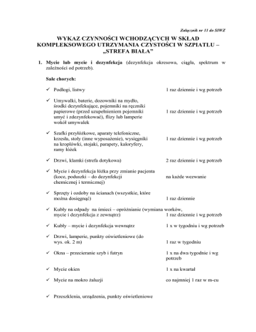 Załącznik nr 11 do SIWZ WYKAZ CZYNNOŚCI WCHODZĄCYCH W SKŁAD KOMPLEKSOWEGO UTRZYMANIA CZYSTOŚCI W SZPIATLU – „STREFA BIAŁA” 1. Mycie lub mycie i dezynfekcja (dezynfekcja okresowa, ciągła, spektrum w zależności od potrzeb). Sale chorych: Podłogi, listwy 1 raz dziennie i wg potrzeb Umywalki, baterie, dozowniki na mydło, środki dezynfekujące, pojemniki na ręczniki papierowe (przed uzupełnieniem pojemniki umyć i zdezynfekować), flizy lub lamperie wokół umywalek 1 raz dziennie i wg potrzeb Szafki przyłóżkowe, aparaty telefoniczne, krzesła, stoły (inne wyposażenie), wysięgniki na kroplówki, stojaki, parapety, kaloryfery, ramy łóżek 1 raz dziennie i wg potrzeb Drzwi, klamki (strefa dotykowa) 2 raz dziennie i wg potrzeb Mycie i dezynfekcja łóżka przy zmianie pacjenta (koce, poduszki – do dezynfekcji chemicznej i termicznej) na każde wezwanie Sprzęty i ozdoby na ścianach (wszystkie, które można dosięgnąć) 1 raz dziennie Kubły na odpady na śmieci – opróżnianie (wymiana worków, mycie i dezynfekcja z zewnątrz) Kubły – mycie i dezynfekcja wewnątrz 1 raz dziennie i wg potrzeb 1 x w tygodniu i wg potrzeb Drzwi, lamperie, punkty oświetleniowe (do wys. ok. 2 m) 1 raz w tygodniu Okna – przecieranie szyb i futryn 1 x na dwa tygodnie i wg potrzeb Mycie okien 1 x na kwartał Mycie na mokro żaluzji co najmniej 1 raz w m-cu Przeszklenia, urządzenia, punkty oświetleniowe (powyżej 2 m) 1 raz w m-cu przecieranie telewizorów, komputerów i pozostałego sprzętu medycznego (np. obudowy tomografu itp.) zgodnie z zasadami BHP 1 x w tygodniu i wg potrzeb GRUNTOWNE MYCIE I DEZYNFEKCJA SALI (ZMIANA PACJENTÓW) NA KAŻDE WEZWANIE Gabinety zabiegowe : Podłogi, listwy (cokoliki) 2 raz dziennie oraz po każdym zabiegu i wg potrzeb Drzwi, klamki (strefa dotykowa) 2 raz dziennie i wg potrzeb Umywalki, flizy (strefa spryskowa) 2 raz dziennie i wg potrzeb Dozowniki na mydło, środki dezynfekujące, pojemniki na ręczniki papierowe, sprzęty na ścianach (w zasięgu) 1 raz dziennie Parapety, kaloryfery, szafki, aparaty telefoniczne, wysięgniki na kroplówki, stojaki, łóżka (stoły) zabiegowe, krzesła (taborety) i inne wyposażenie nie wymagające specjalistycznej obsługi 1 raz dziennie Kubły na odpady komunalne i sanitarne, opróżnianie i wymiana worków 2 raz dziennie i wg potrzeb Kubły – mycie i dezynfekcja z zewnątrz 1 x dziennie i wg potrzeb Kubły – mycie i dezynfekcja w wewnątrz 1 x w tygodniu i wg potrzeb Drzwi, flizy, lamperie, punkty oświetleniowe (do wys. 2 m) 1 x w tygodniu i wg potrzeb Przeszklenia, żaluzje, urządzenia, oświetlenie (powyżej 2 m) 1 raz w m-cu i wg potrzeb Okna 1 raz w m-cu i wg potrzeb GRUNTOWNE MYCIE I DEZYNFEKCJA NA KAŻDE WEZWANIE I WG POTRZEB Sanitariaty , łazienki, brudowniki WC – muszle klozetowe z deską, spłuczki, bidety, podłogi kabin, pryszniców i pozostałe powierzchnie podłóg 3 raz dziennie i wg potrzeb Umywalki + strefa spryskowa, wanny, kabiny natryskowe, wc, drzwi, klamki w strefie dotykowej 3 raz dziennie i wg potrzeb Uchwyty, poręcze baterie, pojemniki na mydło, ręczniki, papier toaletowy, parapety, inny sprzęt 1 raz dziennie i wg potrzeb Drzwi, flizy, kaloryfery, sprzęt na ścianie oświetlenie (do 2 m) 1 x w tygodniu i wg potrzeb Opróżnianie, mycie i dezynfekcja basenów, kaczek, ssaków, pojemników na mocz, itp. na bieżąco i wg potrzeb Regały, stelaże wiszące na baseny, kaczki 1 raz dziennie i wg potrzeb Opróżnianie (wymiana worków) kubłów na odpady medyczne zakaźne, mycie i dezynfekcja z zewnątrz 2 x dziennie i wg potrzeb Kubły– mycie i dezynfekcja w wewnątrz 1 x w tygodniu i wg potrzeb Usunięcie zużytej bielizny do miejsca wskazanego 1 x dziennie i wg potrzeb Przeszklenia, flizy (pełna wysokość), żaluzje, oświetlenie (powyżej 2 m) 1 raz w m-cu Okna – przetarcie szyb i futryn 1 raz na 2 tyg. i wg potrzeb Mycie okien 1 raz na kwartał Pomieszczenia na zwłoki Mycie i dezynfekcja (pełne spektrum) całości pomieszczenia Mycie i dezynfekcja drzwi, klamek, włączników Mycie podłóg każdorazowo po wywiezieniu zwłok 1 raz w tygodniu i wg potrzeb 1 raz w tygodniu 2. Mycie i dezynfekcja pozostałych powierzchni i pomieszczeń oddziałów (dezynfekcja – częstotliwość i spektrum, w zależności od potrzeb) Dyżurki pielęgniarskie i lekarskie Podłogi, listwy Umywalki, baterie, dozowniki na mydło, środki dezynfekujące do rąk, pojemniki na ręczniki papierowe, flizy wokół umywalek Szafki, aparaty telefoniczne, parapety, kaloryfery, krzesła i inne wyposażenie nie wymagające specjalistycznej obsługi 1 raz dziennie i wg potrzeb 1 raz dziennie i wg potrzeb 1 raz dziennie Drzwi, klamki (strefa dotykowa) 3 raz dziennie Drzwi, lamperie (flizy), oświetlenie, sprzęt i ozdoby na ścianach (do wys. 2 m) 1 raz w tygodniu Przeszklenia, żaluzje, oświetlenia, szafy segmentowe (powyżej 2 m) Inne pomieszczenia (w tym szatnie) Czynności sprzątające jak w dyżurkach pielęgniarskich (drzwi – strefa dotykowa) Pozostałe czynności Rozmrażanie i mycie lodówek Wózki transportowe do przewożenia chorych (leżące, siedzące) – mycie i dezynfekcja 1 raz w miesiącu 1 raz dziennie wg potrzeb (w porozumieniu z piel. Oddziałową) każdorazowo po transporcie Chodziki, balkoniki, drabinki i sprzęt rehabilitacyjny (bez specjalistycznej obsługi) 1 raz dziennie i wg potrzeb Wózki do wywozu odpadów (komunalnych, medycznych zakaźnych) mycie i dezynfekcja Wózki gospodarcze (mycie i dezynfekcja) każdorazowo po wywozie wg potrzeb Mycie i dezynfekcja kółek od wszystkich wózków 1 raz dziennie i wg potrzeb Przecieranie powierzchni szafek (szatnie) 2 razy w m-cu Mycie szafek ubraniowych z zewnątrz 1 raz w m-cu Inne czynności związane z utrzymaniem czystości wg potrzeb Ciągi komunikacyjne w oddziałach Podłogi, listwy (cokoliki) 1 raz dziennie i wg potrzeb Klamki, włączniki Kubły na śmieci, odpady – opróżnianie (wymiana worków) mycie i dez