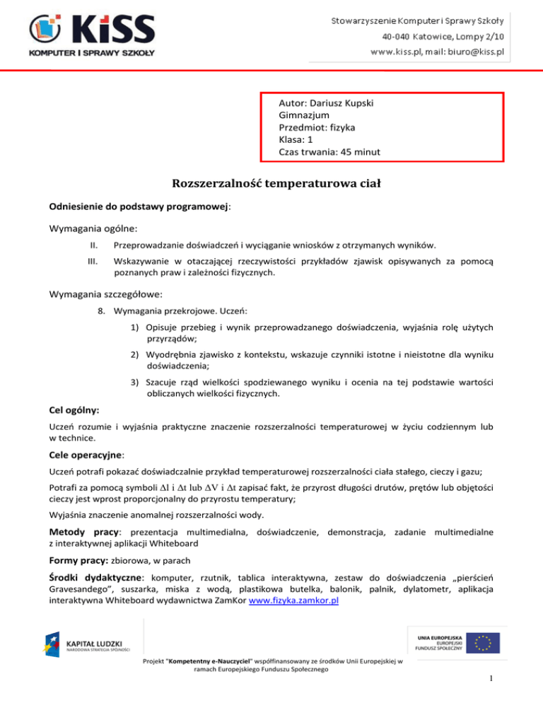 Autor: Dariusz Kupski Gimnazjum Przedmiot: fizyka Klasa: 1 Czas trwania: 45 minut Rozszerzalność temperaturowa ciał Odniesienie do podstawy programowej: Wymagania ogólne: II. Przeprowadzanie doświadczeń i wyciąganie wniosków z otrzymanych wyników. III. Wskazywanie w otaczającej rzeczywistości przykładów zjawisk opisywanych za pomocą poznanych praw i zależności fizycznych. Wymagania szczegółowe: 8. Wymagania przekrojowe. Uczeń: 1) Opisuje przebieg i wynik przeprowadzanego doświadczenia, wyjaśnia rolę użytych przyrządów; 2) Wyodrębnia zjawisko z kontekstu, wskazuje czynniki istotne i nieistotne dla wyniku doświadczenia; 3) Szacuje rząd wielkości spodziewanego wyniku i ocenia na tej podstawie wartości obliczanych wielkości fizycznych. Cel ogólny: Uczeń rozumie i wyjaśnia praktyczne znaczenie rozszerzalności temperaturowej w życiu codziennym lub w technice. Cele operacyjne: Uczeń potrafi pokazać doświadczalnie przykład temperaturowej rozszerzalności ciała stałego, cieczy i gazu; Potrafi za pomocą symboli Δl i Δt lub ΔV i Δt zapisać fakt, że przyrost długości drutów, prętów lub objętości cieczy jest wprost proporcjonalny do przyrostu temperatury; Wyjaśnia znaczenie anomalnej rozszerzalności wody. Metody pracy: prezentacja multimedialna, doświadczenie, demonstracja, zadanie multimedialne z interaktywnej aplikacji Whiteboard Formy pracy: zbiorowa, w parach Środki dydaktyczne: komputer, rzutnik, tablica interaktywna, zestaw do doświadczenia „pierścień Gravesandego”, suszarka, miska z wodą, plastikowa butelka, balonik, palnik, dylatometr, aplikacja interaktywna Whiteboard wydawnictwa ZamKor www.fizyka.zamkor.pl Projekt "Kompetentny e-Nauczyciel" współfinansowany ze środków Unii Europejskiej w ramach Europejskiego Funduszu Społecznego 1 Przygotowanie nauczyciela: wykonanie prezentacji z przykładami zapobiegania efektom rozszerzalności temperaturowej ciał w różnych konstrukcjach. Przebieg lekcji: Część Przebieg Uwagi 1.Wprowadzenie Naprowadzenie do tematu lekcji – pokaz działania termometru cieczowego. Pytanie problemowe – dlaczego 5 min wysokość słupka cieczy zmienia się w zależności od zmiany temperatury. Podanie i zapisanie tematu lekcji. 2.Część zasadnicza ok.35 min 1. Przeprowadzenie doświadczeń w parach: a) Podgrzewanie palnikiem umieszczonego w dylatometrze, pręta b) Podgrzewanie i ochładzanie kulki przesuwanej przez pierścień Gravesandego, c) Podgrzewanie za pomocą suszarki plastikowej butelki umieszczonej wlotem w misce z wodą, d) Podgrzewanie w naczyniu z gorącą wodą butelki, na wylot której naciągnięty jest balonik. 2. Formułowanie wniosków na podstawie przeprowadzonych doświadczeń i zapis w zeszycie. 3. Wspólne oglądanie filmu prezentującego rozszerzalność temperaturową cieczy - aplikacja interaktywna Whiteboard wydawnictwa ZamKor www.fizyka.zamkor.pl str. 85. 4. Prezentacja na tablicy interaktywnej diagramów przedstawiających wydłużenia prętów wykonanych z różnych materiałów oraz przyrostów objętości różnych cieczy. 5. Przedstawienie na tablicy interaktywnej zapisu wprost proporcjonalnej zależności: Δl ~ Δt lub ΔV ~ Δt 6. Prezentacja przez nauczyciela doświadczenia przedstawiającego wygięcie taśmy bimetalowej na skutek ogrzewania i wyjaśnienie zjawiska. 7. Wyjaśnienie zjawiska anomalnej rozszerzalności temperaturowej wody. Wykonanie zadania na tablicy interaktywnej – dopasowanie właściwej Projekt "Kompetentny e-Nauczyciel" współfinansowany ze środków Unii Europejskiej w ramach Europejskiego Funduszu Społecznego 2 temperatury do odpowiedniej warstwy wody w jeziorze - aplikacja interaktywna Whiteboard wydawnictwa ZamKor www.fizyka.zamkor.pl zad.1, str. 88. 3.Ewaluacja/pods Podsumowanie tematu lekcji. Prezentacja przykładów umowanie zapobiegania efektom rozszerzalności temperaturowej ciał w różnych konstrukcjach budowlanych – opis i wyjaśnienia ok. 5 min uczniów. Prezentacja kilku zdjęć z przykładami przygotowana Zadanie domowe – wykonanie przez uczniów zdjęć przez z otoczenia przedstawiających przykłady rozszerzalności nauczyciela. temperaturowej ciał. Załączniki: Prezentacja w MS PowerPoint Adnotacja o prawach autorskich: Oświadczam, że w scenariuszu lekcji nie naruszone zostały prawa majątkowe ani osobiste osób trzecich. Wyrażam zgodę na wykorzystanie scenariusza lekcji w formie elektronicznej i drukowanej z podaniem autora oraz strony, z której został pobrany. Projekt "Kompetentny e-Nauczyciel" współfinansowany ze środków Unii Europejskiej w ramach Europejskiego Funduszu Społecznego 3