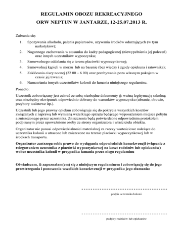 REGULAMIN OBOZU REKREACYJNEGO ORW NEPTUN W JANTARZE, 12-25.07.2013 R. Zabrania się: 1. Spożywania alkoholu, palenia papierosów, używania środków odurzających (w tym narkotyków); 2. Nagannego zachowania w stosunku do kadry pedagogicznej (niewypełnienia jej poleceń) oraz innych uczestników wypoczynku; 3. Samowolnego oddalania się z terenu placówki wypoczynkowej; 4. Samowolnej kąpieli w morzu lub na basenie (bez wiedzy i zgody opiekuna i ratownika); 5. Zakłócania ciszy nocnej (22 00 – 6 00) oraz przebywania poza własnym pokojem w czasie jej trwania; 6. Namawiania innych uczestników kolonii do łamania niniejszego regulaminu. Ponadto: Uczestnik zobowiązany jest zabrać ze sobą niezbędne dokumenty tj: ważną legitymację szkolną; oraz niezbędny ekwipunek odpowiednio dobrany do warunków wypoczynku (ubranie, obuwie, przybory toaletowe itp.). Uczestnik lub jego prawny opiekun zobowiązuje się do pokrycia wszystkich kosztów związanych z naprawą lub wymianą wszelkiego sprzętu będącego wyposażeniem miejsca pobytu a zniszczonego przez uczestnika. Zniszczenia będą potwierdzone odpowiednim protokołem podpisanym przez upoważnione osoby ze strony organizatora i właściciela obiektu. Organizator nie ponosi odpowiedzialności materialnej za rzeczy wartościowe należące do uczestnika kolonii a utracone lub zniszczone na terenie placówki wypoczynkowej lub w środkach transportu. Organizator zastrzega sobie prawo do wyciągania odpowiednich konsekwencji (włącznie z relegowaniem uczestnika z placówki wypoczynkowej na koszt rodziców lub opiekunów) wobec uczestnika kolonii w przypadku łamania przez niego regulaminu Oświadczam, iż zapoznałam(em) się z niniejszym regulaminem i zobowiązuję się do jego przestrzegania i ponoszenia wszelkich konsekwencji w przypadku jego złamania: podpis uczestnika kolonii podpisy rodziców lub opiekunów Integracyjny Klub Sportowy „Konstancin” Ul. Gąsiorowskiego 12/14 05 – 510 Konstancin Jeziorna Tel 22 756 43 13/ 609 660 753 pieczątka agenta KARTA UCZESTNIKA OBOZU Nazwa imprezy: Obóz sportowy Termin: 12 – 25.07.2013 r. Miejscowość / Kraj: Ośrodek Rehabilitacyjno – Wypoczynkowy „NEPTUN” Jantar, ul. Rybacka 22, 82-103 Stegna Imię i nazwisko …………………………………………………………………………... Data urodzenia ……………………...…… Adres zamieszkania …………………………………………………………………………... PESEL ……………………………... ……………………………………………………………………………………………………... Telefon (y) …………………………………………………………………………... Nazwa, adres i telefon szkoły …………………………………………………………………... ……………………………………………………………………………………………………... Adres oraz telefon kontaktowy rodziców (opiekunów) dziecka w czasie trwania pobytu dziecka na kolonii: Ojciec (opiekun) imię i nazwisko ……………………………………………………... adres zamieszkania ………………………………………………………………... telefon kontaktowy ………………………………………………………………... Matka (opiekunka) imię i nazwisko …………………………………………………....... adres zamieszkania ………………………………………………………………... telefon kontaktowy ………………………………………………………………... INFORMACJA RODZICÓW (OPIEKUNÓW) O DZIECKU Przebyte choroby (podać w którym roku życia): odra …………. ospa …………. różyczka …………. świnka …………. szkarlatyna …………. żółtaczka zakaźna …………. astma …………. choroby nerek …………. padaczka ……….… inne choroby reumatyczne …………. ………………………………………………………. Dolegliwości występujące u dziecka w ostatnim roku * : Omdlenia; bóle głowy; brzucha; niedosłuch; duszności; krwawienie z nosa; przewlekły kaszel; katar; angina; inne: …………………………………………………………………………………..………….... Zażywa stale leki (jeśli tak – podać jakie i sposób dawkowania) …………………………………………………………………………………………………….. …………………………………………………………………………………………………….. Dziecko jest :* nieśmiałe; ma trudności w nawiązywaniu kontaktów; nadpobudliwe; inne …………………….…………………….…………………….…………………..……….. uczulone (podać na co – nazwy leków, rodzaje pokarmu itp.) ………………………………………………………………………………....................... Dziecko nosi :* okulary; aparat ortodontyczny; wkładki ortopedyczne; ma podwyższony obcas buta; inne aparaty …………………………………………………………………...…… Jazdę samochodem znosi * dobrze / źle Inne uwagi o zdrowiu dziecka: ……………………………………………………………………………………………………. ……………………………………………………………………………………………………. ……………………………………………………………………………………………………. * niepotrzebne skreślić. W razie zagrożenia życia lub zdrowia dziecka zgadzam się na jego leczenie szpitalne, zabiegi diagnostyczne, obserwację. Stwierdzam, że padałam(em) wszystkie znane mi informacje o dziecku, które mogą pomóc w zapewnieniu mu właściwej opieki w czasie pobytu dziecka na kolonii. data podpis
