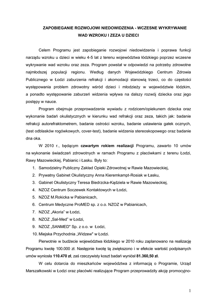 ZAPOBIEGANIE ROZWOJOWI NIEDOWIDZENIA - WCZESNE WYKRYWANIE WAD WZROKU I ZEZA U DZIECI Celem Programu jest zapobieganie rozwojowi niedowidzenia i poprawa funkcji narządu wzroku u dzieci w wieku 4-5 lat z terenu województwa łódzkiego poprzez wczesne wykrywanie wad wzroku oraz zeza. Program powstał w odpowiedzi na potrzeby zdrowotne najmłodszej populacji regionu. Według danych Wojewódzkiego Centrum Zdrowia Publicznego w Łodzi zaburzenia refrakcji i akomodacji stanowią trzeci, co do częstości występowania problem zdrowotny wśród dzieci i młodzieży w województwie łódzkim, a ponadto występowanie zaburzeń widzenia wpływa na dalszy rozwój dziecka oraz jego postępy w nauce. Program obejmuje przeprowadzenie wywiadu z rodzicem/opiekunem dziecka oraz wykonanie badań okulistycznych w kierunku wad refrakcji oraz zeza, takich jak: badanie refrakcji autorefraktometrem, badanie ostrości wzroku, badanie ustawienia gałek ocznych, (test odblasków rogówkowych, cover-test), badanie widzenia stereoskopowego oraz badanie dna oka. W 2010 r., będącym czwartym rokiem realizacji Programu, zawarto 10 umów na wykonanie świadczeń zdrowotnych w ramach Programu z placówkami z terenu Łodzi, Rawy Mazowieckiej, Pabianic i Łasku. Były to: 1. Samodzielny Publiczny Zakład Opieki Zdrowotnej w Rawie Mazowieckiej, 2. Prywatny Gabinet Okulistyczny Anna Kieremkampt-Rosiak w Łasku, 3. Gabinet Okulistyczny Teresa Biedrzcka-Kądziela w Rawie Mazowieckiej, 4. NZOZ Centrum Soczewek Kontaktowych w Łodzi, 5. NZOZ M.Rokicka w Pabianicach, 6. Centrum Medyczne ProMED sp. z o.o. NZOZ w Pabianicach, 7. NZOZ „Akoria” w Łodzi, 8. NZOZ „Sal-Med” w Łodzi, 9. NZOZ „SANMED" Sp. z o.o. w Łodzi, 10. Miejska Przychodnia „Widzew" w Łodzi. Pierwotnie w budżecie województwa łódzkiego w 2010 roku zaplanowano na realizację Programu kwotę 100.000 zł. Następnie kwotę tą zwiększono i w efekcie wartość podpisanych umów wyniosła 110.470 zł, zaś rzeczywisty koszt badań wyniósł 81.360,50 zł. W celu dotarcia do mieszkańców województwa z informacją o Programie, Urząd Marszałkowski w Łodzi oraz placówki realizujące Program przeprowadziły akcję promocyjno- 1 informacyjną. Ze środków budżetu województwa wydrukowano plakaty i ulotki (16.000 ulotek i 850 plakatów). Ponadto, o realizowanym Programie powiadomiono wybrane gminy, ośrodki pomocy społecznej, przedszkola, domy dziecka, fundacje i stowarzyszenia. Materiały promocyjne przekazano także do Łódzkiego Oddziału Wojewódzkiego Narodowego Funduszu Zdrowia w Łodzi, Wojewódzkiego Centrum Zdrowia Publicznego w Łodzi i kuratorium. Następnie informację o Programie rozpowszechniano poprzez Internet, gazety lokalne oraz radio. Ponadto plakaty promujące Program zostały zamieszczone w środkach komunikacji miejskiej. Wyniki Programu W trakcie wizyty okulistycznej odbywającej się w ramach programu, z rodzicami bądź opiekunami dzieci, został przeprowadzany wywiad w kierunku czynników ryzyka występowania zaburzeń wzroku u dzieci. W ciągu całego okresu realizacji Programu w 2010 roku przebadano 1.388 dzieci w wieku 4 i 5 lat z terenu województwa łódzkiego, przy czym dziewczynki stanowiły 50,22% (697), a chłopcy 49,78% (691). Z analizy ankiet wynika, iż 69,88% tj. 970 dzieci nie miała wcześniej wykonywanego badania okulistycznego (u 0,94 % dzieci, tj. 13 dzieci brak danych na ten temat). Odsetek dzieci, które miało kiedyś uraz głowy lub narządu wzroku był niewielki i wynosił 4,18 % (tj. 58 osób), przy czym w przypadku 1,3% dzieci tj. 18 badanych brak jest danych na ten temat. Wśród wszystkich przebadanych dzieci 6,34% (tj. 88 dzieci) urodziło się jako wcześniaki (odnośnie 0,29% tj. 4 badanych - brak danych na ten temat). Z przeprowadzonego wywiadu medycznego wynika również, iż odsetek dzieci z rozpoznaną dysleksją był niewielki i wynosił 0,5% (tj. 7 dzieci). Należy jednak zaznaczyć, iż w przypadku 2,74% pacjentów tj. 38 dzieci opiekunowie zaznaczyli w ankiecie brak wiedzy w tym zakresie. Odsetek 4 i 5 - latków, które chorują, bądź chorowały na poważną chorobę lub jest pod opieką specjalistów wynosił 20,46% tj. 284 dzieci (u 1 dziecka – brak danych). Inne objawy, które mogą świadczyć o występowaniu zaburzeń wzroku u dziecka, m.in.: trudności z utrzymaniem równowagi, zła ocena odległości, łzawienie oczu stwierdzono u 24,86% badanych (tj. 345 osób). Na podstawie karty badania profilaktycznego można stwierdzić, iż spośród wszystkich przebadanych 14,91% dzieci miało nieprawidłową ostrość wzroku (tj. 207 dzieci), przy czym odsetek chłopców z tą nieprawidłowością wynosił 14,47% (tj. 100 chłopców), a dziewczynek 15,35% (107 dziewczynek). 2 Wśród badanych 4 i 5 – latków 23,70% (tj. 329 osób) miało nieprawidłową refrakcję. Odsetek chłopców, u których wynik badania refrakcji autorefraktometrem był nieprawidłowy wynosił 25,04% (tj. 173 chłopców), a dziewczynek wynosił 22,38% (tj.156 dziewczynek). Nieprawidłowe ustawienie oczu zaobserwowano u 4,38% 4 i 5 - latków (tj. 67 dzieci), przy czym odsetek chłopców z tą nieprawidłowością wynosił 4,63% (32 dzieci), a odsetek dziewczynek – 5,02% Wśród wszystkich przebadanych dzieci nieprawidłowy wynik widzenia stereoskopowego miało 5,12% dzieci (tj. 71 osób). Chłopcy, u których zaobserwowano nieprawidłowe ustawienie obuoczne stanowili 4,63% (tj. 32), natomiast dziewczynki stanowiły 5,60% (tj. 39). Nieprawidłowy wynik badania dna oka stwierdzono u 5,48% dzieci (tj. 76 badanych), przy czym odsetek chłopców z tą nieprawidłowością stanowił 5,93% (tj. 41 badanych), a dziewczynek 5,02% (tj. 35). Informacje dotyczące wyników badań, które wykonano u 4 i 5 – latków w 2010 roku, zawiera Tabela Nr 1 oraz Wykres Nr 1. Wykres Nr 1 Porównanie odsetka dziewczynek i chłopców według rozpoznania lekarskiego przeprowadzonego w ramach Programu 30,00 25,04 22,38 25,00 20,00 1