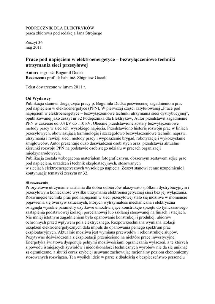 PODRĘCZNIK DLA ELEKTRYKÓW praca zbiorowa pod redakcją Jana Strojnego Zeszyt 36 maj 2011 Prace pod napięciem w elektroenergetyce – bezwyłączeniowe techniki utrzymania sieci przesyłowej Autor: mgr inż. Bogumił Dudek Recenzent: prof. dr hab. inż. Zbigniew Gacek Tekst dostarczono w lutym 2011 r. Od Wydawcy Publikacja stanowi drugą część pracy p. Bogumiła Dudka poświeconej zagadnieniom prac pod napięciem w elektroenergetyce (PPN), W pierwszej części zatytułowanej „Prace pod napięciem w elektroenergetyce – bezwyłączeniowe techniki utrzymania sieci dystrybucyjnej”, opublikowanej jako zeszyt nr 32 Podręcznika dla Elektryków, Autor przedstawił zagadnienie PPN w zakresie od 0,4 kV do 110 kV. Obecnie przedstawione zostały bezwyłączeniowe metody pracy w sieciach wysokiego napięcia. Przedstawiono historię rozwoju prac w liniach przesyłowych, obowiązującą terminologię i szczegółowo bezwyłączeniowe techniki napraw, utrzymania i rewizji sieci, metody pracy i wyposażenie brygad, robotyzację i wykorzystanie śmigłowców, Autor prezentuje dużo doświadczeń osobistych oraz przedstawia aktualne kierunki rozwoju PPN na podstawie osobistego udziału w pracach organizacji międzynarodowych. Publikacja została wzbogacona materiałem fotograficznym, obszernym zestawem zdjęć prac pod napięciem, urządzeń i technik eksploatacyjnych, stosowanych w sieciach elektroenergetycznych wysokiego napięcia. Zeszyt stanowi cenne uzupełnienie i kontynuację tematyki zeszytu nr 32. Streszczenie Priorytetowe utrzymanie zasilania dla dobra odbiorców ukazywało spółkom dystrybucyjnym i przesyłowym konieczność wysiłku utrzymania elektroenergetycznej sieci bez jej wyłączania. Rozwinięcie techniki prac pod napięciem w sieci przesyłowej stało się możliwe w momencie pojawienia się tworzyw sztucznych, których wytrzymałość mechaniczna i elektryczna osiągnęła wysokie parametry użytkowe umożliwiające konstrukcje sprzętu do tymczasowego zastąpienia podstawowej izolacji porcelanowej lub szklanej stosowanej na liniach i stacjach. Nie mniej istotnym zagadnieniem było opanowanie konstrukcji i produkcji ubiorów ochronnych przed wpływem pola elektrycznego. Rozpowszechniana wymiana izolacji urządzeń elektroenergetycznych dała impuls do opanowania pełnego spektrum prac eksploatacyjnych. Aktualnie możliwa jest wymiana przewodów i rekonstrukcje słupów. Pozytywne doświadczenia z eksploatacji przeniesiono na niektóre prace inwestycyjne. Energetyka światowa dysponuje pełnymi możliwościami ograniczania wyłączeń, a te których z powodu istniejących żywiołów i niedoskonałości technicznych wyrobów nie da się uniknąć są ograniczane, a skutki coraz szybciej usuwane zachowując racjonalny poziom ekonomiczny stosowanych rozwiązań. Ten wysiłek idzie w parze z dbałością o bezpieczeństwo personelu Abstract Maintenance and repairs of the overhead transmission lines in electric power system have to be carried out without switching off the supply. The development of technology of live-line working became important and feasible for the high-voltage transmission lines, when synthetic materials with high electrical and mechanical parameters began to substitute the traditional porcelain or glass insulation of overhead lines and power substations. The replacement of insulators gave an impulse for a large spectrum of operational procedures to carry works without switching off the supply. Currently, replacement of wires and reconstruction of poles and masts are also achievable. World power engineering has now a full capability to limit the duration of supply interruptions and to maintain the economical level of network maintenance. The contemporary achievements are closely linked with the care of work safety of operational staff, ensuring the uninterrupted and reliable power supply for the users. We present the application of effective operation technologies used for working in the vicinity of energized power lines and the introduction of the modern technologies in the live-line works on power transmission.(JS)