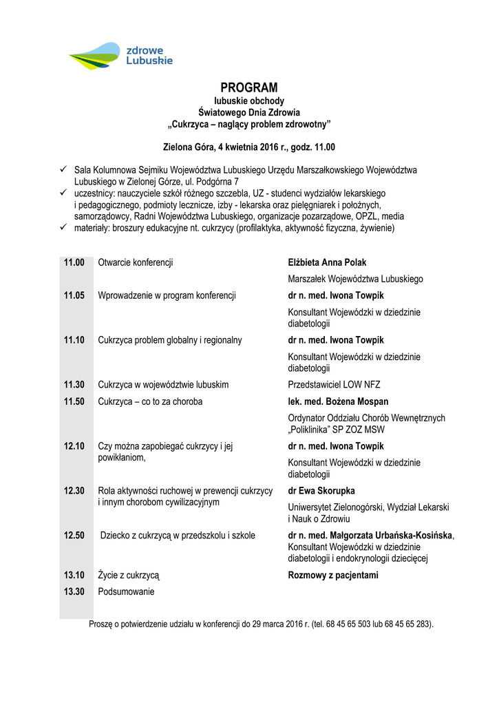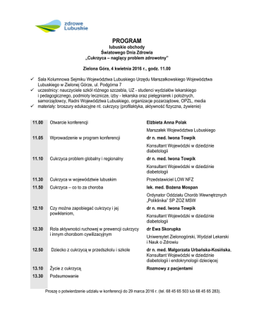 PROGRAM lubuskie obchody Światowego Dnia Zdrowia „Cukrzyca – naglący problem zdrowotny” Zielona Góra, 4 kwietnia 2016 r., godz. 11.00 Sala Kolumnowa Sejmiku Województwa Lubuskiego Urzędu Marszałkowskiego Województwa Lubuskiego w Zielonej Górze, ul. Podgórna 7 uczestnicy: nauczyciele szkół różnego szczebla, UZ - studenci wydziałów lekarskiego i pedagogicznego, podmioty lecznicze, izby - lekarska oraz pielęgniarek i położnych, samorządowcy, Radni Województwa Lubuskiego, organizacje pozarządowe, OPZL, media materiały: broszury edukacyjne nt. cukrzycy (profilaktyka, aktywność fizyczna, żywienie) 11.00 Otwarcie konferencji Elżbieta Anna Polak Marszałek Województwa Lubuskiego 11.05 Wprowadzenie w program konferencji dr n. med. Iwona Towpik Konsultant Wojewódzki w dziedzinie diabetologii 11.10 Cukrzyca problem globalny i regionalny dr n. med. Iwona Towpik Konsultant Wojewódzki w dziedzinie diabetologii 11.30 Cukrzyca w województwie lubuskim Przedstawiciel LOW NFZ 11.50 Cukrzyca – co to za choroba lek. med. Bożena Mospan Ordynator Oddziału Chorób Wewnętrznych „Poliklinika” SP ZOZ MSW 12.10 Czy można zapobiegać cukrzycy i jej powikłaniom, dr n. med. Iwona Towpik Rola aktywności ruchowej w prewencji cukrzycy i innym chorobom cywilizacyjnym dr Ewa Skorupka 12.50 Dziecko z cukrzycą w przedszkolu i szkole dr n. med. Małgorzata Urbańska-Kosińska, Konsultant Wojewódzki w dziedzinie diabetologii i endokrynologii dziecięcej 13.10 Życie z cukrzycą Rozmowy z pacjentami 13.30 Podsumowanie 12.30 Konsultant Wojewódzki w dziedzinie diabetologii Uniwersytet Zielonogórski, Wydział Lekarski i Nauk o Zdrowiu Proszę o potwierdzenie udziału w konferencji do 29 marca 2016 r. (tel. 68 45 65 503 lub 68 45 65 283).