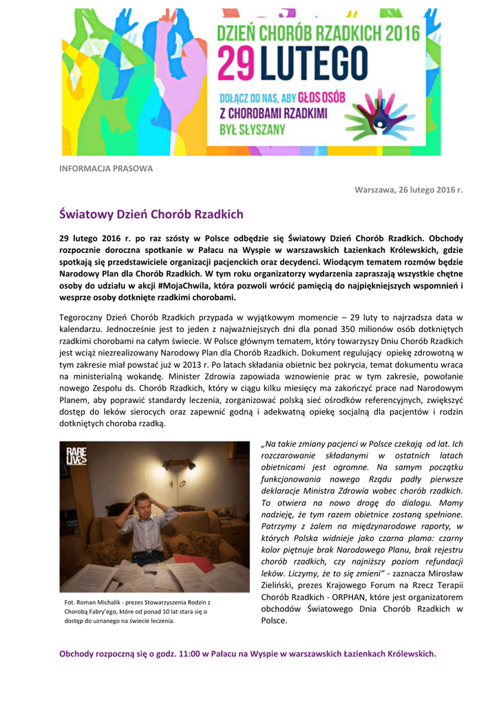 INFORMACJA PRASOWA Warszawa, 26 lutego 2016 r. Światowy Dzień Chorób Rzadkich 29 lutego 2016 r. po raz szósty w Polsce odbędzie się Światowy Dzień Chorób Rzadkich. Obchody rozpocznie doroczna spotkanie w Pałacu na Wyspie w warszawskich Łazienkach Królewskich, gdzie spotkają się przedstawiciele organizacji pacjenckich oraz decydenci. Wiodącym tematem rozmów będzie Narodowy Plan dla Chorób Rzadkich. W tym roku organizatorzy wydarzenia zapraszają wszystkie chętne osoby do udziału w akcji #MojaChwila, która pozwoli wrócić pamięcią do najpiękniejszych wspomnień i wesprze osoby dotknięte rzadkimi chorobami. Tegoroczny Dzień Chorób Rzadkich przypada w wyjątkowym momencie – 29 luty to najrzadsza data w kalendarzu. Jednocześnie jest to jeden z najważniejszych dni dla ponad 350 milionów osób dotkniętych rzadkimi chorobami na całym świecie. W Polsce głównym tematem, który towarzyszy Dniu Chorób Rzadkich jest wciąż niezrealizowany Narodowy Plan dla Chorób Rzadkich. Dokument regulujący opiekę zdrowotną w tym zakresie miał powstać już w 2013 r. Po latach składania obietnic bez pokrycia, temat dokumentu wraca na ministerialną wokandę. Minister Zdrowia zapowiada wznowienie prac w tym zakresie, powołanie nowego Zespołu ds. Chorób Rzadkich, który w ciągu kilku miesięcy ma zakończyć prace nad Narodowym Planem, aby poprawić standardy leczenia, zorganizować polską sieć ośrodków referencyjnych, zwiększyć dostęp do leków sierocych oraz zapewnić godną i adekwatną opiekę socjalną dla pacjentów i rodzin dotkniętych choroba rzadką. Fot. Roman Michalik - prezes Stowarzyszenia Rodzin z Chorobą Fabry’ego, które od ponad 10 lat stara się o dostęp do uznanego na świecie leczenia. „Na takie zmiany pacjenci w Polsce czekają od lat. Ich rozczarowanie składanymi w ostatnich latach obietnicami jest ogromne. Na samym początku funkcjonowania nowego Rządu padły pierwsze deklaracje Ministra Zdrowia wobec chorób rzadkich. To otwiera na nowo drogę do dialogu. Mamy nadzieję, że tym razem obietnice zostaną spełnione. Patrzymy z żalem na międzynarodowe raporty, w których Polska widnieje jako czarna plama: czarny kolor piętnuje brak Narodowego Planu, brak rejestru chorób rzadkich, czy najniższy poziom refundacji leków. Liczymy, że to się zmieni” - zaznacza Mirosław Zieliński, prezes Krajowego Forum na Rzecz Terapii Chorób Rzadkich - ORPHAN, które jest organizatorem obchodów Światowego Dnia Chorób Rzadkich w Polsce. Obchody rozpoczną się o godz. 11:00 w Pałacu na Wyspie w warszawskich Łazienkach Królewskich. #MojaChwila W tym roku hasłem Dnia Chorób Rzadkich jest „Dołącz do nas, aby głos osób z chorobami rzadkimi był słyszany”. Dlatego organizatorzy zapraszają wszystkie chętne osoby do włączenia się w inicjatywę #MojaChwila. „Szczególne chwile w życiu to motyw przewodni tegorocznych obchodów. Życie każdego z nas i osób zdrowych i dotkniętych chorobą - składa się z magicznych momentów, do których wracamy z radością. Okazuje się, że wspominamy bardzo podobne wydarzenia, a znacznie więcej nas łączy niż dzieli. Niech nadchodzący Dzień Chorób Rzadkich będzie okazją do wspomnień i kolejną ważną chwilą, którą zapiszemy w pamięci, wspólnie wspierając polskich pacjentów” - mówi Stanisław Maćkowiak, wiceprezes Krajowego Forum na Rzecz Terapii Chorób Rzadkich. Aby włączyć się w inicjatywę wystarczy: 1. wypełnić mapę chwil, która pobrać można ze strony www.nadziejawgenach.pl/aktualnosci/59Dzien_Chorob_Rzadkich_2016_.html 2. zrobić jej zdjęcie 3. opublikować fotografię na portalu Facebook lub Instagram oznaczając ją #MojaChwila #WspieramDzieńChoróbRzadkich Szczegóły na stronie wydarzenia: www.facebook.com/events/517265645145413/ Międzynarodowe święto Z okazji obchodów Dnia Chorób Rzadkich powstał oficjalny film przetłumaczony na 20 języków. Materiał będzie towarzyszył wydarzeniom dedykowanym chorobom rzadkim, organizowanym w ponad 80 krajach na całym świecie. Oto polska wersja filmu: www.youtube.com/watch?v=HQK56E6p2AQ&feature=youtu.be Choroby rzadkie w liczbach Choroby rzadkie dotykają od 6 do 8 % społeczeństwa, czyli nawet 2-3 mln Polaków. Do tej pory rozpoznano ponad 6 tysięcy chorób rzadkich. 75% z nich dotka dzieci. Spośród zarejestrowanych w Unii Europejskiej 87 leków sierocych, w Polsce pełnej refundacji podlega jedynie 21 z nich. „W Polsce brakuje rejestru chorób rzadkich - nie wiemy dokładnie ilu jest pacjentów, ani ile spośród rzadkich chorób występuje w naszym kraju. Nie mamy też centrów referencyjnych, które specjalizują się w ich diagnostyce i leczeniu. Obecnie postawienie diagnozy trwa latami, wiele osób nie wie, na co choruje lub nawet nie wie, że choruje. W Unii Europejskiej już dawno zdecydowano, że choroby rzadkie należy traktować ze szczególną uwagą, aby wyrównać szanse dla pacjentów i ich rodzin. To choroby trwające całe życie. Wymagają specjalnej drogi postępowania medycznego. Trzeba dostosować system opieki społecznej, stworzyć takie wsparcie, by nie doprowadzić do ubóstwa i rozpadu rodzin. Pragniemy aby pacjenci i ich najbliżsi nie byli osamotnieni i wykluczeni społecznie. Aby czuli, że nie są nam obojętni. W tym szczególnym Dniu zwracamy uwagę nie tylko na osoby chore, ale także na ich bliskich.” - dodaje Mirosław Zieliński. Więcej informacji na temat tegorocznych Obchodów Dnia Chorób Rzadkich odnaleźć można na stronie www.dzienchorobrzadkich.pl oraz na www.facebook.com/DzienChorobRzadkich Więcej o chorobach rzadkich: www.nadziejawgenach.pl Kontakt prasowy: Agnieszka Bemowska, kom. 664 43 43 34, e-mail: [email protected] www.rzadkiechoroby.pl
