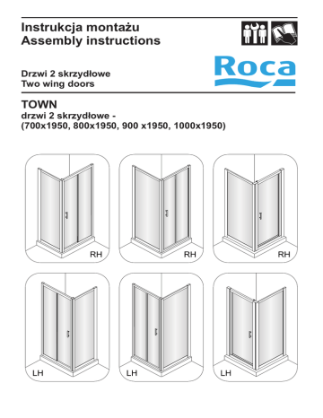 Instrukcja montażu Assembly instructions Drzwi 2 skrzydłowe Two wing doors TOWN drzwi 2 skrzydłowe (700x1950, 800x1950, 900 x1950, 1000x1950) Szanowni Państwo, Dziękujemy za zaufanie, które wyraziliście Państwo, decydując się na zakup naszego wyrobu. Dołożyliśmy wszelkich starań, aby produkt ten całkowicie spełnił Państwa oczekiwania. Od lat oferujemy produkty o najwyższej światowej jakości. Szczególną uwagę przywiązujemy do trwałości, niezawodności i bezpieczeństwa użytkowania naszych produktów. Najwyższa jakość stosowanych przez nas materiałów, ciekawa stylistyka i ergonomia urządzeń gwarantują komfort podczas kąpieli. Życzymy Państwu zadowolenia z użytkowania naszych wyrobów. Dear customers, Thank you for trusting us and buying our product! The ROCA company, one of the leaders in the European hydromassage bath market, has been offering its world class quality products for many years. The endurance, reliability and safety of our products has always been of greatest importance to us; that is why we always use materials and devices from reputable suppliers. The manual will help you learn about the shower enclosure installation and its use. In this way, you will be able to use the shower enclosure without any problems for many years to come. Have a great time and enjoy our product! KARTA GWARANCYJNA Gwarancyjna jest ważna jedynie wraz z dowodem zakupu. Uzupełnia sprzedawca Nazwa wyrobu: ………………………………………………..Data sprzedaży: …………………… Typ. Model …………………………………………………… Paragon/faktura numer ………………… …........……………………….. Pieczęć i podpis sprzedawcy Naszym celem jest zapewnienie użytkownikowi wyrobu ROCA satysfakcji z używania przez wiele lat. WARUNKI GWARANCJI PRODUCENTA 1. 2. 3. 4. 5. 6. 7. 8. 9. 10. 11. 12. 13. 14. 15. 16. Uprawnionym z tytułu niniejszej gwarancji jest konsument (zwany dalej Kupującym). Gwarantem jest ROCA Spółka z o.o. z siedzibą w Gliwicach, ul. Wyczółkowskiego 20, Polska. Gwarant zapewnia, iż wyrób jest dobry jakościowo (wolny od wad) i zapewnia sprawne działanie wyrobów we wskazanych poniżej okresach: Kategoria wyrobu Okres gwarancji Kabina prysznicowa 2 lata Montaż zgodny z wymaganiami Gwaranta powinien zostać potwierdzony w Karcie Gwarancyjnej. Bieg terminu gwarancji rozpoczyna się od daty sprzedaży potwierdzonej przez sprzedawcę w Karcie Gwarancyjnej. Jeżeli jakość wyrobu lub jego sprawność nie jest zgodna z zapewnieniami Gwaranta, Kupujący może żądać doprowadzenia towaru do stanu zgodnego z umową poprzez: a) nieodpłatną naprawę, albo b) nieodpłatną wymianę towaru na nowy w sytuacji gdy: ujawnionej wady lub niesprawności nie da się usunąć, w okresie gwarancji dokonano 4 napraw tego samego podzespołu, a naprawiany wyrób nadal wykazuje wady lub niesprawności uniemożliwiające używanie go zgodnie z przeznaczeniem. Zauważone wady i uszkodzenia wyrobu należy zgłaszać sprzedawcy w terminie 30 dni od ich wystąpienia pod rygorem utraty praw z gwarancji. W przypadku braku kontaktu ze sprzedawcą należy powiadomić Dział Serwisu ROCA w Gliwicach w formie pisemnej, w terminie określonym powyżej. Wady lub niesprawność wyrobu ujawnione w okresie gwarancji i niezawinione przez uprawnionego z gwarancji będą usuwane nieodpłatnie w terminie 14 dni od przyjęcia zgłoszenia. Wszelkie naprawy wykonywane są u Kupującego. Gwarancja nie obejmuje wad i niesprawności powstałych na skutek niewłaściwego użytkowania wyrobu lub jego części oraz normalnego zużycia eksploatacyjnego. W szczególności gwarancją nie są objęte: a) naturalne zużycia wyrobu, b) mechaniczne uszkodzenie powierzchni wyrobu i osprzętu, c) uszkodzenia powstałe na skutek konserwacji dokonanej w sposób sprzeczny z zaleceniami zawartymi w instrukcji obsługi d) uszkodzenia termiczne, chemiczne, trwałe zabrudzenia powstałe po dniu wydania towaru, e) uszkodzenia powstałe w wyniku zdarzeń zewnętrznych, losowych i klęsk żywiołowych, f) wady spowodowane montażem i użytkowaniem wyrobu niezgodnym z instrukcją. Wszelkie przeróbki wyrobu lub zmiany w wyrobie dokonywane przez nieuprawnione osoby powodują utratę gwarancji. Koszty nieuzasadnionej reklamacji, w szczególności koszty dojazdów i robocizny ustalane według Cennika Gwaranta obowiązującego przy wykonywaniu usług serwisowych, koszty oględzin badań i ekspertyz ponosi Kupujący. Gwarant nie zwraca kosztów związanych z uszkodzeniami powierzchni ścian i posadzki (np. glazury, terakoty, boazerii, itd.) oraz innych elementów lokalu spowodowanymi bezpośrednio koniecznością dokonania naprawy wyrobu. Realizacja uprawnień płynących z niniejszej gwarancji nastąpić może wyłącznie na terytorium Rzeczypospolitej Polskiej. Niniejsza gwarancja nie wyłącza, nie ogranicza ani nie zawiesza uprawnień Klienta wynikających z niezgodności towaru z umową . Po upływie terminu gwarancji ROCA zapewnia odpłatny serwis pogwarancyjny. Kontakt w sprawie realizacji gwarancji: ROCA POLSKA Sp. z o.o. tel.: (032) 33 94 100 fax: (032) 33 94 101 ul. Wyczółkowskiego 20, 44-109 Gliwice www.roca.pl UWAGI : 1. Nie należy korzystać przez 24 godziny z kabiny prysznicowej po zakończeniu jej montażu. 2. Nie należy używać środków żrących ani ściernych do czyszczenia kabiny. 3. Nie należy pozostawiać dzieci bez opieki osób dorosłych w łazience. 4. Ze względów bezpieczeństwa nie należy korzystać z kabiny po spożyciu alkoholu. 5. W przypadku problemów należy skontaktować się z serwisem firmy ROCA. 6. Należy zachować niniejszą instrukcję do użytku w przyszłości. WARNING : 1. Do not use the shower enclosure within 24 hours after assembly. 2. Do not use caustic or abrasive cleaner when cleaning the shower enclosure. 3. With regard to safety, do not let kids play in the shower room. 4. With regard to safety, 