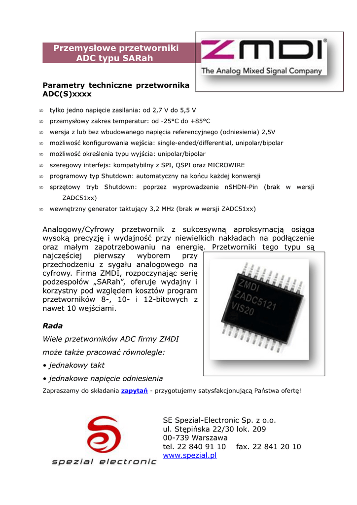 Przemysłowe przetworniki ADC typu SARah Parametry techniczne przetwornika ADC(S)xxxx • tylko jedno napięcie zasilania: od 2,7 V do 5,5 V • przemysłowy zakres temperatur: od -25°C do +85°C • wersja z lub bez wbudowanego napięcia referencyjnego (odniesienia) 2,5V • możliwość konfigurowania wejścia: single-ended/differential, unipolar/bipolar • możliwość określenia typu wyjścia: unipolar/bipolar • szeregowy interfejs: kompatybilny z SPI, QSPI oraz MICROWIRE • programowy typ Shutdown: automatyczny na końcu każdej konwersji • sprzętowy tryb Shutdown: poprzez wyprowadzenie nSHDN-Pin (brak w wersji ZADC51xx) • wewnętrzny generator taktujący 3,2 MHz (brak w wersji ZADC51xx) Analogowy/Cyfrowy przetwornik z sukcesywną aproksymacją osiąga wysoką precyzję i wydajność przy niewielkich nakładach na podłączenie oraz małym zapotrzebowaniu na energię. Przetworniki tego typu są najczęściej pierwszy wyborem przy przechodzeniu z sygału analogowego na cyfrowy. Firma ZMDI, rozpoczynając serię podzespołów „SARah”, oferuje wydajny i korzystny pod względem kosztów program przetworników 8-, 10- i 12-bitowych z nawet 10 wejściami. Rada Wiele przetworników ADC firmy ZMDI może także pracować równolegle: • jednakowy takt • jednakowe napięcie odniesienia Zapraszamy do składania zapytań - przygotujemy satysfakcjonującą Państwa ofertę! SE Spezial-Electronic Sp. z o.o. ul. Stępińska 22/30 lok. 209 00-739 Warszawa tel. 22 840 91 10 fax. 22 841 20 10 www.spezial.pl