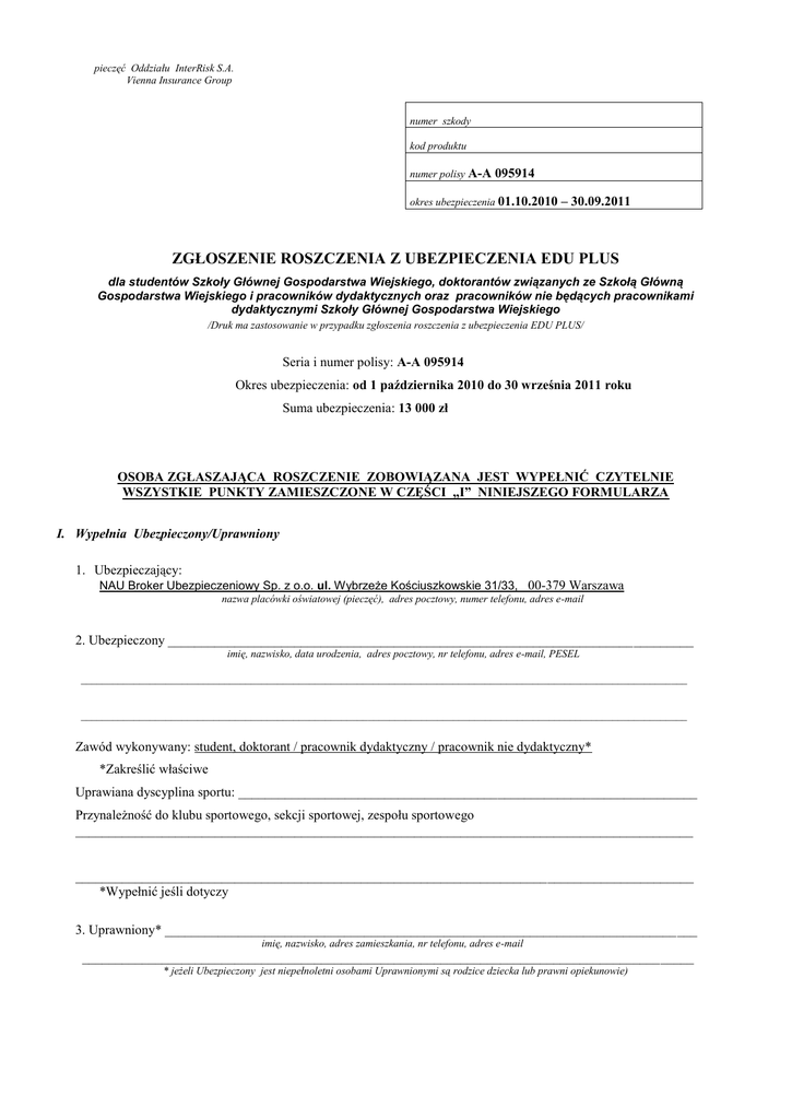 pieczęć Oddziału InterRisk S.A. Vienna Insurance Group numer szkody kod produktu numer polisy A-A 095914 okres ubezpieczenia 01.10.2010 – 30.09.2011 ZGŁOSZENIE ROSZCZENIA Z UBEZPIECZENIA EDU PLUS dla studentów Szkoły Głównej Gospodarstwa Wiejskiego, doktorantów związanych ze Szkołą Główną Gospodarstwa Wiejskiego i pracowników dydaktycznych oraz pracowników nie będących pracownikami dydaktycznymi Szkoły Głównej Gospodarstwa Wiejskiego /Druk ma zastosowanie w przypadku zgłoszenia roszczenia z ubezpieczenia EDU PLUS/ Seria i numer polisy: A-A 095914 Okres ubezpieczenia: od 1 października 2010 do 30 września 2011 roku Suma ubezpieczenia: 13 000 zł OSOBA ZGŁASZAJĄCA ROSZCZENIE ZOBOWIĄZANA JEST WYPEŁNIĆ CZYTELNIE WSZYSTKIE PUNKTY ZAMIESZCZONE W CZĘŚCI „I” NINIEJSZEGO FORMULARZA I. Wypełnia Ubezpieczony/Uprawniony 1. Ubezpieczający: NAU Broker Ubezpieczeniowy Sp. z o.o. ul. Wybrzeże Kościuszkowskie 31/33, 00-379 Warszawa nazwa placówki oświatowej (pieczęć), adres pocztowy, numer telefonu, adres e-mail 2. Ubezpieczony _______________________________________________________________________________ imię, nazwisko, data urodzenia, adres pocztowy, nr telefonu, adres e-mail, PESEL __________________________________________________________________________________________________________________ __________________________________________________________________________________________________________________ Zawód wykonywany: student, doktorant / pracownik dydaktyczny / pracownik nie dydaktyczny* *Zakreślić właściwe Uprawiana dyscyplina sportu: _____________________________________________________________________ Przynależność do klubu sportowego, sekcji sportowej, zespołu sportowego _____________________________________________________________________________________________ _____________________________________________________________________________________________ *Wypełnić jeśli dotyczy 3. Uprawniony* ________________________________________________________________________________ imię, nazwisko, adres zamieszkania, nr telefonu, adres e-mail ____________________________________________________________________________________________ * jeżeli Ubezpieczony jest niepełnoletni osobami Uprawnionymi są rodzice dziecka lub prawni opiekunowie) 4. Rodzaj świadczenia o jakie ubiega się Ubezpieczony / Uprawniony ( - właściwe zaznaczyć ”x”) Uszczerbek na zdrowiu: - w wyniku nieszczęśliwego wypadku - w wyniku ataku padaczki Śmierć: - Ubezpieczonego w wyniku nieszczęśliwego wypadku - Ubezpieczonego w wyniku sepsy - jednego lub obojga rodziców w następstwie nieszczęśliwych wypadków Pogryzienie / pokąsanie przez zwierzęta, ukąszenia przez owady Bolerioza lub kleszczowe zapalenie mózgu Zwrot kosztów: - nabycia wyrobów medycznych, będących przedmiotami ortopedycznymi i środków pomocniczych (rodzaj i wysokość kosztów…………………….… ………………………………………………………………………..….) - przeszkolenia zawodowego inwalidów (rodzaj i wysokość kosztów…………… ………………………………………………………………………..….) Pobyt w szpitalu: Zwrot kosztów - w wyniku nieszczęśliwego wypadku - leczenia (rodzaj i wysokość kosztów………………………………….…….… …………………………………………………………………..………..….) - leczenia stomatologicznego (rodzaj i wysokość kosztów…………………….… …………………………………………………………………………….….) Zasiłek dzienny za każdy dzień pełnej niezdolności Ubezpieczonego do nauki lub pracy od………………………….... do………………………………………… Trwałe inwalidztwo częściowe Całkowite inwalidztwo 5. Data i miejsce wypadku/ data ujawnienia choroby _________________________________________________ 6. Data zgonu ______________________________ 7. 1) W przypadku nieszczęśliwego wypadku: przyczyna, okoliczności i przebieg wypadku, nazwiska i adresy ewentualnych świadków wypadku, rodzaj doznanych obrażeń (podać dokładnie i wyczerpująco)_________ ______________________________________________________________________________________ ______________________________________________________________________________________ _____________________________________________________________________________________ 2) W przypadku choroby: rozpoznanie, przebieg leczenia, nazwisko lekarza prowadzącego leczenie________ ______________________________________________________________________________________ ______________________________________________________________________________________ ______________________________________________________________________________________ 8. Czy narząd (-y) opisane w pkt. 7 był (-y) uszkodzony (-e) przed zajściem zdarzenia w wyniku wypadku lub choroby ________________________________________________________________________________ 9. Czy Ubezpieczony był w chwili wypadku pod wpływem alkoholu, narkotyków lub innych środków o podobnym działaniu ______________________________________________________________________ 10. Czy do wypadku doszło w chwili prowadzenia przez Ubezpieczonego pojazdu________________________ samochodu, motocyklu, roweru, inne Proszę podać numer i kategorię uprawnień do ich prowadzenia ____________________________________ 11. Jeżeli w związku z wypadkiem jest prowadzone postępowanie karne lub cywilne, proszę podać nazwę i adres odpowiedniej jednostki policji, prokuratury lub sądu, nr sprawy____________________________________ 2 12. Kto i gdzie udzielił Ubezpieczonemu pierwszej pomocy bezpośrednio po wypadku ____________________ _______________________________________________________________________________________ Jeżeli pierwszej pomocy udzielił lekarz, prosimy o dostarczenie kserokopii dokument
