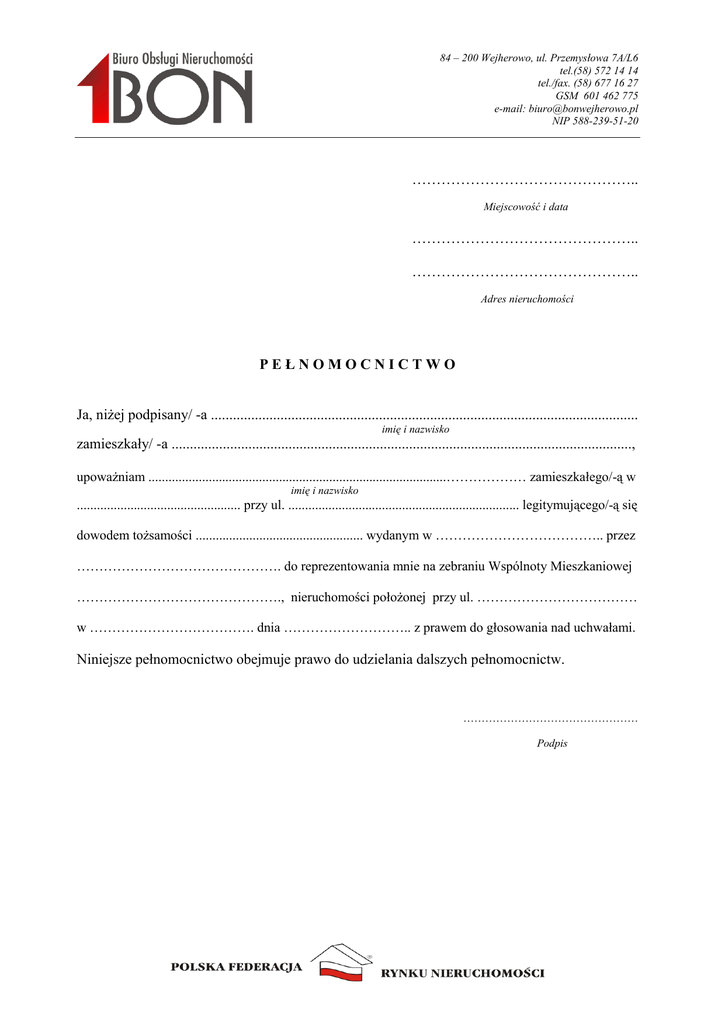 84 – 200 Wejherowo, ul. Przemysłowa 7A/L6 tel.(58) 572 14 14 tel./fax. (58) 677 16 27 GSM 601 462 775 e-mail: [email protected] NIP 588-239-51-20 ……………………………………….. Miejscowość i data ……………………………………….. ……………………………………….. Adres nieruchomości PEŁNOMOCNICTWO Ja, niżej podpisany/ -a ..................................................................................................................... imię i nazwisko zamieszkały/ -a .............................................................................................................................., upoważniam .........................................................................................……………… zamieszkałego/-ą w imię i nazwisko ................................................. przy ul. ..................................................................... legitymującego/-ą się dowodem tożsamości .................................................. wydanym w ……………………………….. przez ………………………………………. do reprezentowania mnie na zebraniu Wspólnoty Mieszkaniowej ………………………………………., nieruchomości położonej przy ul. ……………………………… w ………………………………. dnia ……………………….. z prawem do głosowania nad uchwałami. Niniejsze pełnomocnictwo obejmuje prawo do udzielania dalszych pełnomocnictw. ………………………………………… Podpis