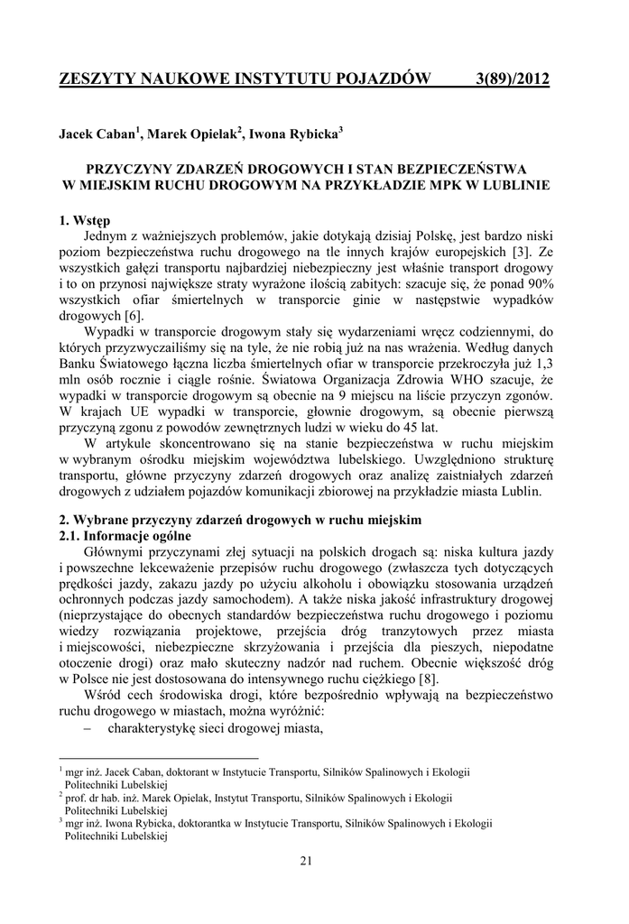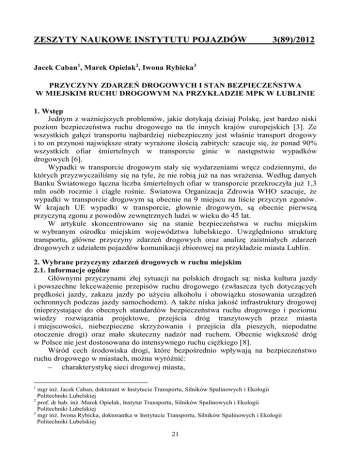 ZESZYTY NAUKOWE INSTYTUTU POJAZDÓW 3(89)/2012 Jacek Caban1, Marek Opielak2, Iwona Rybicka3 PRZYCZYNY ZDARZEŃ DROGOWYCH I STAN BEZPIECZEŃSTWA W MIEJSKIM RUCHU DROGOWYM NA PRZYKŁADZIE MPK W LUBLINIE 1. Wstęp Jednym z ważniejszych problemów, jakie dotykają dzisiaj Polskę, jest bardzo niski poziom bezpieczeństwa ruchu drogowego na tle innych krajów europejskich [3]. Ze wszystkich gałęzi transportu najbardziej niebezpieczny jest właśnie transport drogowy i to on przynosi największe straty wyrażone ilością zabitych: szacuje się, że ponad 90% wszystkich ofiar śmiertelnych w transporcie ginie w następstwie wypadków drogowych [6]. Wypadki w transporcie drogowym stały się wydarzeniami wręcz codziennymi, do których przyzwyczailiśmy się na tyle, że nie robią już na nas wrażenia. Według danych Banku Światowego łączna liczba śmiertelnych ofiar w transporcie przekroczyła już 1,3 mln osób rocznie i ciągle rośnie. Światowa Organizacja Zdrowia WHO szacuje, że wypadki w transporcie drogowym są obecnie na 9 miejscu na liście przyczyn zgonów. W krajach UE wypadki w transporcie, głownie drogowym, są obecnie pierwszą przyczyną zgonu z powodów zewnętrznych ludzi w wieku do 45 lat. W artykule skoncentrowano się na stanie bezpieczeństwa w ruchu miejskim w wybranym ośrodku miejskim województwa lubelskiego. Uwzględniono strukturę transportu, główne przyczyny zdarzeń drogowych oraz analizę zaistniałych zdarzeń drogowych z udziałem pojazdów komunikacji zbiorowej na przykładzie miasta Lublin. 2. Wybrane przyczyny zdarzeń drogowych w ruchu miejskim 2.1. Informacje ogólne Głównymi przyczynami złej sytuacji na polskich drogach są: niska kultura jazdy i powszechne lekceważenie przepisów ruchu drogowego (zwłaszcza tych dotyczących prędkości jazdy, zakazu jazdy po użyciu alkoholu i obowiązku stosowania urządzeń ochronnych podczas jazdy samochodem). A także niska jakość infrastruktury drogowej (nieprzystające do obecnych standardów bezpieczeństwa ruchu drogowego i poziomu wiedzy rozwiązania projektowe, przejścia dróg tranzytowych przez miasta i miejscowości, niebezpieczne skrzyżowania i przejścia dla pieszych, niepodatne otoczenie drogi) oraz mało skuteczny nadzór nad ruchem. Obecnie większość dróg w Polsce nie jest dostosowana do intensywnego ruchu ciężkiego [8]. Wśród cech środowiska drogi, które bezpośrednio wpływają na bezpieczeństwo ruchu drogowego w miastach, można wyróżnić: charakterystykę sieci drogowej miasta, mgr inż. Jacek Caban, doktorant w Instytucie Transportu, Silników Spalinowych i Ekologii Politechniki Lubelskiej prof. dr hab. inż. Marek Opielak, Instytut Transportu, Silników Spalinowych i Ekologii Politechniki Lubelskiej 3 mgr inż. Iwona Rybicka, doktorantka w Instytucie Transportu, Silników Spalinowych i Ekologii Politechniki Lubelskiej 1 2 21 warunki atmosferyczne, jezdni oraz charakterystykę oznaczenia drogi, charakterystykę techniczno – eksploatacyjną nawierzchni drogowej, parametry ruchu, takie jak natężenie, struktura rodzajowa i kierunkowa ruchu, parametry geometryczne elementów sieci drogowej, cechy organizacji. Zasadniczy wpływ na poziom bezpieczeństwo ruchu drogowego w mieście ma charakterystyka jego sieci drogowej, a w szczególności: poziom obsługi komunikacyjnej miasta określony stopniem dostosowania elementów sieci drogowej do potrzeb ruchu, stopień obciążenia sieci określony stosunkiem natężeń ruchu występujących na jej elementach do przepustowości tych elementów, charakterystyka prędkości i dostępności na poszczególnych elementach sieci, kolizyjność miejsc przecinania się tras różnych rodzajów użytkowników, zastosowane systemy i sposoby sterowania ruchem, kolizyjność w miejscach przecinania się ulic, sposoby lokalizowania i urządzania przystanków transportu zbiorowego, miejsca lokalizowania obiektów generujących duży ruch samochodowy i pieszy oraz sposoby ich podłączenia do sieci. Wady układu sieci drogowej miasta prowadzące do: przeciążenia ruchem elementów sieci drogowej, powstania nadmiernej liczby potencjalnych punktów kolizji, dużych różnic prędkości miedzy pojazdami, nadmiernej prędkości pojazdów w stosunku do poziomu bezpieczeństwa jakie stwarza środowisko drogi, dużych utrudnień dla ruchu pieszego i rowerowego. Rys. 1. Ogólna liczba wypadków drogowych i ich ofiar śmiertelnych w latach 2000 ÷ 2010, źródło KGP W zdecydowanej większości polskich miast brak jest wyraźnego podziału sieci drogowej na komunikacyjne strefy prędkości i dostępności. Z kolei w obszarach mieszkaniowych ulice przeznaczone do ruchu lokalnego projektuje się o geometrii zachęcającej kierowców do rozwijania dużych prędkości, o pełnej dostępności oraz do każdego rodzaju ruchu drogowego. W konsekwencji ciągi uliczne charakteryzują się dużymi natężeniami ruchu, dużymi prędkościami miedzy pojazdami [5]. 22 Jak widać z zestawienia (rys. 1.) oficjalne statystyki Komendy Głównej Policji, zaznacza się powolna tendencja spadkowa zdarzeń drogowych i ich ofiar. Z liczby 57331 wypadków drogowych pochłaniających 6294 ofiary śmiertelne w 2000 roku spadek do liczby 38832 wypadków w roku 2010 z liczbą 3907 ofiar. Łączna liczba wypadków drogowych w tym okresie wyniosła 543430, w których śmierć poniosło 59193 osoby. Liczba ofiar śmiertelnych stanowi około 11% całkowitej liczby zaistniałych wypadków drogowych (10,89%), w rozpatrywanym przedziale czasowym. Rysunek 2 przedstawia ogólną liczbę zdarzeń drogowych, ofiar tych wypadków oraz liczbę rannych zaistniałych w województwie lubelskim w latach 2008 ÷ 2011. Rys. 2. Ogólne zestawienie zdarzeń drogowych zaistniałych w województwie lubelskim Na poziom bezpieczeństwa ruchu drogowego ma istotny wpływ charakterystyka otoczenia ulic. Na przykład na odcinkach ulic otoczonych tylko zielenią zagrożenie powstania zdarzenia drogowego