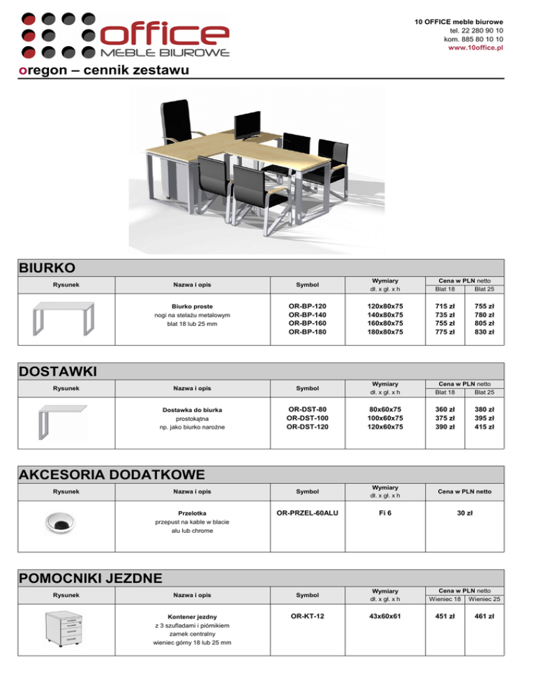 10 OFFICE meble biurowe tel. 22 280 90 10 kom. 885 80 10 10 www.10office.pl oregon – cennik zestawu BIURKO Nazwa i opis Symbol Wymiary dł. x gł. x h Biurko proste nogi na stelażu metalowym blat 18 lub 25 mm OR-BP-120 OR-BP-140 OR-BP-160 OR-BP-180 120x80x75 140x80x75 160x80x75 180x80x75 Nazwa i opis Symbol Wymiary dł. x gł. x h Dostawka do biurka prostokątna np. jako biurko narożne OR-DST-80 OR-DST-100 OR-DST-120 80x60x75 100x60x75 120x60x75 Nazwa i opis Symbol Wymiary dł. x gł. x h Cena w PLN netto Przelotka przepust na kable w blacie alu lub chrome OR-PRZEL-60ALU Fi 6 30 zł Nazwa i opis Symbol Wymiary dł. x gł. x h Cena w PLN netto Wieniec 18 Wieniec 25 Kontener jezdny z 3 szufladami i piórnikiem zamek centralny wieniec górny 18 lub 25 mm OR-KT-12 43x60x61 Rysunek Cena w PLN netto Blat 18 Blat 25 715 zł 735 zł 755 zł 775 zł 755 zł 780 zł 805 zł 830 zł DOSTAWKI Rysunek Cena w PLN netto Blat 18 Blat 25 360 zł 375 zł 390 zł 380 zł 395 zł 415 zł AKCESORIA DODATKOWE Rysunek POMOCNIKI JEZDNE Rysunek 451 zł 461 zł