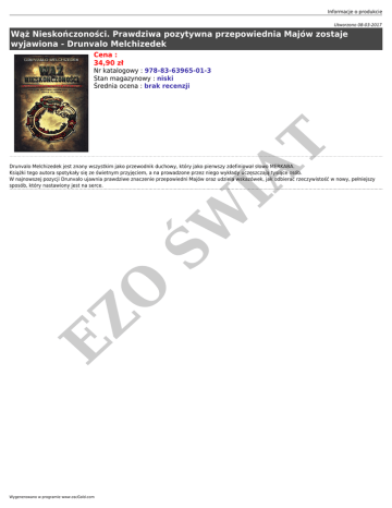 Informacje o produkcie Utworzono 08-03-2017 Wąż Nieskończoności. Prawdziwa pozytywna przepowiednia Majów zostaje wyjawiona - Drunvalo Melchizedek Cena : 34,90 zł IA T Nr katalogowy : 978-83-63965-01-3 Stan magazynowy : niski Średnia ocena : brak recenzji EZ O ŚW Drunvalo Melchizedek jest znany wszystkim jako przewodnik duchowy, który jako pierwszy zdefiniował słowo MERKABA. Książki tego autora spotykały się ze świetnym przyjęciem, a na prowadzone przez niego wykłady uczęszczają tysiące osób. W najnowszej pozycji Drunvalo ujawnia prawdziwe znaczenie przepowiedni Majów oraz udziela wskazówek, jak odbierać rzeczywistość w nowy, pełniejszy sposób, który nastawiony jest na serce. Wygenerowano w programie www.oscGold.com