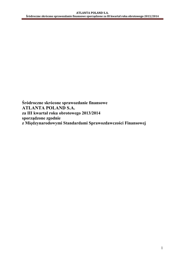 ATLANTA POLAND S.A. Śródroczne skrócone sprawozdanie finansowe sporządzone za III kwartał roku obrotowego 2013/2014 Śródroczne skrócone sprawozdanie finansowe ATLANTA POLAND S.A. za III kwartał roku obrotowego 2013/2014 sporządzone zgodnie z Międzynarodowymi Standardami Sprawozdawczości Finansowej 1 ATLANTA POLAND S.A. Śródroczne skrócone sprawozdanie finansowe sporządzone za III kwartał roku obrotowego 2013/2014 1. Wstęp Zgodnie z uchwałą nr 16 z dnia 21 czerwca 2011r. Walnego Zgromadzenia ATLANTA POLAND S.A. nastąpiła zmiana § 36 statutu Spółki w ten sposób, że dotychczasowe brzmienie tego paragrafu: „Rok obrotowy Spółki pokrywa się z rokiem kalendarzowym” Otrzymało brzmienie: „1. Z zastrzeżeniem postanowień ust. 2 i 3 rokiem obrotowym Spółki jest okres kolejnych 12 miesięcy kalendarzowych rozpoczynający się w dniu 1 lipca, a kończący się w dniu 30 czerwca następnego roku kalendarzowego. 2. Postanowienia zawarte w ust. 1 stosuje się począwszy od roku obrotowego rozpoczynającego się w dniu 1 lipca 2013r. 3. Rok obrotowy rozpoczynający się w dniu 1 stycznia 2012r. kończy się w dniu 30 czerwca 2013 roku.” W związku z powyższym , niniejszy raport kwartalny ATLANTA POLAND S.A. sporządzony za III kwartał roku obrotowego 2013/2014 zawiera: - skrócone sprawozdanie finansowe „ATLANTA POLAND” S.A. sporządzone za okres od dnia 01.01.2014 roku do dnia 31.03.2014 roku oraz dane narastająco za trzy kwartały roku obrotowego 2013/2014 w tym: sprawozdanie z sytuacji finansowej, sprawozdanie z całkowitych dochodów, sprawozdanie ze zmian w kapitale własnym oraz sprawozdanie z przepływów pieniężnych wraz z danymi porównawczymi, przy czym Emitent zwraca uwagę, iż ze względu na zmianę roku obrotowego, w bilansie sporządzonym według stanu na dzień 31.03.2013r. w rubryce „zysk (strata) netto” zaprezentowana została wysokość zysku netto osiągniętego przez Spółkę za okres obejmujący 15 miesięcy tj. od 01.01.2012r. do 31.03.2013r. - informacje dodatkowe zgodnie z Rozporządzeniem Rady Ministrów z dnia 19.02.2009 roku w sprawie informacji bieżących i okresowych przekazywanych przez emitentów papierów wartościowych oraz warunków uznawania za równoważne informacji wymaganych przepisami prawa państwa niebędącego państwem członkowskim. W opinii Emitenta ustalenie początku roku obrotowego na dzień 1 lipca a zakończenia roku obrotowego na dzień 30 czerwca kolejnego roku kalendarzowego zapewni pełną porównywalność danych finansowych dotyczących Spółki z danymi finansowymi dotyczącymi innych podmiotów działających w tej samej branży. Oświadczenie o zgodności Niniejsze sprawozdanie finansowe zostało sporządzone zgodnie z Międzynarodowymi Standardami Sprawozdawczości Finansowej („MSSF”) oraz MSSF zatwierdzonymi przez Unię Europejską (UE). MSSF obejmują standardy i interpretacje zaakceptowane przez Radę Międzynarodowych Standardów Rachunkowości oraz Komitet ds. Interpretacji Międzynarodowej Sprawozdawczości Finansowej. Niniejsze sprawozdanie finansowe zostało sporządzone przy założeniu kontynuowania działalności gospodarczej przez Spółkę. Sprawozdanie finansowe zostało sporządzone zgodnie z koncepcją kosztu historycznego, za wyjątkiem wyceny niektórych aktywów trwałych oraz aktywów finansowych, które zgodnie z MSSF wyceniane są według wartości godziwej. Sporządzenie sprawozdania finansowego zgodnie z MSSF wymaga dokonania szacunków i założeń przez Zarząd, które wpływają na wielkości wykazane w sprawozdaniu finansowym. Mimo iż, przyjęte założenia i szacunki opierają się na najlepszej wiedzy Zarządu, rzeczywiste wyniki mogą różnić się od przewidywanych. 2. Informacje ogólne, wskazanie skutków zmian w strukturze jednostki gospodarczej, w tym w wyniku połączenia jednostek gospodarczych Podstawowym przedmiotem działalności ATLANTA POLAND S.A., zgodnie ze Statutem jest: pozostałe przetwarzanie i konserwowanie owoców i warzyw ( PKD 1039Z) handel hurtowy i komisowy, z wyjątkiem handlu pojazdami mechanicznymi i motocyklami, oraz 2 ATLANTA POLAND S.A. Śródroczne skrócone sprawozdanie finansowe sporządzone za III kwartał roku obrotowego 2013/2014 handel detaliczny, z wyjątkiem sprzedaży pojazdów mechanicznych i motocykli. ATLANTA POLAND S.A. jest spółką akcyjną zarejestrowaną w Sadzie Rejonowym w Gdańsku, pod numerem KRS 0000162799 przez VII Wydział Gospodarczy Krajowego Rejestru Sądowego (wpis dnia 26 maja 2003 roku), posługującą się numerem identyfikacji podatkowej NIP : 583-00-13-129 nadanym przez Pierwszy Urząd Skarbowy w Gdańsku. Spółka posiada numer statystyczny REGON 190297892. Siedziba Spółki mieści się na ul. Załogowej 17, 80-557 Gdańsk. Kapitał akcyjny jednostki wynosi: 6.091.904,00 zł. ATLANTA POLAND S.A. powstała na skutek przekształcenia ATLANTA POLAND Spółki z ograniczoną odpowiedzialnością z siedzibą w Gdańsku w spółkę akcyjną. ATLANTA POLAND Spółka z ograniczoną odpowiedzialnością została zawiązana aktem założycielskim z dnia 25 października 1993r. przez Dariusza Mazura. Przekształcenie ATLANTA POLAND Spółki z ograniczoną odpowiedzialnością w spółkę akcyjną nastąpiło 1 lipca 1999 roku. W styczniu 2005 roku ATLANTA POLAND S.A. zadebiutowała na Warszawskiej Giełdzie Papierów Wartościowych, stając się spółką publiczną. Według klasyfikacji Giełdy Papierów Wartościowych w Warszawie Spółka działa w sektorze handlowym. ATLANTA POLAND S.A. zajmuje się handlem surowcami do produkcji cukierniczej i piekarniczej, a od 1998 roku również przetwórstwem orzechów, które polega na ich oczyszczaniu, prażeniu w wysokiej temperaturze lub smażeniu w oleju, blanszowaniu, sortowaniu, krojeniu i pakowaniu próżniowym. Ponadto Spółka wytwarza masy: marcepanową i arachipanową oraz miazgę z orzechów ziemnych, laskowych i sezamu. W swojej ofercie Spó