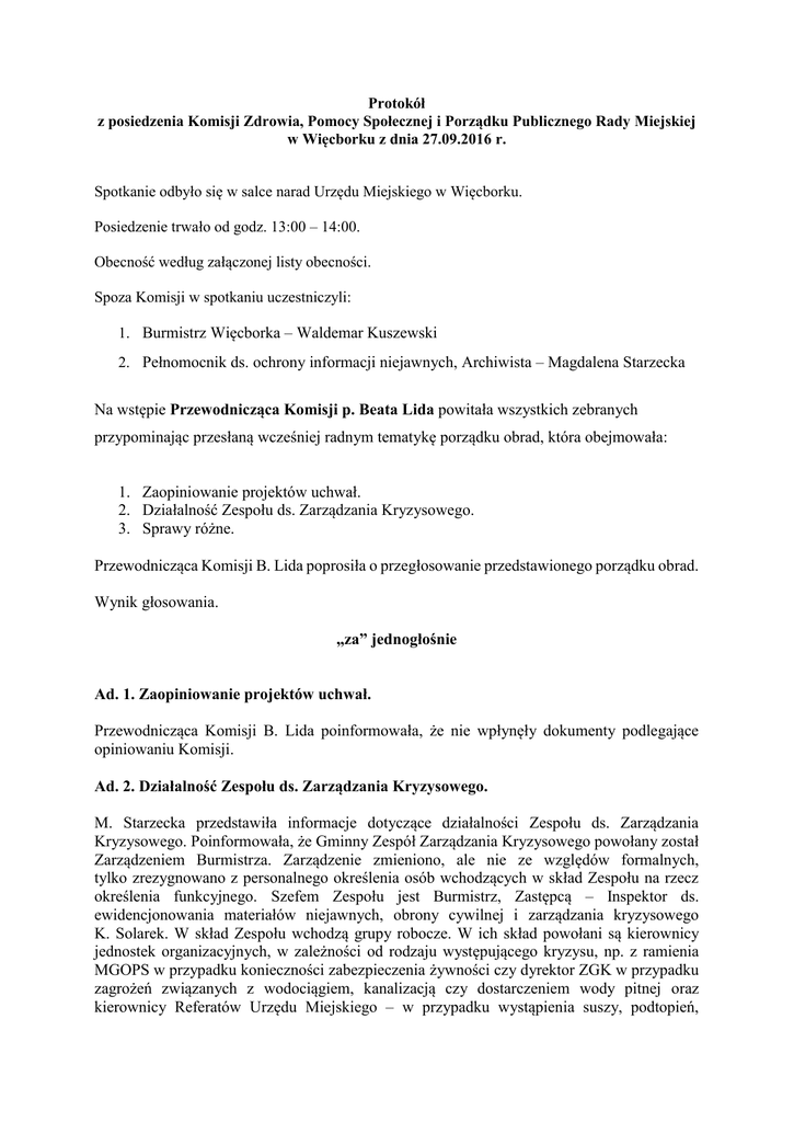Protokół z posiedzenia Komisji Zdrowia, Pomocy Społecznej i Porządku Publicznego Rady Miejskiej w Więcborku z dnia 27.09.2016 r. Spotkanie odbyło się w salce narad Urzędu Miejskiego w Więcborku. Posiedzenie trwało od godz. 13:00 – 14:00. Obecność według załączonej listy obecności. Spoza Komisji w spotkaniu uczestniczyli: 1. Burmistrz Więcborka – Waldemar Kuszewski 2. Pełnomocnik ds. ochrony informacji niejawnych, Archiwista – Magdalena Starzecka Na wstępie Przewodnicząca Komisji p. Beata Lida powitała wszystkich zebranych przypominając przesłaną wcześniej radnym tematykę porządku obrad, która obejmowała: 1. Zaopiniowanie projektów uchwał. 2. Działalność Zespołu ds. Zarządzania Kryzysowego. 3. Sprawy różne. Przewodnicząca Komisji B. Lida poprosiła o przegłosowanie przedstawionego porządku obrad. Wynik głosowania. „za” jednogłośnie Ad. 1. Zaopiniowanie projektów uchwał. Przewodnicząca Komisji B. Lida poinformowała, że nie wpłynęły dokumenty podlegające opiniowaniu Komisji. Ad. 2. Działalność Zespołu ds. Zarządzania Kryzysowego. M. Starzecka przedstawiła informacje dotyczące działalności Zespołu ds. Zarządzania Kryzysowego. Poinformowała, że Gminny Zespół Zarządzania Kryzysowego powołany został Zarządzeniem Burmistrza. Zarządzenie zmieniono, ale nie ze względów formalnych, tylko zrezygnowano z personalnego określenia osób wchodzących w skład Zespołu na rzecz określenia funkcyjnego. Szefem Zespołu jest Burmistrz, Zastępcą – Inspektor ds. ewidencjonowania materiałów niejawnych, obrony cywilnej i zarządzania kryzysowego K. Solarek. W skład Zespołu wchodzą grupy robocze. W ich skład powołani są kierownicy jednostek organizacyjnych, w zależności od rodzaju występującego kryzysu, np. z ramienia MGOPS w przypadku konieczności zabezpieczenia żywności czy dyrektor ZGK w przypadku zagrożeń związanych z wodociągiem, kanalizacją czy dostarczeniem wody pitnej oraz kierownicy Referatów Urzędu Miejskiego – w przypadku wystąpienia suszy, podtopień, przymrozków, zabezpieczenia dróg i chodników w okresie zimowym. W skład Zespołu wchodzi również Kierownik Posterunku Policji, Gminny Komendant OSP, lekarz weterynarii oraz dyrektor Zakładu Opieki Zdrowotnej – dr Mesjasz. Gdyby zaistniała potrzeba dr Mesjasz staje na czele zamiejscowych punktów szpitalnych, wyznaczył również swojego zastępcę dr Żurakowską oraz zadeklarował udział pielęgniarek. Zespół co roku przygotowuje plan pracy. Tegoroczny plan pracy zawiera podsumowanie roku ubiegłego, co ma miejsce w styczniu. Podstawowym tematem była susza i szacowanie strat w miesiącu maju i wrześniu. Jest to zakres działania Referatu Rolnictwa z kierownikiem T. Fifielskim na czele. Na pierwszym spotkaniu przygotowywany jest również plan działania. W II kwartale omówione miały być sprawy bieżące i aktualizacja posiadanej dokumentacji czyli Plan Zarządzania Kryzysowego, Plan Ewakuacji III stopnia, Informator Powszechnej Samoobrony Ludności zamieszczony na stronie internetowej Urzędu. Gmina ma obowiązek informowania ludności o tym jak się zachować w stanach zagrożenia oraz jak wyglądają alarmy. Te informacje znaleźć można na stronie internetowej Urzędu oraz są przekazywane na niektórych zebraniach. Kolejnym ważnym dokumentem jest Plan dystrybucji tabletek jodku potasu. W II kwartale okazało się, że trzeba jeszcze omówić i podsumować działania związane z podłożeniem bomby w Urzędzie. Kolejnym działaniem w ramach planu pracy były ćwiczenia Kobra. M. Starzecka wyjaśniła, że Zespół nie spotyka się w pełnym składzie tylko spotykają się osoby związane ze sprawą. Biorąc pod uwagę dane jakie przedstawiono na ćwiczeniu, nasz teren nie jest narażony na działania terrorystyczne czy ataki państw. Ćwiczenia miały pokazać, że bardziej jesteśmy narażeni na działania zdesperowanych mieszkańców oraz jak się w takiej sytuacji zachować. Naszym terenom nie zagraża również powódź, ale może zagrozić pożar. W IV kwartale przedstawiona zostanie informacja o stanie przygotowania dróg i chodników do sezonu zimowego. Spory zakres działania należy w tym przypadku do Referatu Rolnictwa. Dokumenty, które mamy obowiązek posiadać są przygotowane, aktualizowane i sprawdzane zgodnie z wytycznymi organów nadrzędnych. Radny S. Posieczek zapytał czy znani są sprawcy akcji związanej z podłożeniem bomby? M. Starzecka odpowiedziała, że postępowanie jest toku. Radna B. Lida zapytała czy jednostki organizacyjne współpracują w tych działaniach i czy są organizowane szkolenia? M. Starzecka odpowiedziała, że są dwa dokumenty: sporządzany corocznie plan szkoleń i plan działania Burmistrza Więcborka tworzony na podstawie wytycznych i planu działania przedstawionego przez Wojewodę. Część zadań jest cyklicznie powtarzająca się, a część to zadania narzucone np. związane z jakąś zmianą dokumentów planistycznych. Na podstawie dokumentów wojewódzkich przygotowywane są plany szkoleń i działania Burmistrza. Następnie jednostki organizacyjne – Miejsko Gminny Ośrodek Kultury, Biuro Obsługi Oświaty Samorządowej, szkoły, przedszkole, Miejsko-Gminny Ośrodek Pomocy Społecznej dostają te dokumenty, w których są również ujęci. Zakładamy, że w jednym roku przeprowadzone zostanie szkolenie z zakresu ochrony informacji niejawnych, w innym dotyczące uruchamianego stałego dyżuru. Stały dyżur gminny dowodzony przez Burmistrza funkcjonuje w gminie, a w jednostkach organizacyjnych funkcjonują służby dyżurne. Współpraca się układa, szkolenia są organizowane. Ponadto jednostki organizacyjne mają obowiązek przeprowadzania szkoleń wewnętrznych, m.in. związanych z ewakuacją, szkoleniem służby dyżurnej. Co roku składają sprawozdania z prowadzonych szkoleń, działań, uczestnictwa w naszych szkoleniach. W razie potrzeby jest wspó