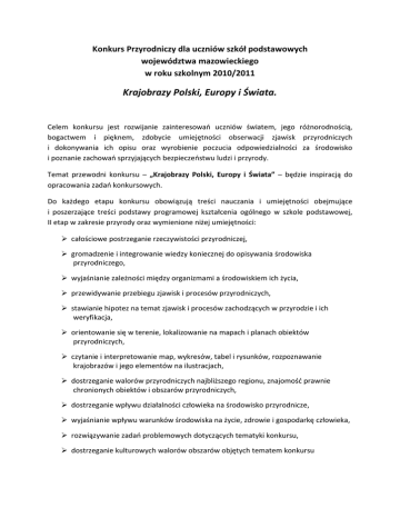 Konkurs Przyrodniczy dla uczniów szkół podstawowych województwa mazowieckiego w roku szkolnym 2010/2011 Krajobrazy Polski, Europy i Świata. Celem konkursu jest rozwijanie zainteresowań uczniów światem, jego różnorodnością, bogactwem i pięknem, zdobycie umiejętności obserwacji zjawisk przyrodniczych i dokonywania ich opisu oraz wyrobienie poczucia odpowiedzialności za środowisko i poznanie zachowań sprzyjających bezpieczeństwu ludzi i przyrody. Temat przewodni konkursu – „Krajobrazy Polski, Europy i Świata” – będzie inspiracją do opracowania zadań konkursowych. Do każdego etapu konkursu obowiązują treści nauczania i umiejętności obejmujące i poszerzające treści podstawy programowej kształcenia ogólnego w szkole podstawowej, II etap w zakresie przyrody oraz wymienione niżej umiejętności: całościowe postrzeganie rzeczywistości przyrodniczej, gromadzenie i integrowanie wiedzy koniecznej do opisywania środowiska przyrodniczego, wyjaśnianie zależności między organizmami a środowiskiem ich życia, przewidywanie przebiegu zjawisk i procesów przyrodniczych, stawianie hipotez na temat zjawisk i procesów zachodzących w przyrodzie i ich weryfikacja, orientowanie się w terenie, lokalizowanie na mapach i planach obiektów przyrodniczych, czytanie i interpretowanie map, wykresów, tabel i rysunków, rozpoznawanie krajobrazów i jego elementów na ilustracjach, dostrzeganie walorów przyrodniczych najbliższego regionu, znajomość prawnie chronionych obiektów i obszarów przyrodniczych, dostrzeganie wpływu działalności człowieka na środowisko przyrodnicze, wyjaśnianie wpływu warunków środowiska na życie, zdrowie i gospodarkę człowieka, rozwiązywanie zadań problemowych dotyczących tematyki konkursu, dostrzeganie kulturowych walorów obszarów objętych tematem konkursu rozpoznawanie stanów fizjologicznych organizmu człowieka. Dbałość o zdrowie przez stosowanie zasad higieny i korzystanie z różnych form rekreacji, wyjaśnianie zjawisk fizycznych i astronomicznych, obserwowanie i identyfikowanie różnorodnych substancji i procesów chemicznych, właściwe korzystanie z dostępnych produktów chemicznych obserwowanie przyrodniczych składników środowiska i ich opis, Uczestnicy konkursu powinni zwrócić uwagę na rozwijanie umiejętności planowania doświadczeń i interpretacji ich wyników, zastosowania wiedzy przyrodniczej w życiu codziennym. Zagadnienia: I etap - szkolny 1. Przyrodnicze (nieożywione i ożywione) oraz antropogeniczne składniki krajobrazu oraz zależności między nimi. 2. Mapa i plan obrazem powierzchni Ziemi. Rodzaje map. Skala i legenda mapy. 3. Formy terenu na mapie poziomicowej. 4. Czynniki warunkujące życie na lądzie. 5. Las, łąka, pole uprawne, park miejski jako przykłady środowisk lądowychcharakterystyczne gatunki i ich przystosowania budowy zewnętrznej i czynności życiowych do środowiska życia. 6. Rodzaje wód powierzchniowych; zjawiska zachodzące w cieku wodnym. 7. Czynniki warunkujące życie w wodzie. 8. Jezioro i rzeka jako przykłady środowisk wodnych, typowe rośliny i zwierzęta żyjące w jeziorze i rzece, przystosowanie ich budowy zewnętrznej i czynności życiowych do środowiska życia. 9. Zależności pokarmowe w środowisku przyrodniczym – organizmy samożywne i cudzożywne (na przykładzie podanych wyżej środowisk lądowych i wodnych). 10. Krajobraz Niziny Mazowieckiej (ukształtowanie terenu, skały, wody, klimat, gleby, rośliny, zwierzęta). 11. Osobliwości przyrodnicze Mazowsza - parki narodowe i krajobrazowe, rezerwaty przyrody, pomniki przyrody i gatunki objęte ochroną. 12. Zmiany w krajobrazie Mazowsza wywołane działalnością człowieka. 13. Wpływ czynników takich jak: woda, powietrze, temperatura, gleba na przedmioty zbudowane z różnych substancji. Wpływ różnych substancji i ich mieszanin na wzrost i rozwój roślin. II etap - rejonowy Obowiązuje zakres wiedzy i umiejętności z etapu szkolnego oraz: Krajobrazy Polski i Europy. 1. Mapa ogólnogeograficzna Polski i Europy - największe niziny, wyżyny, góry, rzeki, jeziora. 2. Charakterystyka krajobrazów Polski: nizin nadmorskich, pojezierzy, nizin środkowopolskich, wyżyn, gór niskich, średnich i wysokich. 3. Charakterystyka krajobrazów: wielkomiejskiego, przemysłowego i rolniczego – przykłady na mapie Polski. 4. Zjawiska przyrodnicze na wyżynie wapiennej i lessowej. 5. Zależności między cechami krajobrazu a formami działalności człowieka. 6. Formy ochrony przyrody stosowane w Polsce; krótka charakterystyka parków narodowych i ich lokalizacja na mapie. Obiekty polskiej przyrody wpisane na światową listę dziedzictwa przyrodniczego. 7. Najważniejsze walory turystyczne największych miast Polski, ze szczególnym uwzględnieniem Warszawy, Krakowa, Gdańska. 8. Lokalizacja na mapie Europy Polski i państw sąsiadujących i ich stolice. 9. Charakterystyka krajobrazów Europy na przykładzie krajobrazu śródziemnomorskiego, alpejskiego. III etap - wojewódzki Obowiązuje zakres wiedzy i umiejętności z etapu szkolnego rejonowego oraz: Krajobrazy Świata. 1. Mapa hipsometryczna świata.- największe niziny, wyżyny, góry, rzeki, jeziora. 2. Czynniki naturalne wpływające na zróżnicowanie krajobrazów Ziemi. Krajobrazy strefowe i astrefowe. 3. Charakterystyka warunków klimatycznych, glebowych następujących krajobrazów strefowych: lasu równikowego wilgotnego, sawanny, pustyni gorącej, stepu, tajgi, tundry, pustyni lodowej. 4. Charakterystyka, ze szczególnym uwzględnieniem warunków klimatycznych, glebowych i przystosowania do nich roślin i zwierząt, następujących krajobrazów astrefowych: wysokogórski, wulkaniczny. 5. Organizmy roślinne i zwierzęce charakterystyczne dla poszczególnych krajobrazów i ich przystosowania do warunków życia. 6. Współzależności między składnikami krajobrazu a rozmieszczeniem roślin i zwierząt. 7. Znaczenie zbiorowis