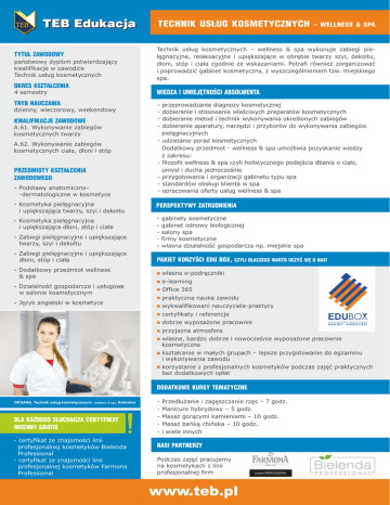 TECHNIK USŁUG KOSMETYCZNYCH TYTUŁ ZAWODOWY państwowy dyplom potwierdzający kwalifikacje w zawodzie Technik usług kosmetycznych – WELLNESS & SPA Technik usług kosmetycznych – wellness & spa wykonuje zabiegi pielęgnacyjne, relaksacyjne i upiększające w obrębie twarzy szyi, dekoltu, dłoni, stóp i ciała zgodnie ze wskazaniami. Potrafi również zorganizować i poprowadzić gabinet kosmetyczny, z wyszczególnieniem tzw. miejskiego spa. OKRES KSZTAŁCENIA 4 semestry WIEDZA I UMIEJĘTNOŚCI ABSOLWENTA TRYB NAUCZANIA - dzienny, wieczorowy, weekendowy KWALIFIKACJE ZAWODOWE A.61. Wykonywanie zabiegów kosmetycznych twarzy a A.62. Wykonywanie zabiegów kosmetycznych ciała, dłoni i stóp PRZEDMIOTY KSZTAŁCENIA ZAWODOWEGO - Podstawy anatomiczno-dermatologiczne w kosmetyce przeprowadzanie diagnozy kosmetycznej dobieranie i stosowanie właściwych preparatów kosmetycznych dobieranie metod i technik wykonywania określonych zabiegów dobieranie aparatury, narzędzi i przyborów do wykonywania zabiegów pielęgnacyjnych - udzielanie porad kosmetycznych Dodatkowy przedmiot - wellness & spa umożliwia pozyskanie wiedzy z zakresu: - filozofii wellness & spa czyli holistycznego podejścia dbania o ciało, umysł i ducha jednocześnie - przygotowania i organizacji gabinetu typu spa - standardów obsługi klienta w spa - opracowania oferty usług wellness & spa - Kosmetyka pielęgnacyjna i upiększająca twarzy, szyi i dekoltu PERSPEKTYWY ZATRUDNIENIA - Kosmetyka pielęgnacyjna i upiększająca dłoni, stóp i ciała - Zabiegi pielęgnacyjne i upiększające twarzy, szyi i dekoltu - - Zabiegi pielęgnacyjne i upiększające dłoni, stóp i ciała PAKIET KORZYŚCI EDU BOX, CZYLI DLACZEGO WARTO UCZYĆ SIĘ U NAS! gabinety kosmetyczne gabinet odnowy biologicznej salony spa firmy kosmetyczne własna działalność gospodarcza np. miejskie spa - Dodatkowy przedmiot wellness & spa - własne e-podręczniki - Działalność gospodarcza i usługowa w salonie kosmetycznym - Office 365 - Język angielski w kosmetyce - e-learning - praktyczna nauka zawodu - wykwalifikowani nauczyciele-praktycy - certyfikaty i referencje - dobrze wyposażone pracownie EDUBOX PA K I E T KORZYŚCI - przyjazna atmosfera - własne, bardzo dobrze i nowocześnie wyposażone pracownie kosmetyczne - kształcenie w małych grupach – lepsze przygotowanie do egzaminu i wykonywania zawodu - korzystanie z profesjonalnych kosmetyków podczas zajęć praktycznych bez dodatkowych opłat DODATKOWE KURSY TEMATYCZNE OKSANA, Technik usług kosmetycznych - wellness & spa, Katowice DLA KAŻDEGO SŁUCHACZA CERTYFIKAT IMIENNY GRATIS - certyfikat ze znajomości linii profesjonalnej kosmetyków Bielenda Professional - certyfikat ze znajomości linii profesjonalnej kosmetyków Farmona Professional - Przedłużanie i zagęszczanie rzęs – 7 godz. Manicure hybrydowy – 5 godz. Masaż gorącymi kamieniami – 10 godz. Masaż bańką chińska – 10 godz. i wiele innych NASI PARTNERZY Podczas zajęć pracujemy na kosmetykach z linii profesjonalnej firm www.teb.pl