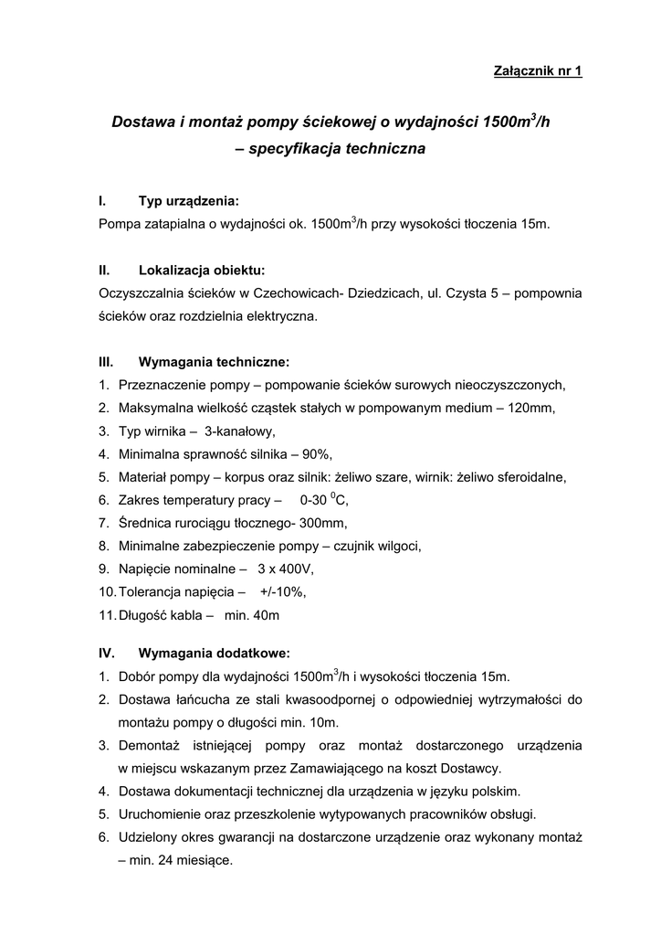Załącznik nr 1 Dostawa i montaż pompy ściekowej o wydajności 1500m3/h – specyfikacja techniczna I. Typ urządzenia: Pompa zatapialna o wydajności ok. 1500m3/h przy wysokości tłoczenia 15m. II. Lokalizacja obiektu: Oczyszczalnia ścieków w Czechowicach- Dziedzicach, ul. Czysta 5 – pompownia ścieków oraz rozdzielnia elektryczna. III. Wymagania techniczne: 1. Przeznaczenie pompy – pompowanie ścieków surowych nieoczyszczonych, 2. Maksymalna wielkość cząstek stałych w pompowanym medium – 120mm, 3. Typ wirnika – 3-kanałowy, 4. Minimalna sprawność silnika – 90%, 5. Materiał pompy – korpus oraz silnik: żeliwo szare, wirnik: żeliwo sferoidalne, 6. Zakres temperatury pracy – 0-30 0C, 7. Średnica rurociągu tłocznego- 300mm, 8. Minimalne zabezpieczenie pompy – czujnik wilgoci, 9. Napięcie nominalne – 3 x 400V, 10. Tolerancja napięcia – +/-10%, 11. Długość kabla – min. 40m IV. Wymagania dodatkowe: 1. Dobór pompy dla wydajności 1500m3/h i wysokości tłoczenia 15m. 2. Dostawa łańcucha ze stali kwasoodpornej o odpowiedniej wytrzymałości do montażu pompy o długości min. 10m. 3. Demontaż istniejącej pompy oraz montaż dostarczonego urządzenia w miejscu wskazanym przez Zamawiającego na koszt Dostawcy. 4. Dostawa dokumentacji technicznej dla urządzenia w języku polskim. 5. Uruchomienie oraz przeszkolenie wytypowanych pracowników obsługi. 6. Udzielony okres gwarancji na dostarczone urządzenie oraz wykonany montaż – min. 24 miesiące. V. Informacje dodatkowe: 1. Dopuszcza się wykonanie tzw. mufowania przewodów pompy dla żądanej długości. 2. Dostarczona pompa zostanie zamontowana w miejsce pompy Sarlin typ S 3-578-1. Należy przewidzieć odpowiednie autozłącze do połączenia z istniejącym rurociągiem tłocznym DN 300 lub dokonać wymiany stopy sprzęgającej pompę z rurociągiem tłocznym. 3. Aktualnie do przepompowywania ścieków na oczyszczalni ścieków wykorzystywane są pompy Grundfos typu S 2 224A L 1 oraz Sarlin typu S 3-578-1.