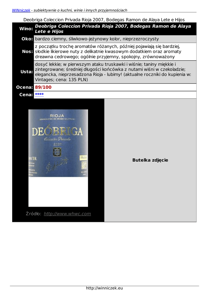 WINniczek - subiektywnie o kuchni, winie i innych przyjemnościach Deobriga Coleccion Privada Rioja 2007, Bodegas Ramon de Alaya Lete e Hijos Deobriga Coleccion Privada Rioja 2007, Bodegas Ramon de Alaya Wino: Lete e Hijos Oko: bardzo ciemny, śliwkowo-jeżynowy kolor, nieprzezroczysty z początku trochę aromatów różanych, później pojawiają się bardziej, Nos: słodkie likierowe nuty z delikatnie kwasowym dodatkiem oraz aromaty dreawna cedrowego; ogólnie przyjemny, spokojny, zrównoważony dosyć lekkie; w pierwszym ataku truskawki i wiśnie; taniny miękkie i zintegrowane; średniej długości końcówka z nutami wiśni w czekoladzie; Usta: elegancka, nieprzesadzona Rioja - lubimy! (aktualne roczniki do kupienia w: Vintages; cena: 135 PLN) Ocena: 89/100 Cena: **** Butelka zdjęcie Źródło: http://www.whwc.com http://winniczek.eu
