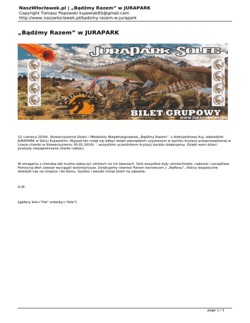 NaszWłocławek.pl | „Bądźmy Razem” w JURAPARK Copyright Tomasz Popowski [email protected] http://www.naszwloclawek.pl/badzmy-razem-w-jurapark „Bądźmy Razem” w JURAPARK 12 czerwca 2010r. Stowarzyszenie Dzieci i Młodzieży Niepełnosprawnej „Bądźmy Razem” z Aleksandrowa Kuj. odwiedziło JURAPARK w Solcu Kujawskim. Wyjazd ten mógł się odbyć dzięki pieniądzom uzyskanym w wyniku licytacji przeprowadzonej w czasie choinki w Stowarzyszeniu 30.01.2010r. - wszystkim uczestnikom licytacji bardzo dziękujemy. Dzięki wam dzieci przeżyły niezapomniane chwile radości. W zmaganiu z chorobą tak trudno zobaczyć uśmiech na ich twarzach. Dziś wszystkie były uśmiechnięte, radosne i szczęśliwe. Pomocną dłoń zawsze wyciągali wolontariusze. Dziękujemy również Panom kierowcom z „Naftexu”, którzy bezpiecznie dowieźli nas na miejsce i do domu. Szybko i wesoło minął dzień na zabawie. A.W. [gallery link="file" orderby="title"] page 1 / 1