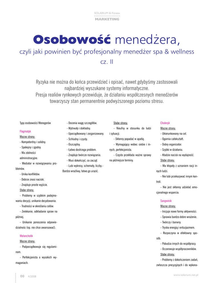 SOLARIUM & Fitness MARKETING Osobowość menedżera, czyli jaki powinien być profesjonalny menedżer spa & wellness cz. II Ryzyka nie można do końca przewidzieć i opisać, nawet gdybyśmy zastosowali najbardziej wyszukane systemy informatyczne. Presja realiów rynkowych przewiduje, że działaniu współczesnych menedżerów towarzyszy stan permanentnie podwyższonego poziomu stresu. Typy osobowości Menegerów Flegmatyk Mocne strony: - Kompetentny i solidny. - Spokojny i zgodny. - Ma zdolności administracyjne. - Mediator w rozwiązywaniu problemów. - Unika konfliktów. - Dobrze znosi naciski. - Znajduje proste wyjście. Słabe strony: - Problemy w szybkim podejmowaniu decyzji, unikanie decydowania. - Docenia wagę szczegółów. Słabe strony: Choleryk - Wytrwały i dokładny. - Nieufny w stosunku do ludzi Mocne strony: - Uporządkowany i zorganizowany. - Schludny i czysty. - Oszczędny. - Łatwo dostrzega problem. - Znajduje twórcze rozwiązania. - Musi dokończyć, co zaczął. - Lubi wykresy, schematy, liczby.Bardzo wrażliwy, łatwo go urazić. i sytuacji. - Ukierunkowany na cel. - Skłonny popadać w apatię. - Ogarnia całokształt. - Wymagający wobec siebie i in- - Dobry organizator. nych, perfekcjonista. - Często przekłada ważne sprawy na późniejsze terminy. - Szybki w działaniu. - Kładzie nacisk na wydajność. Słabe strony: - Ma kłopoty z uznaniem racji innych ludzi. - Nie lubi przekazywać innym kontroli. - Nie jest skłonny udzielać emocjonalnego wsparcia. Sangwinik - Trudności w określaniu celów. Mocne strony: - Zwlekanie, odkładanie spraw na - Inicjuje nowe formy aktywności. później. - Sprawia bardzo dobre wrażenie. - Unikanie ponoszenia odpowiedzialnośc (np. nie chce awansować). Melancholik Mocne strony: - Podporządkowuje się regulaminom. - Perfekcjonista o wysokich wymaganiach. 00 4/2008 - Twórczy i barwny. - Tryska energią i entuzjazmem. - Rozpoczyna w efektowny sposób. - Pobudza innych do współpracy. - Oczarowuje współpracowników. Słabe strony: - Problemy z dokończeniem zadań, zwłaszcza precyzyjnych i do wykonawww.solarium.net.pl nia w określonym terminie. swój sposób życia i wartości, którym - Nie umie odmawiać, w związku są oddani. Czują się odpowiedzialni z tym często przyjmuje nadmiar obo- za swoje życie. Cieszą się nim, potra- wiązków. fią się zmieniać. Przeważa u nich stan - Często wypowiedź wyprzedza „Dorosłego”. głębsze przemyślenia problemu. Menedżerowie przegrywający to: - Zapomina o różnych sprawach, ludzie unikający odpowiedzialności jest niepunktualny. za własne życie. Boją się ryzyka, po- - Łatwo ulega emocjom. dejmowania decyzji. Chętnie naśladują innych. Unikają teraźniejszości. Model rozwoju osobistego Uciekają w przeszłość lub przyszłość, menedżera w analizie transakcyj- zakładają „maski”. Prezentują stan nej według E. Berne „Dziecka”. Analiza transakcyjna jest teorią Jednakże niewielu jest menedże- osobowości nastawioną na praktykę, rów całkowicie wygrywających lub służy rozwojowi osobowości, doskona- przegrywających. Większość wygrywa leniu umiejętności interpersonalnych. w jednych dziedzinach życia, prze- Poprzez analizę myśli, uczuć i zacho- grywa w innych. Aby być profesjonal- wań w oparciu o koncepcje stanów nym menedżerem nie trzeba zmieniać „JA”, odpowiada na pytania: • kim jestem? • jak stałem się tym, kim jestem? • dlaczego zachowuję się właśnie tak? STANY „JA”: Każdy menedżer przejawia trzy stany „JA” będące źródłem jego zachowań. 1. Stan Rodzic „R”: Zawiera postawy i zachowania pochodzące od rodziców. „R” karze, nagradza, krytykuje, ochrania. Odpowiada za wy- siebie, wystarczy popracować nad i bawią się, z pozycji Dorosłego, gdy 2. Stan Dziecko „Dz”: Zawiera popędy, uczucia, zachowania z dzieciństwa. 3. Stan Dorosły „D”: Obiektywnie ocenia rzeczywistość, zbiera informa- Menedżerowie prezentują cztery dziemy postrzegani jako profesjonalni. ludźmi. Inni są skłonni częściej uru- główne filozoficzne postawy życiowe I co najważniejsze, można zacząć taki chamiać jedne stany, pomijając inne. w relacjach trening w każdym momencie swojego Powoduje to sztywność, stereotypo- JA-INNI: wość i nieczytelność ich zachowań. 1. Ja jestem OK. – Ty jesteś OK.: Odpowiedzialne i trwałe decyzje mocna zdrowa realistyczna postawa podejmujemy w wyniku zaistnienia „wygrywającego” (osobowość inte- trzech stanów „JA”, czyli działania gralna menedżerów, asertywna). z pozycji Dorosłego, przy zachęcającej 2. Ja nie jestem OK. – Ty jesteś zgodzie Rodzica i naturalnej radości OK.: postawa osoby bezradnej, z po- Dziecka. czuciem niższości, wycofującej się. POSTAWY ŻYCIOWE MENEDŻERÓW 3. Ja jestem OK. – Ty nie jesteś Każdy z nas od urodzenia potrze- OK.: postawa menedżera, który czuje buje kontaktu fizycznego i psychicz- się ofiarą wykorzystywaną przez in- nego z innymi ludźmi. Udzielanie nych; prowadzi do izolacji czy agresji. wsparcia (zauważanie potrzeb) jest 4. Ja nie jestem OK. – Ty nie je- najważniejszą treścią stosunków mię- steś OK.: postawa przegrywającego dzy nimi. menedżera, który utracił sens życia. Wsparcie może być: cje, wysnuwa wnioski, podejmuje decyzje. Jest zorganizowany, elastyczny, inteligentny. Osobowości integralne menedżerów potrafią swobodnie funkcjonować z pozycji trzech stanów „JA” np:. z pozycji Rodzica, gdy opiekują się kimś, z pozycji Dziecka, gdy odpoczywają www.solarium.net.pl własnym zachowaniem, wówczas bę- podejmują decyzje i kierują innymi chowanie, tradycję, wartości, kulturę, sumienie. wsparcia (nawet negatywnego)! życia. Możemy zmienić postawy życiowe. a) pozytywne: „Ty jesteś OK.”, zaspokaja potrzebę bezpieczeństwa, własnej wartości. – Jest to jedno z głównych zadań analizy transakcyjnej. Menedżerowie wygrywający to: lu- 