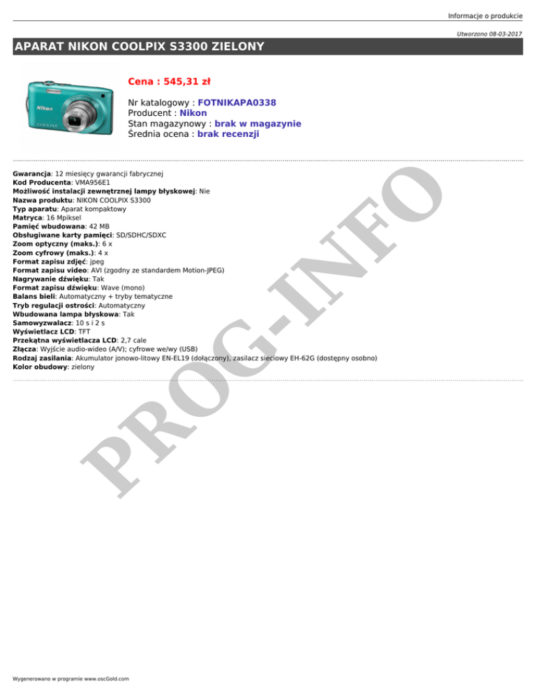 Informacje o produkcie Utworzono 08-03-2017 APARAT NIKON COOLPIX S3300 ZIELONY Cena : 545,31 zł Nr katalogowy : FOTNIKAPA0338 Producent : Nikon Stan magazynowy : brak w magazynie Średnia ocena : brak recenzji PR O G -I N FO Gwarancja: 12 miesięcy gwarancji fabrycznej Kod Producenta: VMA956E1 Możliwość instalacji zewnętrznej lampy błyskowej: Nie Nazwa produktu: NIKON COOLPIX S3300 Typ aparatu: Aparat kompaktowy Matryca: 16 Mpiksel Pamięć wbudowana: 42 MB Obsługiwane karty pamięci: SD/SDHC/SDXC Zoom optyczny (maks.): 6 x Zoom cyfrowy (maks.): 4 x Format zapisu zdjęć: jpeg Format zapisu video: AVI (zgodny ze standardem Motion-JPEG) Nagrywanie dźwięku: Tak Format zapisu dźwięku: Wave (mono) Balans bieli: Automatyczny + tryby tematyczne Tryb regulacji ostrości: Automatyczny Wbudowana lampa błyskowa: Tak Samowyzwalacz: 10 s i 2 s Wyświetlacz LCD: TFT Przekątna wyświetlacza LCD: 2,7 cale Złącza: Wyjście audio-wideo (A/V); cyfrowe we/wy (USB) Rodzaj zasilania: Akumulator jonowo-litowy EN-EL19 (dołączony), zasilacz sieciowy EH-62G (dostępny osobno) Kolor obudowy: zielony Wygenerowano w programie www.oscGold.com