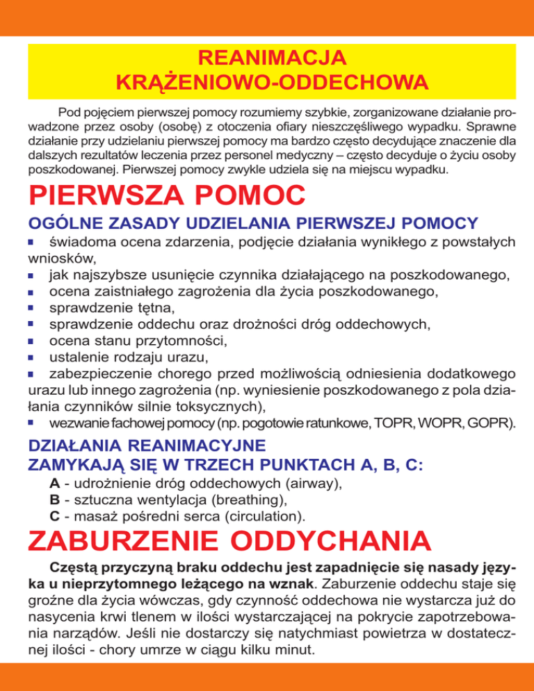 REANIMACJA KR¥¯ENIOWO-ODDECHOWA Pod pojêciem pierwszej pomocy rozumiemy szybkie, zorganizowane dzia³anie prowadzone przez osoby (osobê) z otoczenia ofiary nieszczêliwego wypadku. Sprawne dzia³anie przy udzielaniu pierwszej pomocy ma bardzo czêsto decyduj¹ce znaczenie dla dalszych rezultatów leczenia przez personel medyczny czêsto decyduje o ¿yciu osoby poszkodowanej. Pierwszej pomocy zwykle udziela siê na miejscu wypadku. PIERWSZA POMOC OGÓLNE ZASADY UDZIELANIA PIERWSZEJ POMOCY wiadoma ocena zdarzenia, podjêcie dzia³ania wynik³ego z powsta³ych wniosków, jak najszybsze usuniêcie czynnika dzia³aj¹cego na poszkodowanego, ocena zaistnia³ego zagro¿enia dla ¿ycia poszkodowanego, sprawdzenie têtna, sprawdzenie oddechu oraz dro¿noci dróg oddechowych, ocena stanu przytomnoci, ustalenie rodzaju urazu, zabezpieczenie chorego przed mo¿liwoci¹ odniesienia dodatkowego urazu lub innego zagro¿enia (np. wyniesienie poszkodowanego z pola dzia³ania czynników silnie toksycznych), wezwanie fachowej pomocy (np. pogotowie ratunkowe, TOPR, WOPR, GOPR). DZIA£ANIA REANIMACYJNE ZAMYKAJ¥ SIÊ W TRZECH PUNKTACH A, B, C: A - udro¿nienie dróg oddechowych (airway), B - sztuczna wentylacja (breathing), C - masa¿ poredni serca (circulation). ZABURZENIE ODDYCHANIA Czêst¹ przyczyn¹ braku oddechu jest zapadniêcie siê nasady jêzyka u nieprzytomnego le¿¹cego na wznak. Zaburzenie oddechu staje siê grone dla ¿ycia wówczas, gdy czynnoæ oddechowa nie wystarcza ju¿ do nasycenia krwi tlenem w iloci wystarczaj¹cej na pokrycie zapotrzebowania narz¹dów. Jeli nie dostarczy siê natychmiast powietrza w dostatecznej iloci - chory umrze w ci¹gu kilku minut. Wskazówki te dotycz¹ równie¿ utoniêæ. W przypadku uk¹szeñ (u¿¹dleñ) jamy ustnej stosuje siê zimne ok³ady (ssanie kawa³ka lodu) i sta³¹ kontrolê oddechu. OBJAWY BEZDECHU: utrata przytomnoci, sinoblade zabarwienie twarzy (nie wystêpuje przy zatruciu tlenkiem wêgla - czadu lub cyjanowodorem), nie wyczuwalny przep³yw powietrza przez nos i usta, niewidoczne i nie wyczuwalne ruchy oddechowe. CZYNNOCI RATUJ¥CE ¯YCIE: sprawdzamy, czy w jamie ustnej nie ma wiêkszych cia³ obcych, które mog³yby zatkaæ drogi oddechowe, odchylamy ostro¿nie g³owê ku ty³owi - czêsto w tym momencie oddech wraca samoistnie, sztuczne oddychanie metod¹ usta-nos lub sztuczne oddychanie metod¹ usta-usta. SZTUCZNE ODDYCHANIE Postêpowanie w zale¿noci od wieku poszkodowanego (zgodnie z obecnie obowi¹zuj¹cymi wytycznymi ILCOR z 2005 roku) Przed wykonaniem masa¿u serca sprawdzamy oznaki zatrzymanego kr¹¿enia (nie d³u¿ej ni¿ 10 s): brak normalnego oddechu, kaszlu lub ruchu s¹ sygna³em do rozpoczêcia reanimacji.