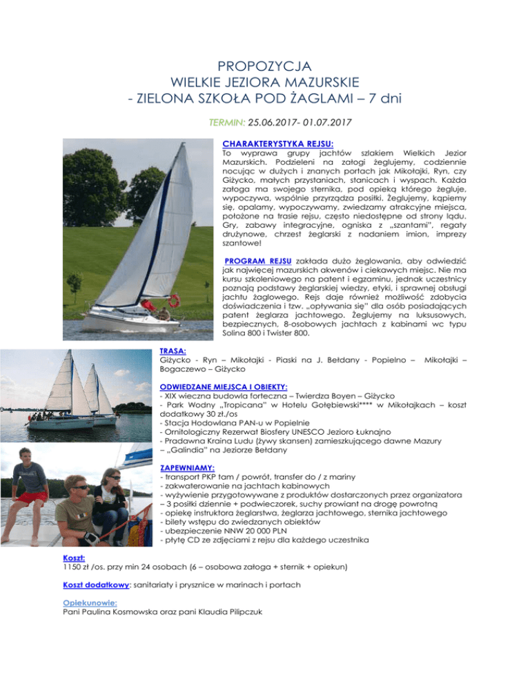 PROPOZYCJA WIELKIE JEZIORA MAZURSKIE - ZIELONA SZKOŁA POD ŻAGLAMI – 7 dni TERMIN: 25.06.2017- 01.07.2017 CHARAKTERYSTYKA REJSU: To wyprawa grupy jachtów szlakiem Wielkich Jezior Mazurskich. Podzieleni na załogi żeglujemy, codziennie nocując w dużych i znanych portach jak Mikołajki, Ryn, czy Giżycko, małych przystaniach, stanicach i wyspach. Każda załoga ma swojego sternika, pod opieką którego żegluje, wypoczywa, wspólnie przyrządza posiłki. Żeglujemy, kąpiemy się, opalamy, wypoczywamy, zwiedzamy atrakcyjne miejsca, położone na trasie rejsu, często niedostępne od strony lądu. Gry, zabawy integracyjne, ogniska z „szantami”, regaty drużynowe, chrzest żeglarski z nadaniem imion, imprezy szantowe! PROGRAM REJSU zakłada dużo żeglowania, aby odwiedzić jak najwięcej mazurskich akwenów i ciekawych miejsc. Nie ma kursu szkoleniowego na patent i egzaminu, jednak uczestnicy poznają podstawy żeglarskiej wiedzy, etyki, i sprawnej obsługi jachtu żaglowego. Rejs daje również możliwość zdobycia doświadczenia i tzw. „opływania się” dla osób posiadających patent żeglarza jachtowego. Żeglujemy na luksusowych, bezpiecznych, 8-osobowych jachtach z kabinami wc typu Solina 800 i Twister 800. TRASA: Giżycko - Ryn – Mikołajki - Piaski na J. Bełdany - Popielno – Bogaczewo – Giżycko Mikołajki – ODWIEDZANE MIEJSCA I OBIEKTY: - XIX wieczna budowla forteczna – Twierdza Boyen – Giżycko - Park Wodny „Tropicana” w Hotelu Gołębiewski**** w Mikołajkach – koszt dodatkowy 30 zł./os - Stacja Hodowlana PAN-u w Popielnie - Ornitologiczny Rezerwat Biosfery UNESCO Jezioro Łuknajno - Pradawna Kraina Ludu (żywy skansen) zamieszkującego dawne Mazury – „Galindia” na Jeziorze Bełdany ZAPEWNIAMY: - transport PKP tam / powrót, transfer do / z mariny - zakwaterowanie na jachtach kabinowych - wyżywienie przygotowywane z produktów dostarczonych przez organizatora – 3 posiłki dziennie + podwieczorek, suchy prowiant na drogę powrotną - opiekę instruktora żeglarstwa, żeglarza jachtowego, sternika jachtowego - bilety wstępu do zwiedzanych obiektów - ubezpieczenie NNW 20 000 PLN - płytę CD ze zdjęciami z rejsu dla każdego uczestnika Koszt: 1150 zł /os. przy min 24 osobach (6 – osobowa załoga + sternik + opiekun) Koszt dodatkowy: sanitariaty i prysznice w marinach i portach Opiekunowie: Pani Paulina Kosmowska oraz pani Klaudia Pilipczuk
