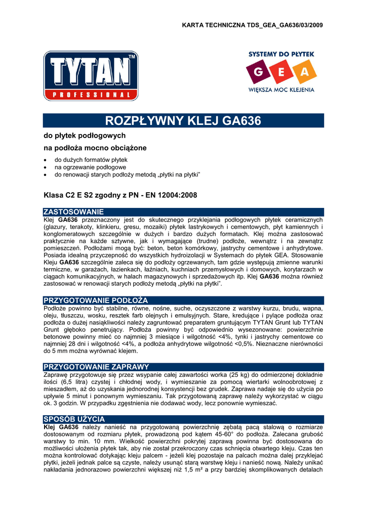 KARTA TECHNICZNA TDS_GEA_GA636/03/2009 ROZPŁYWNY KLEJ GA636 do płytek podłogowych na podłoża mocno obciążone do dużych formatów płytek na ogrzewanie podłogowe do renowacji starych podłoży metodą „płytki na płytki” Klasa C2 E S2 zgodny z PN - EN 12004:2008 ZASTOSOWANIE Klej GA636 przeznaczony jest do skutecznego przyklejania podłogowych płytek ceramicznych (glazury, terakoty, klinkieru, gresu, mozaiki) płytek lastrykowych i cementowych, płyt kamiennych i konglomeratowych szczególnie w dużych i bardzo dużych formatach. Klej można zastosować praktycznie na każde sztywne, jak i wymagające (trudne) podłoże, wewnątrz i na zewnątrz pomieszczeń. Podłożami mogą być: beton, beton komórkowy, jastrychy cementowe i anhydrytowe. Posiada idealną przyczepność do wszystkich hydroizolacji w Systemach do płytek GEA. Stosowanie Kleju GA636 szczególnie zaleca się do podłoży ogrzewanych, tam gdzie występują zmienne warunki termiczne, w garażach, łazienkach, łaźniach, kuchniach przemysłowych i domowych, korytarzach w ciągach komunikacyjnych, w halach magazynowych i sprzedażowych itp. Klej GA636 można również zastosować w renowacji starych podłoży metodą „płytki na płytki”. PRZYGOTOWANIE PODŁOŻA Podłoże powinno być stabilne, równe, nośne, suche, oczyszczone z warstwy kurzu, brudu, wapna, oleju, tłuszczu, wosku, resztek farb olejnych i emulsyjnych. Stare, kredujące i pylące podłoża oraz podłoża o dużej nasiąkliwości należy zagruntować preparatem gruntującym TYTAN Grunt lub TYTAN Grunt głęboko penetrujący. Podłoża powinny być odpowiednio wysezonowane: powierzchnie betonowe powinny mieć co najmniej 3 miesiące i wilgotność <4%, tynki i jastrychy cementowe co najmniej 28 dni i wilgotność <4%, a podłoża anhydrytowe wilgotność <0,5%. Nieznaczne nierówności do 5 mm można wyrównać klejem. PRZYGOTOWANIE ZAPRAWY Zaprawę przygotowuje się przez wsypanie całej zawartości worka (25 kg) do odmierzonej dokładnie ilości (6,5 litra) czystej i chłodnej wody, i wymieszanie za pomocą wiertarki wolnoobrotowej z mieszadłem, aż do uzyskania jednorodnej konsystencji bez grudek. Zaprawa nadaje się do użycia po upływie 5 minut i ponownym wymieszaniu. Tak przygotowaną zaprawę należy wykorzystać w ciągu ok. 3 godzin. W przypadku zgęstnienia nie dodawać wody, lecz ponownie wymieszać. SPOSÓB UŻYCIA Klej GA636 należy nanieść na przygotowaną powierzchnię zębatą pacą stalową o rozmiarze dostosowanym od rozmiaru płytek, prowadzoną pod kątem 45-60° do podłoża. Zalecana grubość warstwy to min. 10 mm. Wielkość powierzchni pokrytej zaprawą powinna być dostosowana do możliwości ułożenia płytek tak, aby nie został przekroczony czas schnięcia otwartego kleju. Czas ten można kontrolować dotykając kleju palcem - jeżeli klej pozostaje na palcach można dalej przyklejać płytki, jeżeli jednak palce są czyste, należy usunąć starą warstwę kleju i nanieść nową. Należy unikać nakładania jednorazowo powierzchni większej niż 1,5 m² a przy bardziej skomplikowanych detalach KARTA TECHNICZNA TDS_GEA_GA636/03/2009 lub wysokiej temperaturze i/lub chłonnym podłożu odpowiednio mniejszej. W przypadku płytek o dużych wymiarach zaleca się nakładać klej na powierzchnię odpowiadającą wielkości płyty. Po rozprowadzeniu kleju należy przyłożyć płytkę jak najbliżej poprzedniej następnie przesuwa tak, aby powstała spoina odpowiedniej szerokości. Szerokość spoiny dobieramy w zależności od płytek (wielkości, rodzaju, itp.) i od lokalizacji spoiny. Nie należy moczyć płytek przed klejeniem. Czas korekty położenia płytki wynosi ok. 15 minut od momentu dociśnięcia. Przed stwardnieniem zaprawy należy wydrapać ze spoin jej ewentualne pozostałości, a zabrudzenia na płytkach umyć wodą. Płytki można spoinować po 24 godzinach, pełną wytrzymałość użytkową zaprawa uzyskuje po upływie 14 dni. Ruch pieszy i obciążenia statyczne nie przekraczające 150 kg/m² dopuszczalne są po upływie 3 dni. DANE TECHNICZNE proporcje mieszania czas gotowości zaprawy do wymieszaniu z wodą temperatura stosowania czas otwarty (naskórkowanie) czas korekty fugowanie podłóg użytkowanie częściowe/pełne spływ orientacyjne zużycie min. grubość warstwy zaprawy max. grubość warstwy zaprawy 6,5-7,0 litra wody na 25 kg suchej zaprawy 0,26-0,28 litra wody na 1 kg suchej zaprawy użycia po do 3 h o o od +5 C do +25 C 30 min 15 min po 48 h po 3/14 dni ≤0,5 mm 2 ok. 5,0-6,0 kg/m 10 mm 15 mm SKŁADOWANIE I TRANSPORT Zaprawę należy przewozić i przechowywać w suchych warunkach na paletach i w oryginalnych, nie uszkodzonych opakowaniach. Tak przechowywany produkt posiada okres przydatności do użycia 12 miesięcy. Chronić przed wilgocią. Numer zakładu produkcyjnego oraz data ważności na opakowaniu. BEZPIECZEŃSTWO Zwroty zagrożenia: R36/37/38 Działa drażniąco na oczy, drogi oddechowe i skórę. R43 Może powodować uczulenie w kontakcie ze skórą. Zwroty bezpieczeństwa: S2 Chronić przed dziećmi. S22 Nie wdychać pyłu. S26 Zanieczyszczone oczy przemyć natychmiast dużą ilością wody i zasięgnąć porady lekarza. S36/37/39 Nosić odpowiednią odzież ochronną, odpowiednie rękawice ochronne i okulary lub ochronę twarzy. S46 W razie połknięcia niezwłocznie zasięgnij porady lekarza - pokaż opakowanie lub etykietę. Xi – produkt drażniący zawiera cement ZGODNOŚĆ Z NORMAMI I WYMAGANIAMI JAKOŚCIOWYMI Produkt posiada: Deklaracja Zgodności WE 7/01/2009 z dnia 2009-04-30 Zgodny z Normą PN - EN 12004:2008 Jednostka certyfikująca IMMB 1487 KARTA TECHNICZNA TDS_GEA_GA636/03/2009 CE 09 SELENA SA ul. Wyścigowa 56E, 53-012 Wrocław PN-EN 12004:2007 Rozpływny klej do płytek GA636 Rodzaj produktu Odnośne normy Przyczepność początkowa Przyczepność po zanurzeniu w wodzie Przyczepność po cyklach zamrażania i rozmrażania Czas otwarty Odkształceni