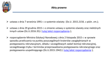 Akty prawne ustawa z dnia 7 września 1991 r. o systemie oświaty (Dz.U. 2015.2156. z późn. zm.); ustawa z dnia 29 grudnia 2015 r. o zmianie ustawy o systemie oświaty oraz niektórych innych ustaw (Dz.U.2016.35) ( tutaj tekst rozporządzenia ); rozporządzenie Ministra Edukacji Narodowej z dnia 2 listopada 2015 r. w sprawie sposobu przeliczania na punkty poszczególnych kryteriów uwzględnianych w postępowaniu rekrutacyjnym, składu i szczegółowych zadań komisji rekrutacyjnej, szczegółowego trybu i terminów przeprowadzania postępowania rekrutacyjnego oraz postępowania uzupełniającego (Dz.U.2015.1942) ( tutaj tekst rozporządzenia ); Akty prawa miejscowego UCHWAŁA NR 727/14 RADY MIASTA TORUNIA z dnia 20 marca 2014 r. w sprawie składania wniosku o przyjęcie dziecka do publicznych przedszkoli oraz oddziałów przedszkolnych w szkołach podstawowych, dla których organem prowadzącym jest Gmina Miasta Toruń ( tutaj tekst uchwały ) UCHWAŁA NR 54/15 RADY MIASTA TORUNIA z dnia 26 marca 2015 r. w sprawie określenia kryteriów rekrutacji do przedszkoli i oddziałów przedszkolnych w szkołach podstawowych prowadzonych przez Gminę Miasta Toruń, które będą brane pod uwagę na drugim etapie postępowania rekrutacyjnego, określenia liczby punktów za każde z tych kryteriów oraz dokumentów niezbędnych do ich potwierdzania ( tutaj tekst uchwały ) UCHWAŁA NR 233/16 RADY MIASTA Torunia z dnia 21 stycznia 2016 r. w sprawie określenia kryteriów w postępowaniu rekrutacyjnym do szkół podstawowych oraz gimnazjów dla kandydatów zamieszkałych poza obwodem szkoły, liczby punktów za te kryteria oraz dokumentów niezbędnych do ich potwierdzenia ( tutaj tekst uchwały ) ZARZĄDZENIE NR 12 PREZYDENTA MIASTA TORUNIA Z DNIA 27.01.2016 r. w sprawie terminów postepowania rekrutacyjnego oraz postępowania uzupełniającego, a także terminów składania dokumentów do przedszkoli oraz klas pierwszych szkół podstawowych w roku szkolnym 2016/2017 ( tutaj tekst zarządzenia ) Zmiany systemowe w zakresie organizacji wychowania przedszkolnego Ze zmian wynika, iż od roku szkolnego 2016/2017: obowiązek rocznego przygotowania przedszkolnego ma dziecko w wieku 6-lat (dotychczas były to dzieci 5-letnie); prawo do korzystania z wychowania przedszkolnego w przedszkolu lub innej formie wychowania przedszkolnego ma dziecko w wieku 4-5 lat, a od września 2017 r. również dziecko w wieku 3 lat (w bieżącym roku szkolnym dzieci 4 – letnie); obowiązek szkolny rozpoczyna dziecko w wieku 7 lat (w bieżącym roku szkolnym dziecko 6letnie); prawo do rozpoczęcia obowiązku szkolnego ma dziecko w wieku 6 lat, pod warunkiem: korzystania z wychowania przedszkolnego w roku szkolnym poprzedzającym rok szkolny, w którym ma rozpocząć naukę w szkole podstawowej albo posiadania opinii o możliwości rozpoczęcia nauki w szkole podstawowej, wydanej przez poradnię psychologiczno-pedagogiczną. Zmiany systemowe w zakresie organizacji szkół podstawowych Ze zmian wynika, iż: obowiązek szkolny rozpoczyna dziecko w wieku 7 lat (w bieżącym roku szkolnym dziecko 6-letnie); prawo do rozpoczęcia obowiązku szkolnego ma dziecko w wieku 6 lat, pod warunkiem: korzystania z wychowania przedszkolnego w roku szkolnym poprzedzającym rok szkolny, w którym ma rozpocząć naukę w szkole podstawowej albo posiadania opinii o możliwości rozpoczęcia nauki w szkole podstawowej, wydanej przez poradnię psychologiczno-pedagogiczną; dzieci, urodzone w roku 2009, które rozpoczęły naukę w klasie I szkoły podstawowej, na wniosek rodziców złożony do 31 marca 2016 r., mogą w roku szkolnym 2016/2017 kontynuować naukę w klasie I szkoły podstawowej; dzieci urodzone w I połowie 2008 r., które w roku szkolnym 2015/2016 uczęszczają do klasy II szkoły podstawowej, na wniosek złożony w terminie do 31 marca 2016 r. , mogą w roku szkolnym 2016/2017 kontynuować naukę w klasie II szkoły podstawowej; dziecko, które w latach 2015/2016-2018/2019 realizowało obowiązkowe roczne wychowanie przedszkolne w oddziale przedszkolnym w szkole podstawowej innej niż szkoła, w obwodzie której dziecko mieszka, na wniosek rodziców jest przyjmowane do klasy I tej szkoły podstawowej bez przeprowadzania postępowania rekrutacyjnego, z zastrzeżeniem o którym mowa poniżej; dzieciom, które w roku szkolnym 2016/2017 rozpoczną naukę w klasie I szkoły podstawowej, Prezydent do dnia 15 czerwca 2016 r., może wskazać jako miejsce realizacji obowiązku szkolnego szkołę podstawową inną niż szkoła, w obwodzie której dziecko mieszka, przy czym tego przepisu nie stosuje się, gdy spodziewana liczba uczniów w miastach powyżej 5 tys. mieszkańców przekracza 11. Kryteria rekrutacji do przedszkoli i oddziałów przedszkolnych dla dzieci zamieszkałych w Toruniu (uchwała Nr 54/2015 RMT) 1) zamieszkanie w Toruniu i rozliczanie podatku dochodowego od osób fizycznych w urzędzie skarbowym w Toruniu przez oboje rodziców lub rodzica samotnie wychowującego dziecko - 64 punkty; 2) zatrudnienie lub pobieranie nauki w trybie stacjonarnym przez oboje rodziców lub rodzica samotnie wychowującego dziecko - 32 punkty; 3) ubieganie się o przyjęcie dziecka do przedszkola zlokalizowanego najbliżej miejsca zamieszkania lub miejsca pracy jednego z rodziców - 16 punktów; 4) kontynuowanie edukacji przez rodzeństwo dziecka albo ukończenie przez rodzeństwo dziecka edukacji przedszkolnej w poprzednim roku szkolnym w przedszkolu, o przyjęcie do którego ubiega się dziecko - 8 punktów; 5) zadeklarowanie przez rodziców dziecka chęci korzystania z pełnej oferty przedszkola, przez co najmniej 8 godzin dziennie - 4 punkty; 6) uczęszczanie rodzeństwa dziecka do zlokalizowanej w pobliżu przedszkola szkoły lub żłobka – 2 punkty. Terminy postępowania rekrutacyjnego oraz terminy postępowania uzupełniającego a także terminy składania dokumentów do przedszkoli Terminy wynikające z zarządzenia Nr 12Prezydenta Mi