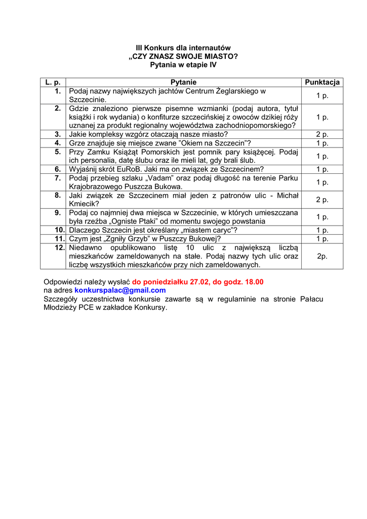 III Konkurs dla internautów „CZY ZNASZ SWOJE MIASTO? Pytania w etapie IV L. p. 1. Pytanie Punktacja Podaj nazwy największych jachtów Centrum Żeglarskiego w 1 p. Szczecinie. 2. Gdzie znaleziono pierwsze pisemne wzmianki (podaj autora, tytuł książki i rok wydania) o konfiturze szczecińskiej z owoców dzikiej róży 1 p. uznanej za produkt regionalny województwa zachodniopomorskiego? 3. Jakie kompleksy wzgórz otaczają nasze miasto? 2 p. 4. Grze znajduje się miejsce zwane ”Okiem na Szczecin”? 1 p. 5. Przy Zamku Książąt Pomorskich jest pomnik pary książęcej. Podaj 1 p. ich personalia, datę ślubu oraz ile mieli lat, gdy brali ślub. 6. Wyjaśnij skrót EuRoB. Jaki ma on związek ze Szczecinem? 1 p. 7. Podaj przebieg szlaku „Vadam” oraz podaj długość na terenie Parku 1 p. Krajobrazowego Puszcza Bukowa. 8. Jaki związek ze Szczecinem miał jeden z patronów ulic - Michał 2 p. Kmiecik? 9. Podaj co najmniej dwa miejsca w Szczecinie, w których umieszczana 1 p. była rzeźba „Ogniste Ptaki” od momentu swojego powstania 10. Dlaczego Szczecin jest określany „miastem caryc”? 1 p. 11. Czym jest „Zgniły Grzyb” w Puszczy Bukowej? 1 p. 12. Niedawno opublikowano listę 10 ulic z największą liczbą mieszkańców zameldowanych na stałe. Podaj nazwy tych ulic oraz 2p. liczbę wszystkich mieszkańców przy nich zameldowanych. Odpowiedzi należy wysłać do poniedziałku 27.02, do godz. 18.00 na adres [email protected] Szczegóły uczestnictwa konkursie zawarte są w regulaminie na stronie Pałacu Młodzieży PCE w zakładce Konkursy.